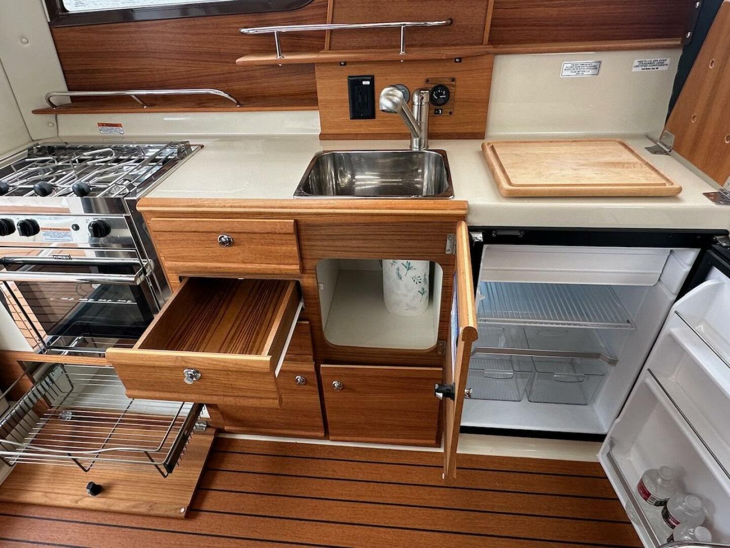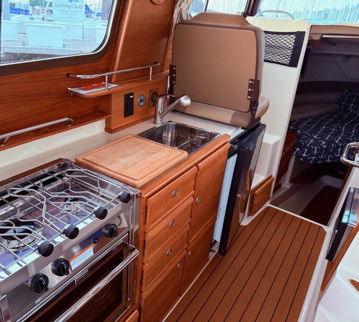 - Seating – Bench seat for two adults; when the backrest is moved forward it becomes half of the salon table seating. The settee can be raised up and down several inches, as well as forward and back. There is also a single seat to Port, above the Galley counter, which can be folded forward when not needed.