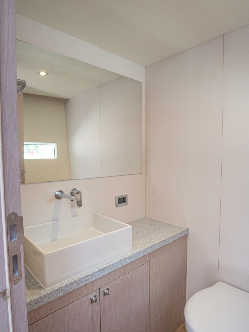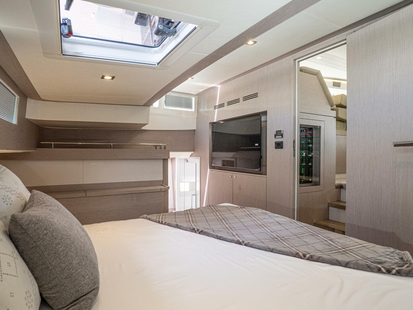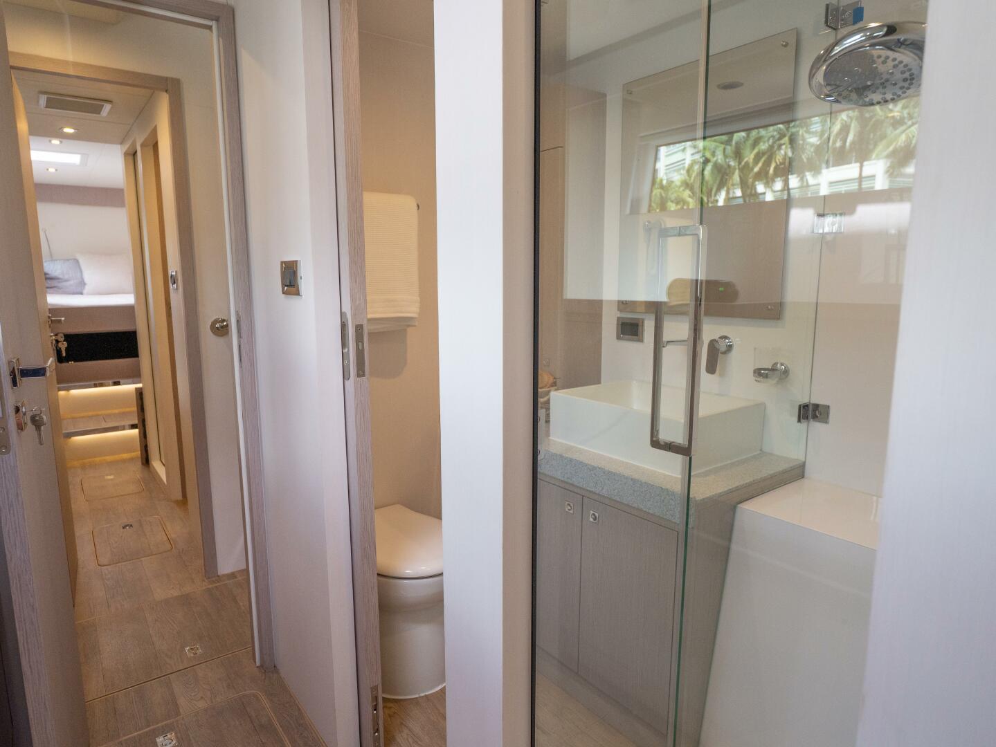 The forward, full-beam master suite is a true owner’s retreat, designed for privacy, comfort, and breathtaking views. With its elevated position on the main deck and ensuite located just three steps down in the port hull, it combines luxury living with smart use of space.