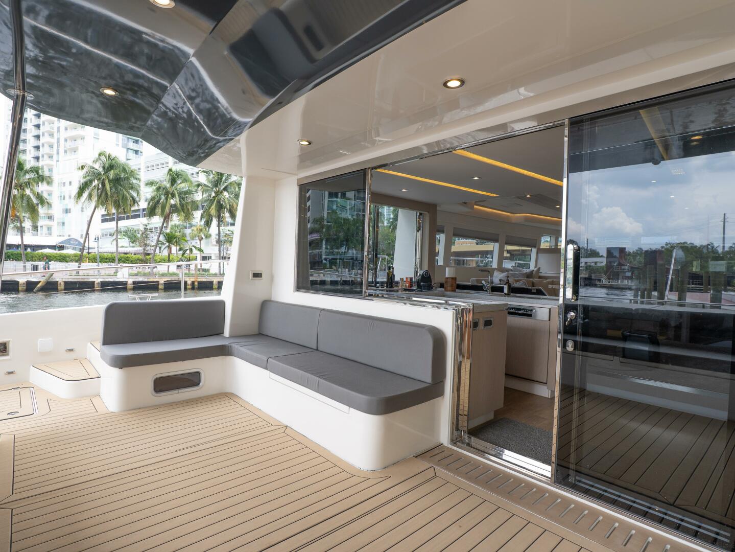 The aft cockpit of the Ocean Eco 54 is designed as a true outdoor living room, seamlessly connecting to the galley and salon through wide sliding glass doors. Aft-facing settees with plush cushions line both port and starboard sides, providing shaded lounging under the extended hardtop.