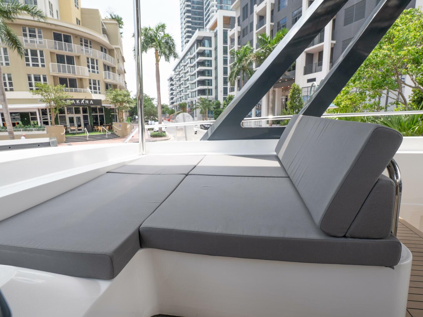 - Expansive Seating – A full wraparound lounge lines the aft and port side, providing abundant seating for family and friends. A convertible backrest allows flexibility between sunbathing and upright seating. The area easily accommodates a cocktail or dining table, making it ideal for casual meals or evening cocktails under the hardtop.