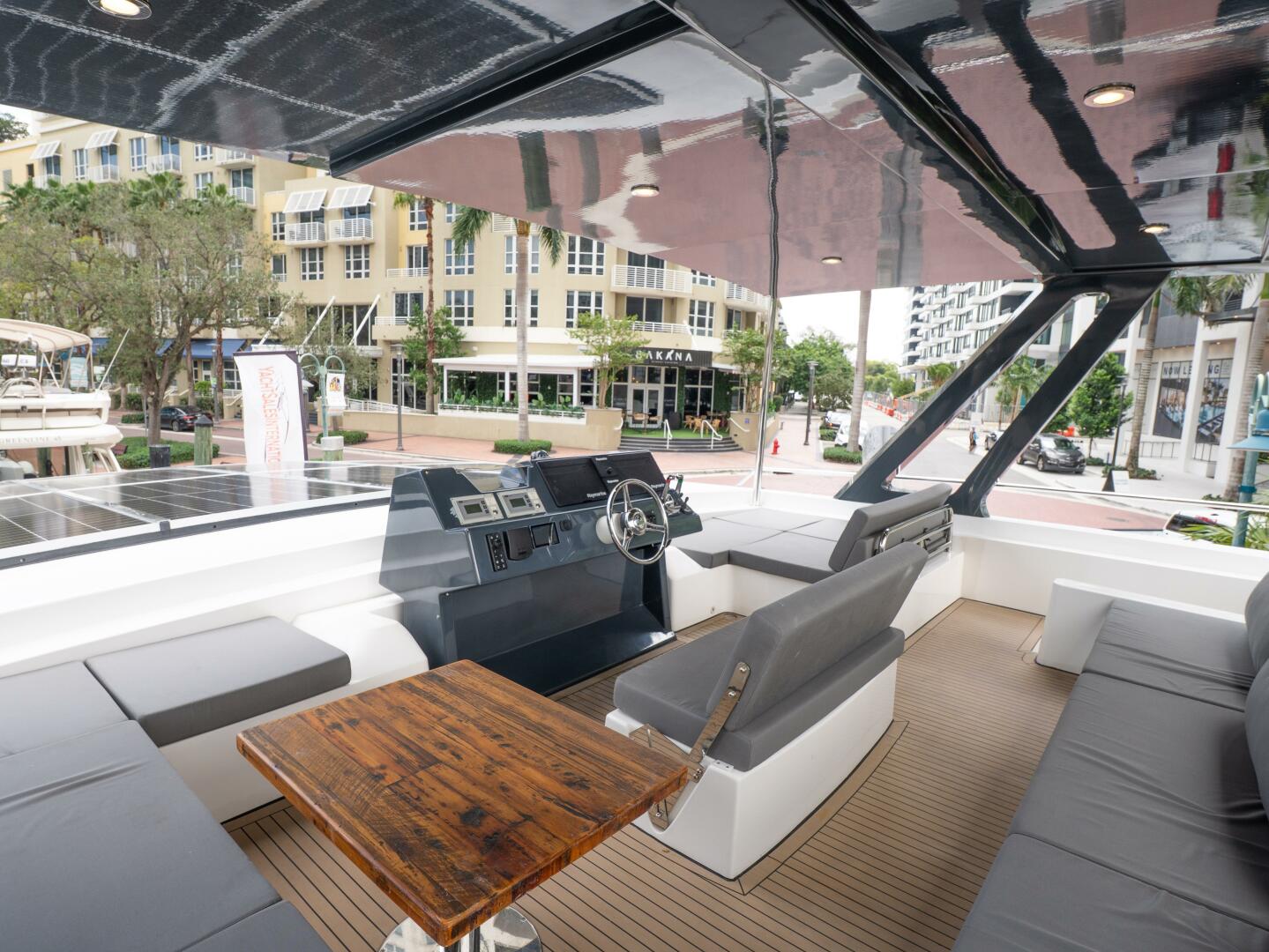 - Central Helm Station – Positioned at the heart of the flybridge, the helm provides excellent sightlines in all directions. Outfitted with Raymarine multifunction displays, joystick controls, and navigation electronics, the setup gives the captain confidence while keeping them connected to guests.