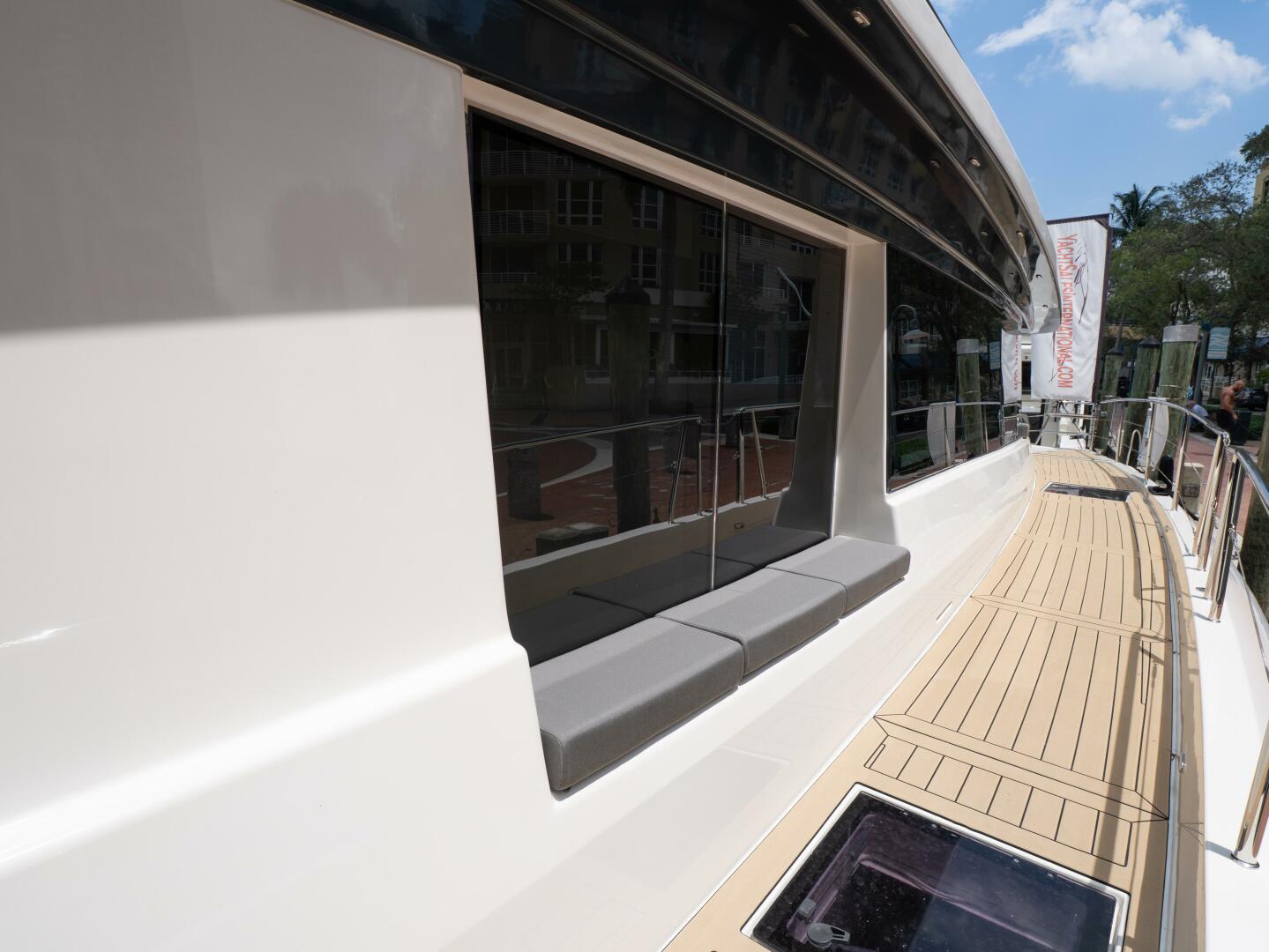 - Side Benches – Both port and starboard feature integrated bench seating along the salon windows and recessed into the superstructure, perfect for a shaded retreat or casual conversation while under way.