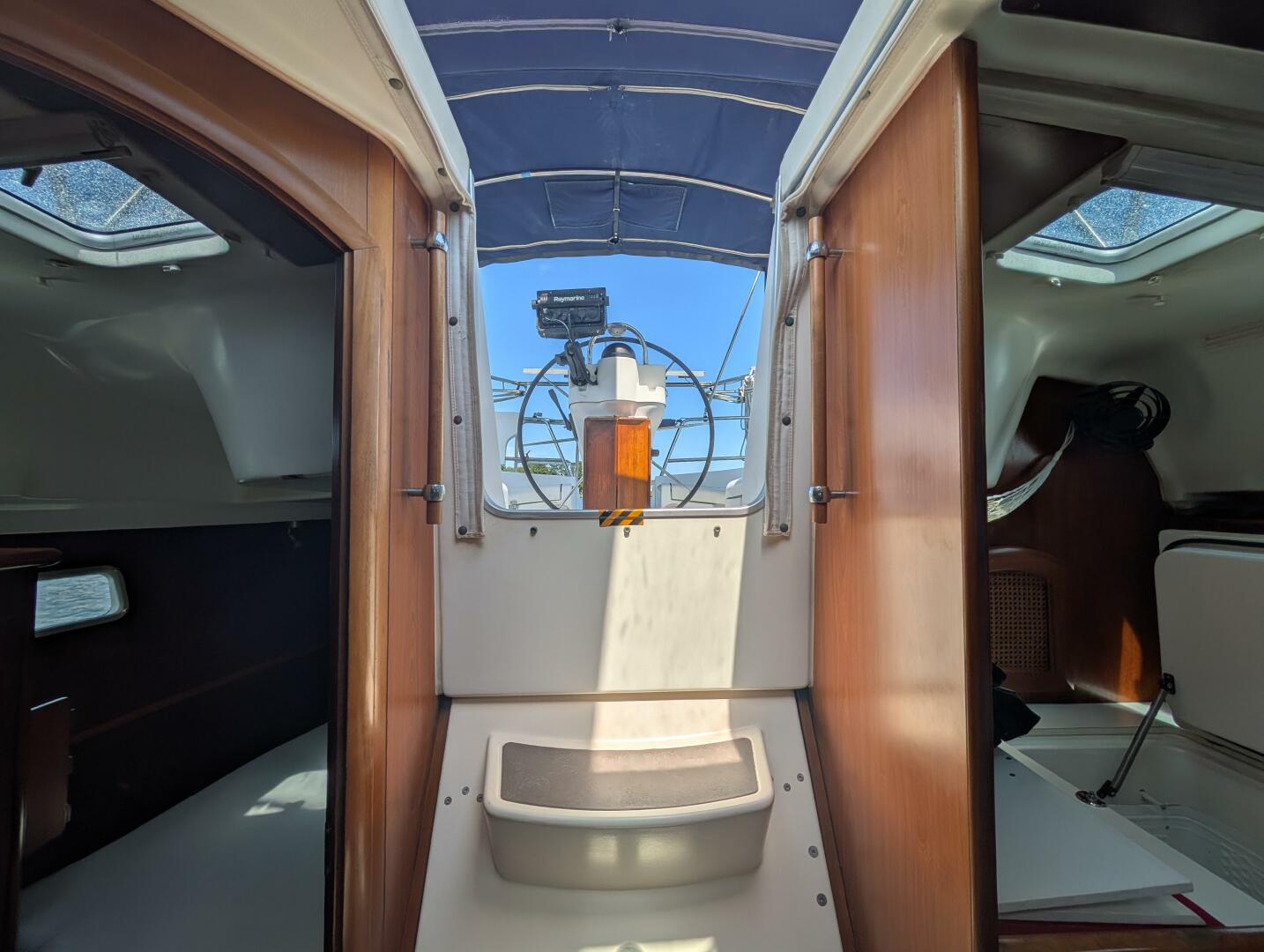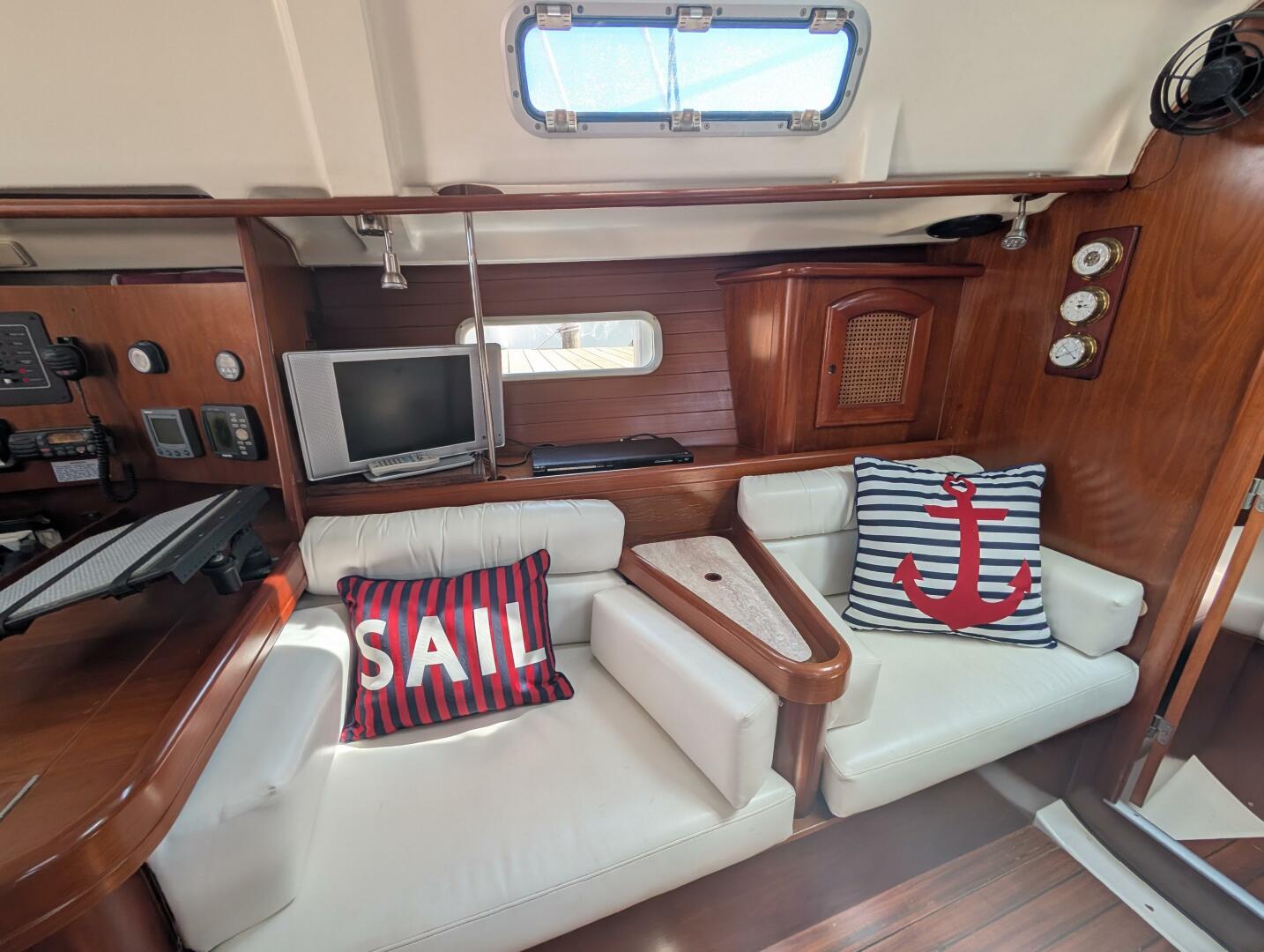 - Dinette with curved settee located to starboard, forward of head. Table lowers to create extra double berth, or raises out of the way to create open seating across the salon