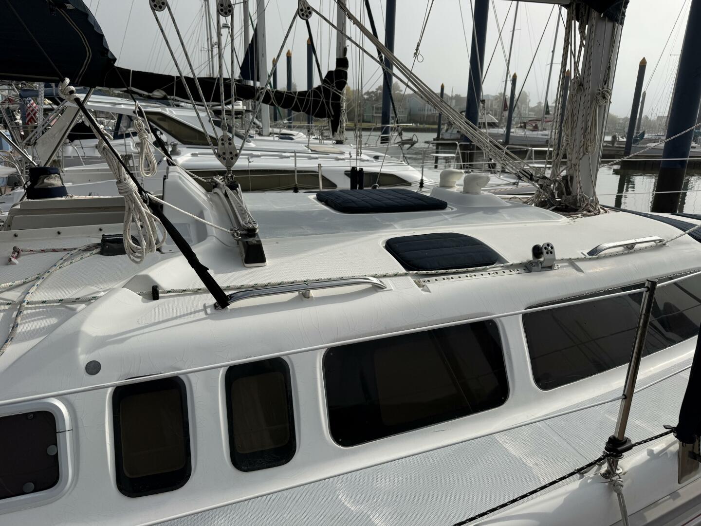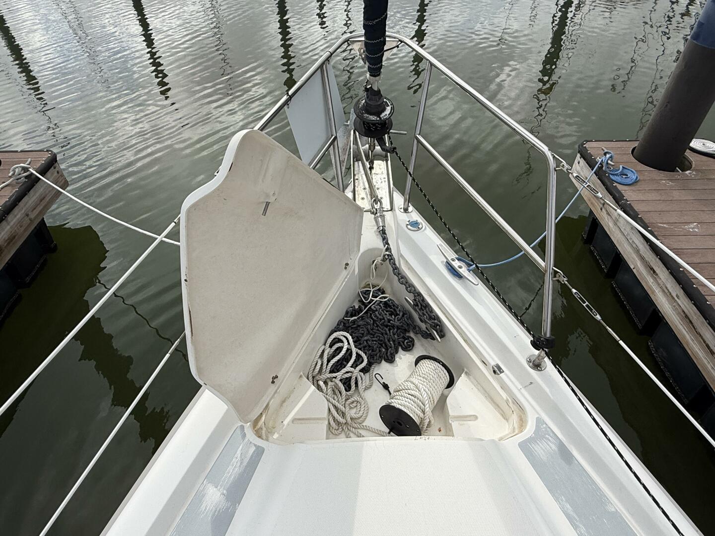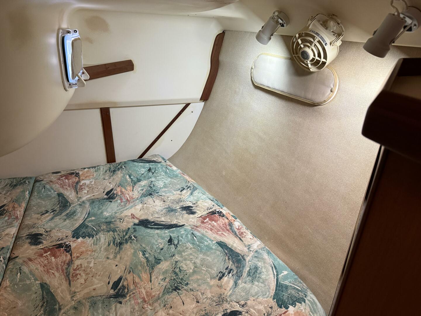 - Forward cabin has a Vee-berth, lockers and storage bins opening deck hatch, reading lights