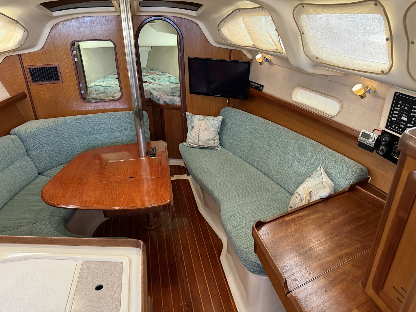 - Salon with a u-shaped dinette to port & one drop leaf on the table, straight settee to starboard. Opening and fixed hatches and portlights allow in lots of natural light as well as fresh air.