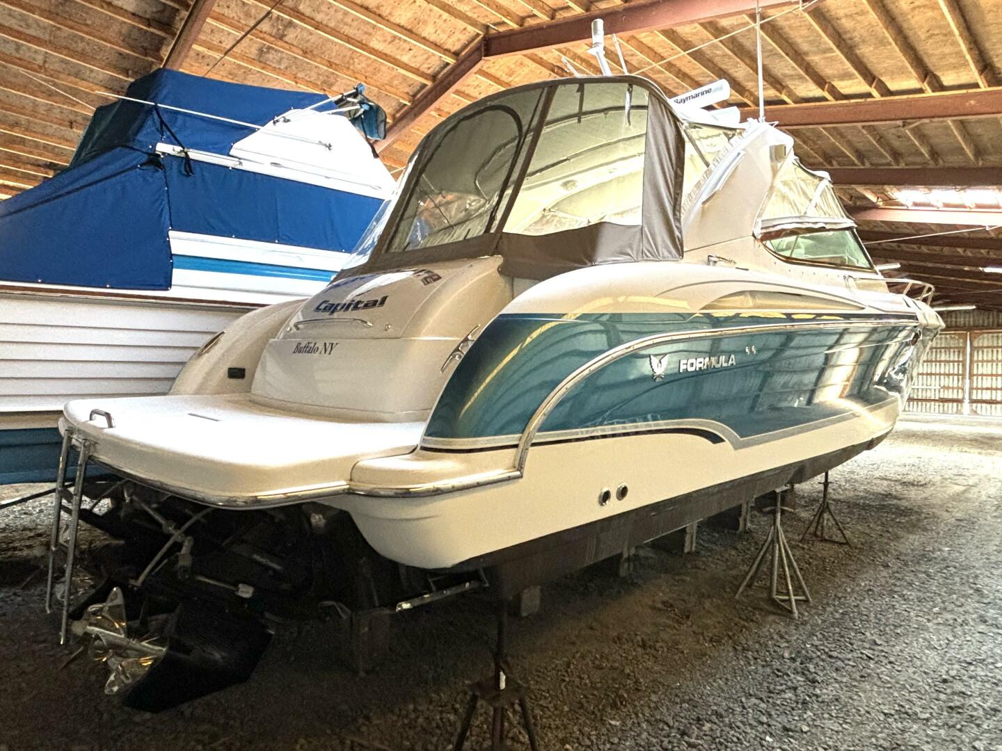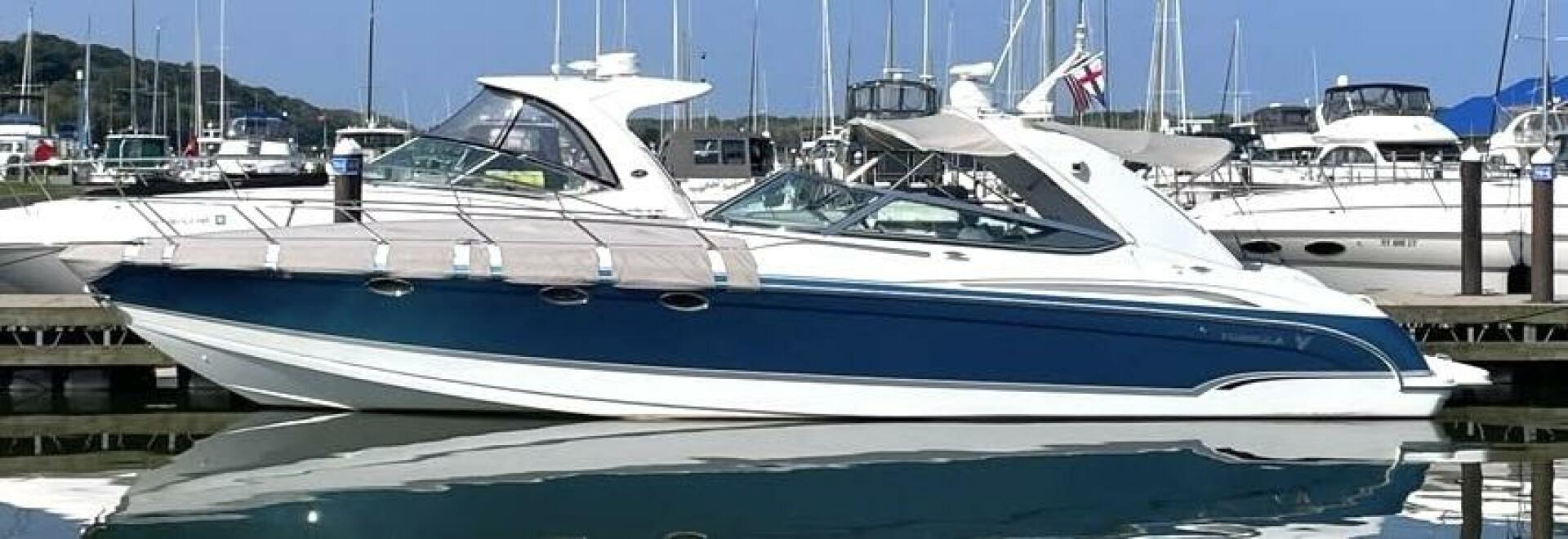You will be hard pressed to find a cleaner and nicer Formula 400 SS than this one right here! From the mirror like finish on the flagship Gulfstream Metallic hull, to the absolutely spotless interior, this vessel shows unbelievable well and pride of ownership certainly shines through. Not only is she impeccably maintained, but she is also loaded from the factory and outfitted with a number of nice upgrades from the owner. Starting in the cockpit, you will find plenty of space for entertaining, along with a u-shaped aft lounge seat, 2 dual-height tables, sun pad inserts, and a wet bar area including a new Isotherm refrigerator. There is also plenty of storage space and countertop space, along with access to stereo controls and the transom shower. Make your way up to the helm where you will find a massive twin command seat along with all of your master controls, including your Smartcraft SC5000 system, Raymarine 120E Chartplotter with Radar and Autopilot, bow thruster, and Fusion stereo controls. Additional passenger and co-pilot bench seating available portside. The entire cockpit is fully enclosed in excellent condition and recently upgraded heavy duty canvas and isinglass. When you enter the cabin, you will find a spacious and open concept salon/galley, fully equipped with refrigerator/freezer, electric stove, microwave, cherry high-gloss cabinetry and Corian countertops. Curved Ultraleather sofa seating with dual-height solid Corian dining tables and filler cushions, along with an entertainment center round out the salon. Aft cabin you will find wonderful sleeping arrangements in the queen-size berth stateroom with privacy curtain, night stand, TV, cedar lined closet and direct access to the full head with shower. Additional features to round out the package include heat and A/C, Kohler generator, central vac, full bow cover, and the bulletproof and powerful twin Mercruiser 496 MAG HO engines, pumping out 425HP each! Two new Bravo 3 X outdrives and polished stainless steel Hill Marine props were installed back in 2024, so feel confident in this low hour, fresh water, impressively maintained beauty!