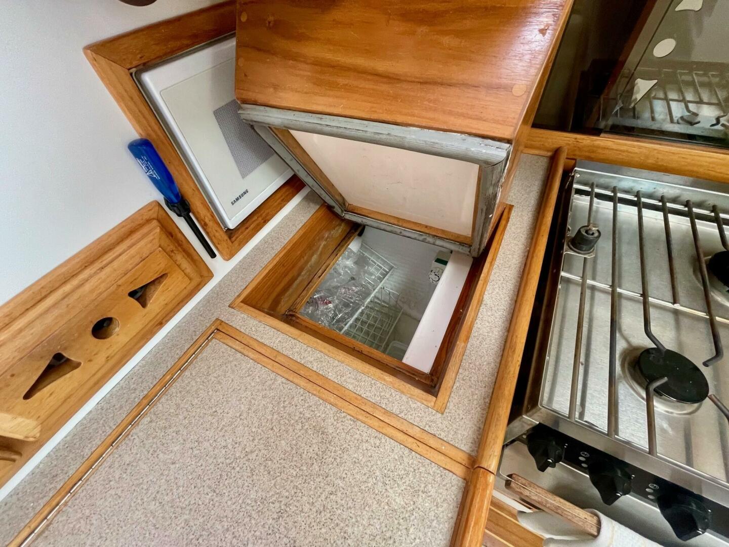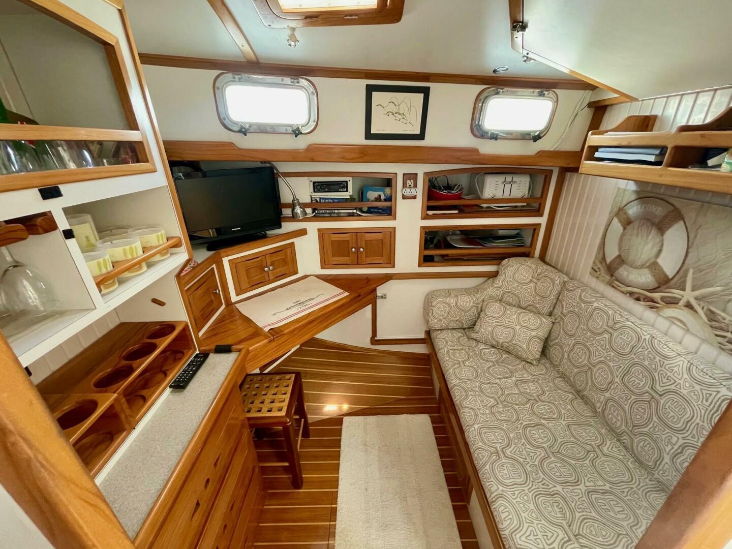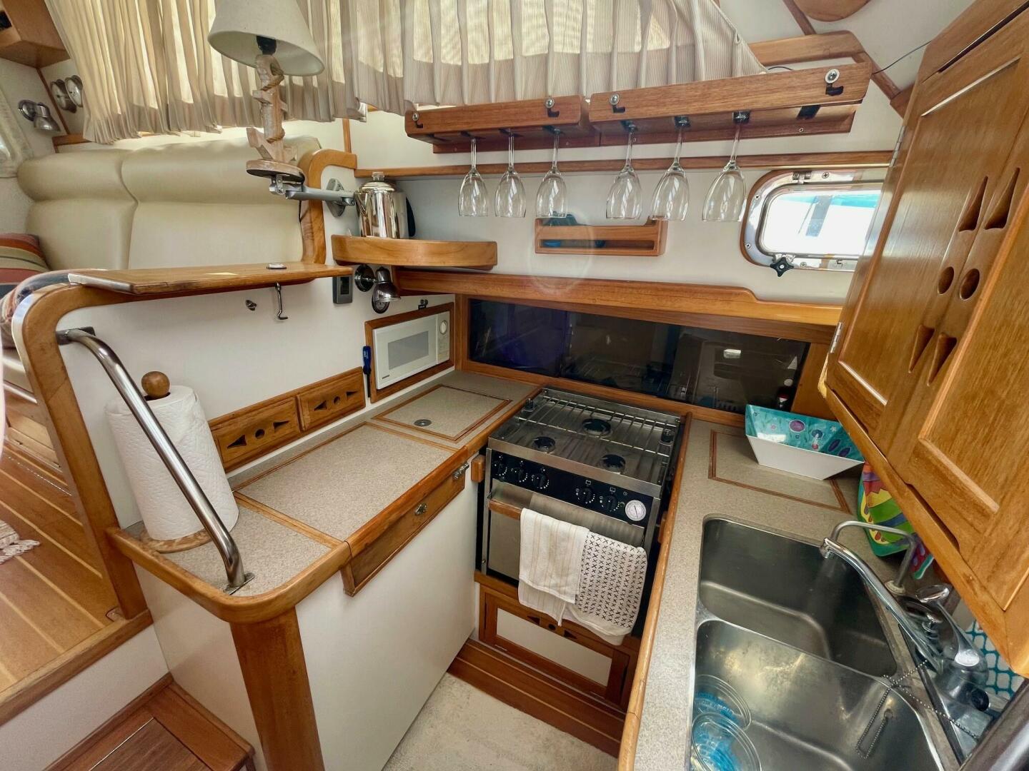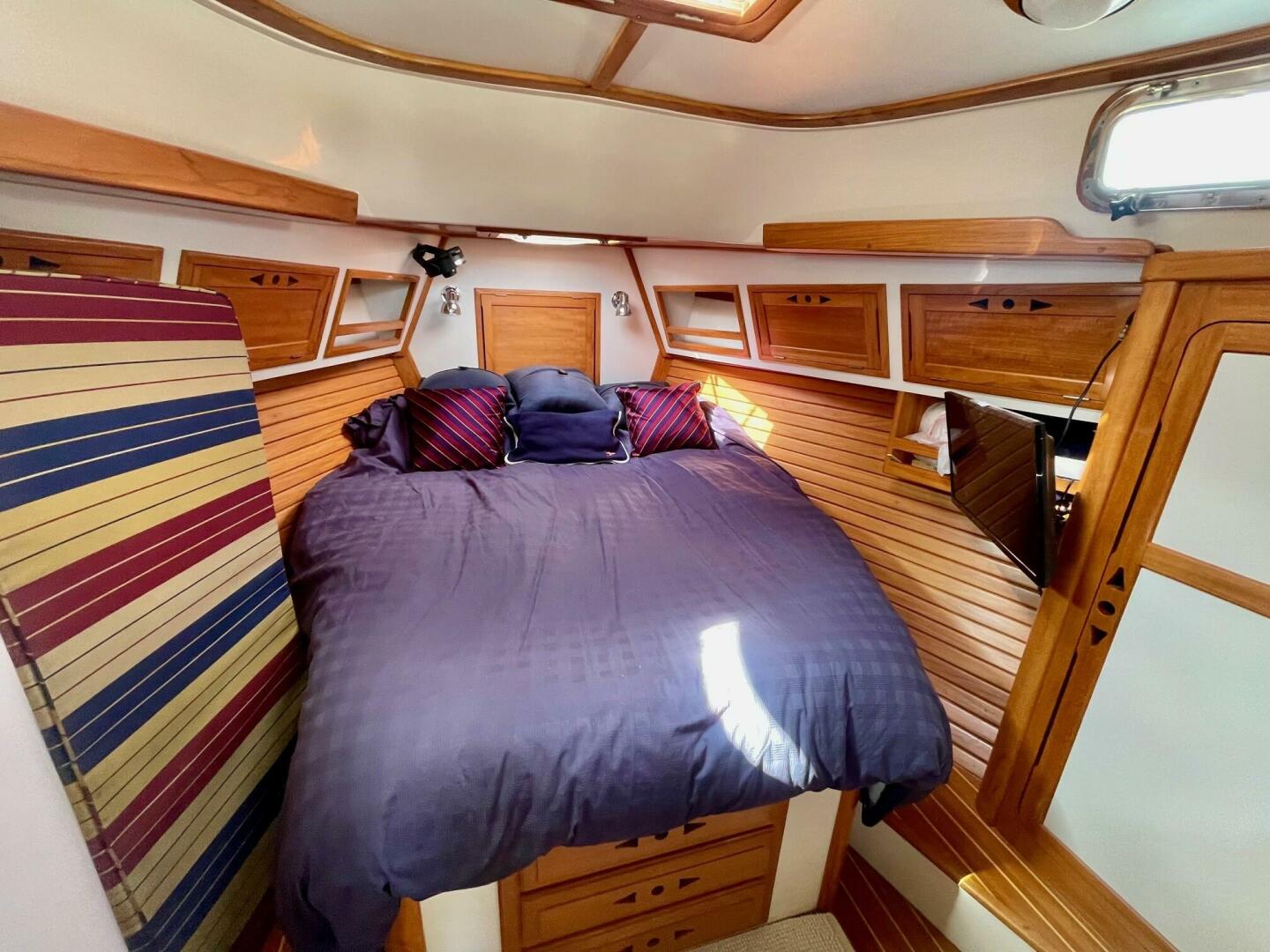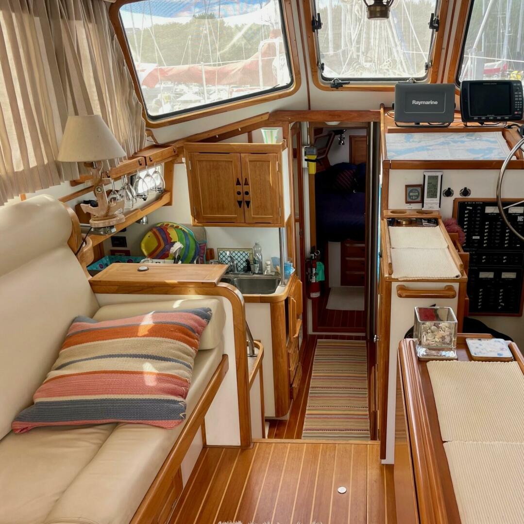 The accommodations are particularly well-suited for liveaboard cruising. Most models feature a forward master stateroom with a centerline queen berth, often with a hydraulic lift to access storage underneath. A second cabin, typically midship, can serve as a guest stateroom, home office, or additional storage area. The galley is well-appointed and secure for cooking underway, while the spacious saloon offers comfortable seating, ample storage, and a warm, inviting atmosphere thanks to extensive teak joinery finished in a rich satin varnish.