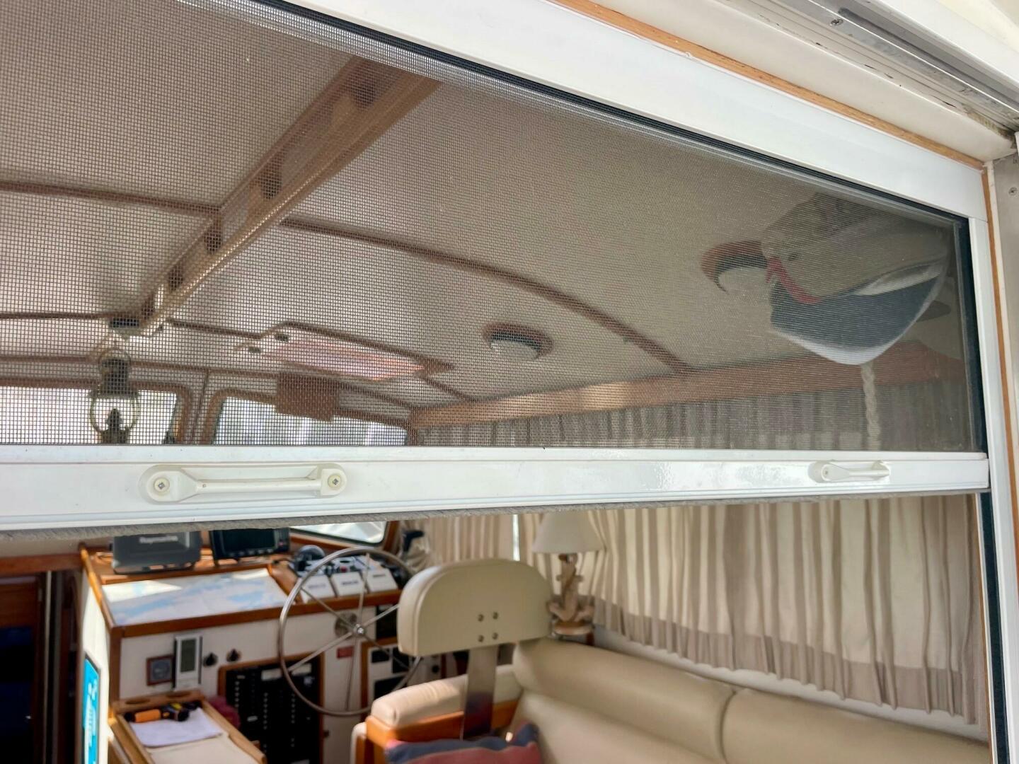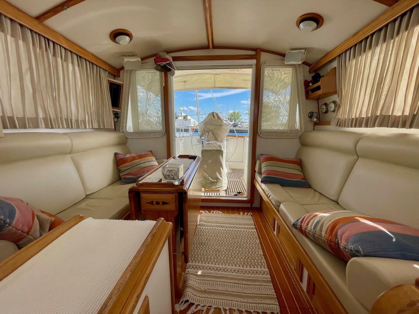 - In the main salon the dining table sits midship between the two large settees. The settees and helm seat have all been reupholstered in a soft cream leather. A custom sliding screen spans the entire entrance to the main salon, giving great ventilation and protection from the bugs at dusk.