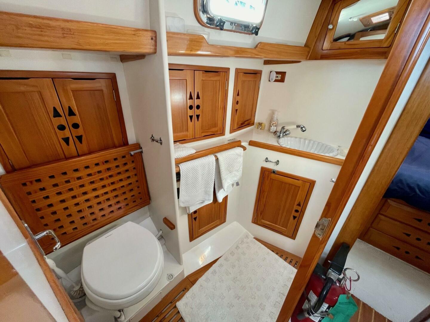 - Forward on Calypso is an island double bunk in the owners' cabin. There are gas cylinders that lift the forward bunk upward to provide enormous storage space under and it is very easy to lift and close. A large hanging locker, a linen locker, , open lockers, bookshelves and special drawers provide exceptional storage in the forward cabin. This cabin has teak ceilings and a cedar hanging locker. There is a large head with ceramic shell sink, custom lockers head and dual entrance to the owners' stateroom as well as a separate entrance to the rest of the boat. A new electric toilet with waste tank monitor were recently installed