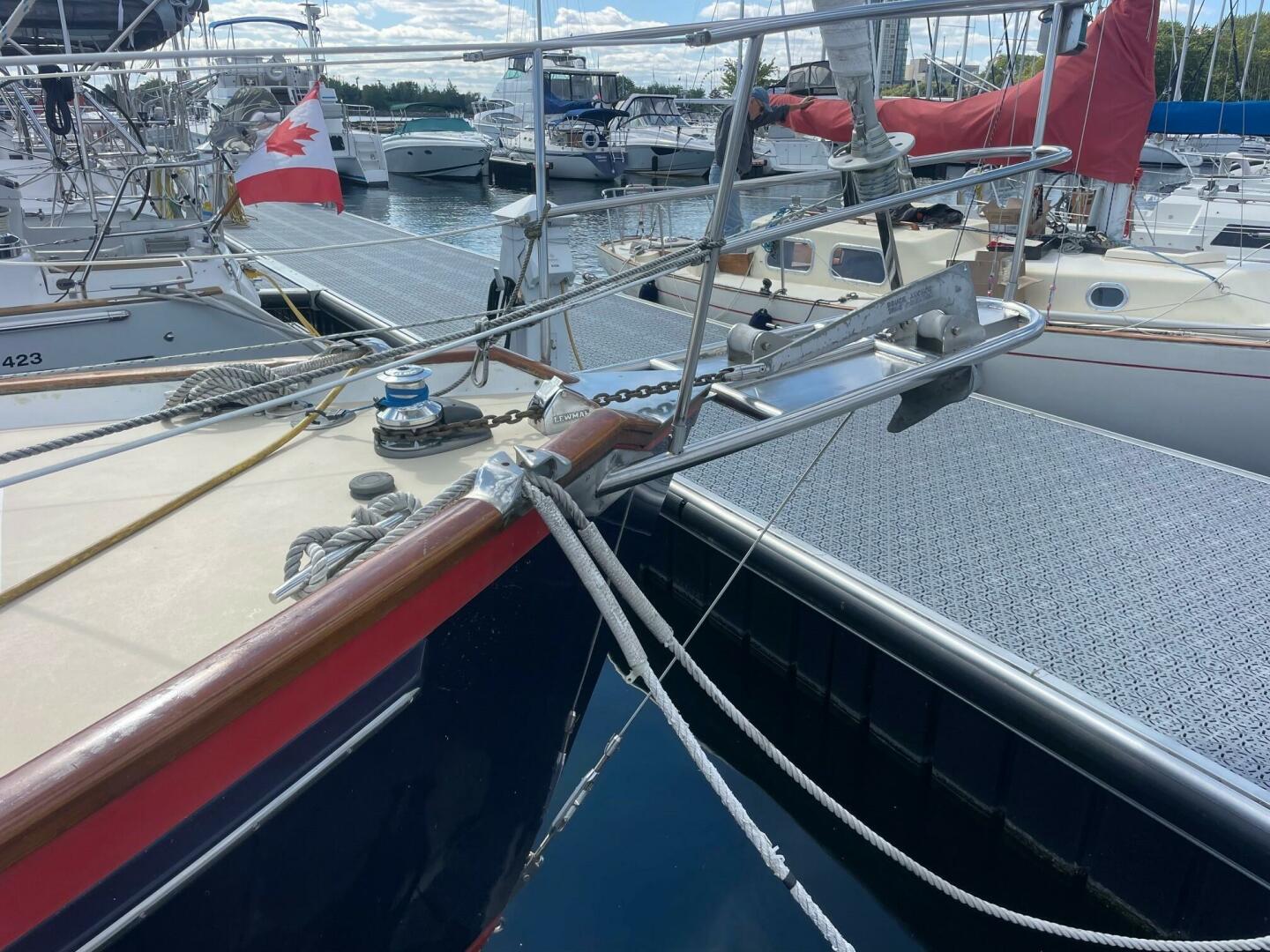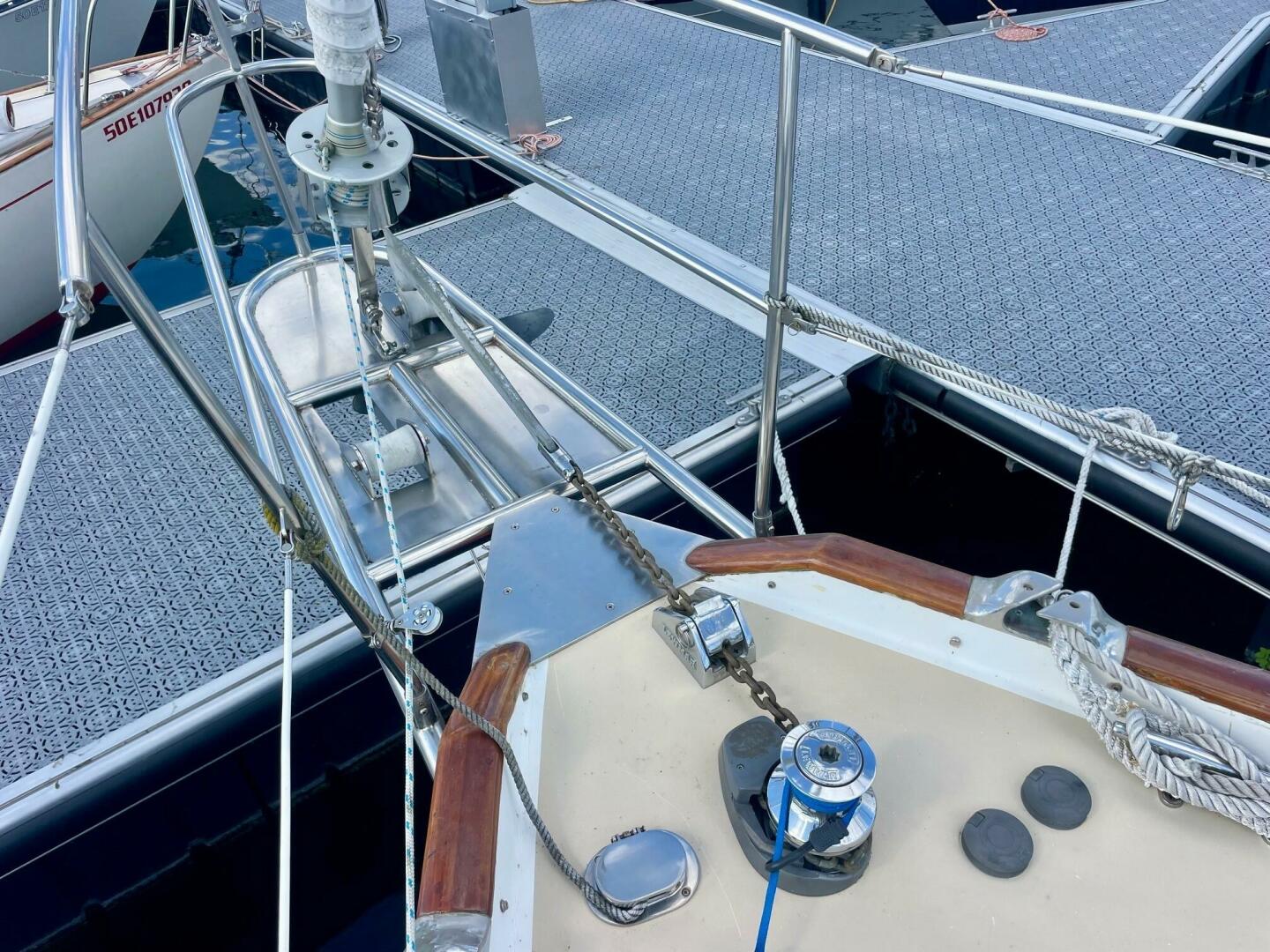 - Bow pulpit on bowsprit with dual rollers for two anchors