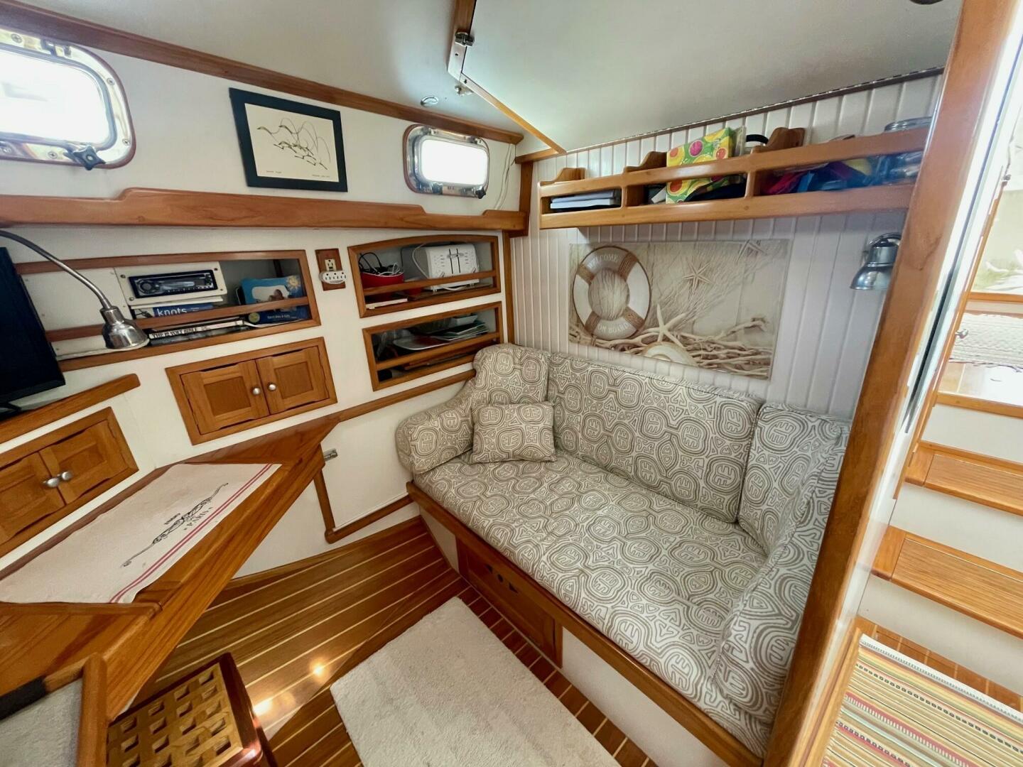 - The library/den features a love seat that can be made up into a very large single for that extra bunk. There is a writing desk, special cabinets and a standing liquor locker with wine glasses, tumblers and a large book storage above. A new flat screen TV is included for those rainy movie nights. The library/den is the signature of the Northeast 400 and Calypso has a very attractive and well thought out plan.