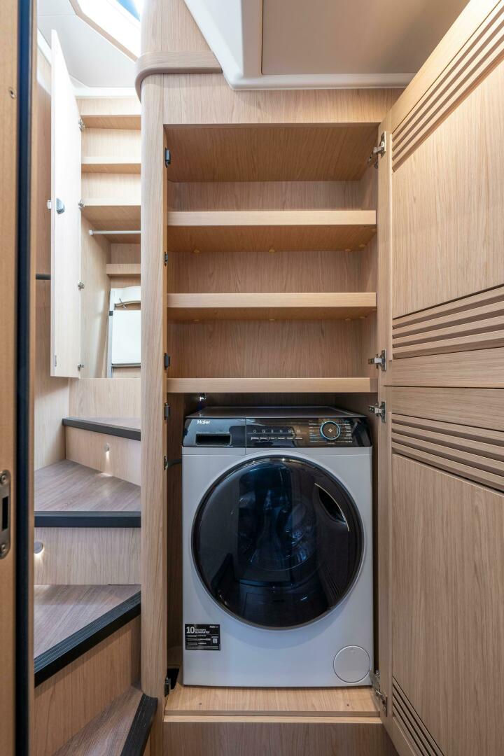 Start your day with a coffee on the flybridge as the sun rises, then chart your course from one of two helm stations. Evenings are for cocktails on the aft deck, music in the salon, and restful nights in the quiet comfort of the owner’s stateroom. Equipped with a Fusion sound system, climate control, wine fridge, dishwasher, and a washer/dryer, you’ll cruise without compromise.
