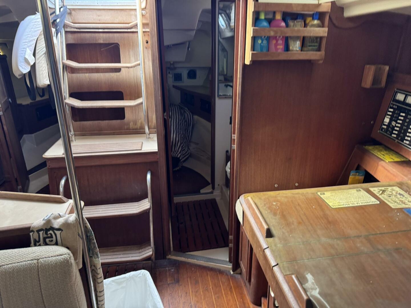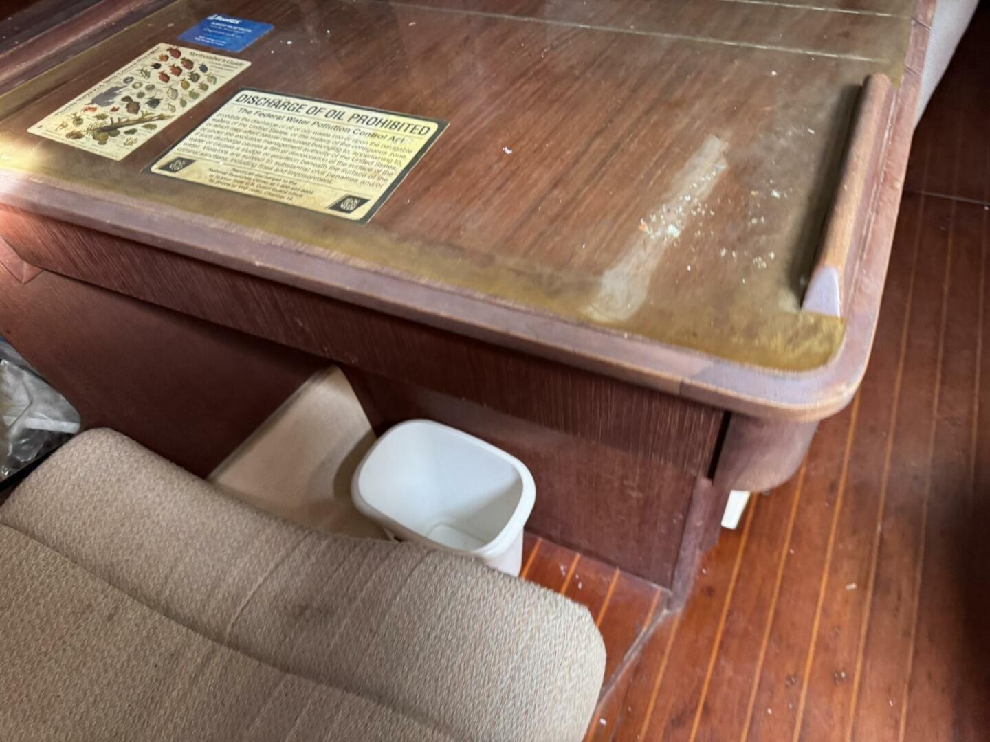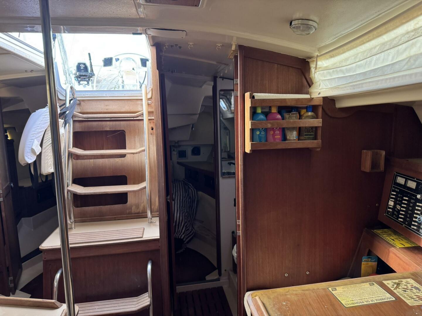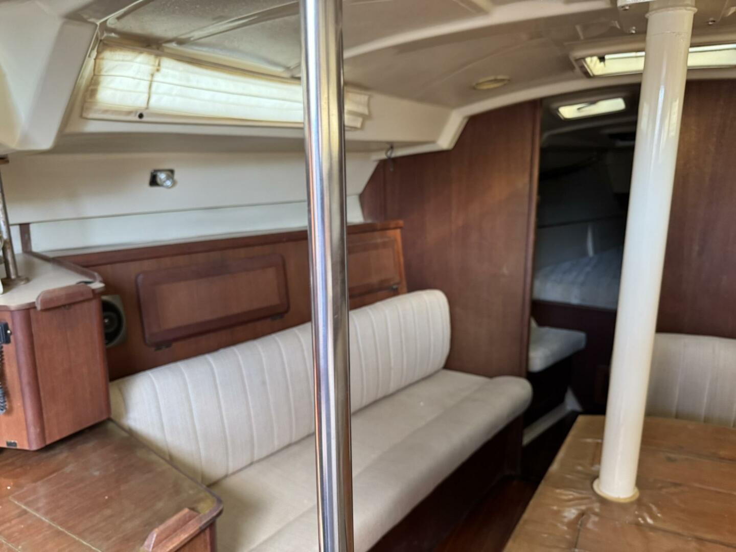 Bright salon with dining to port and settee to starboard; navigation desk aft.