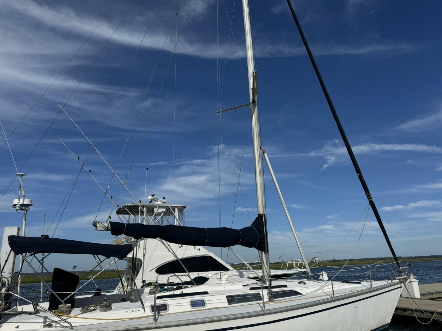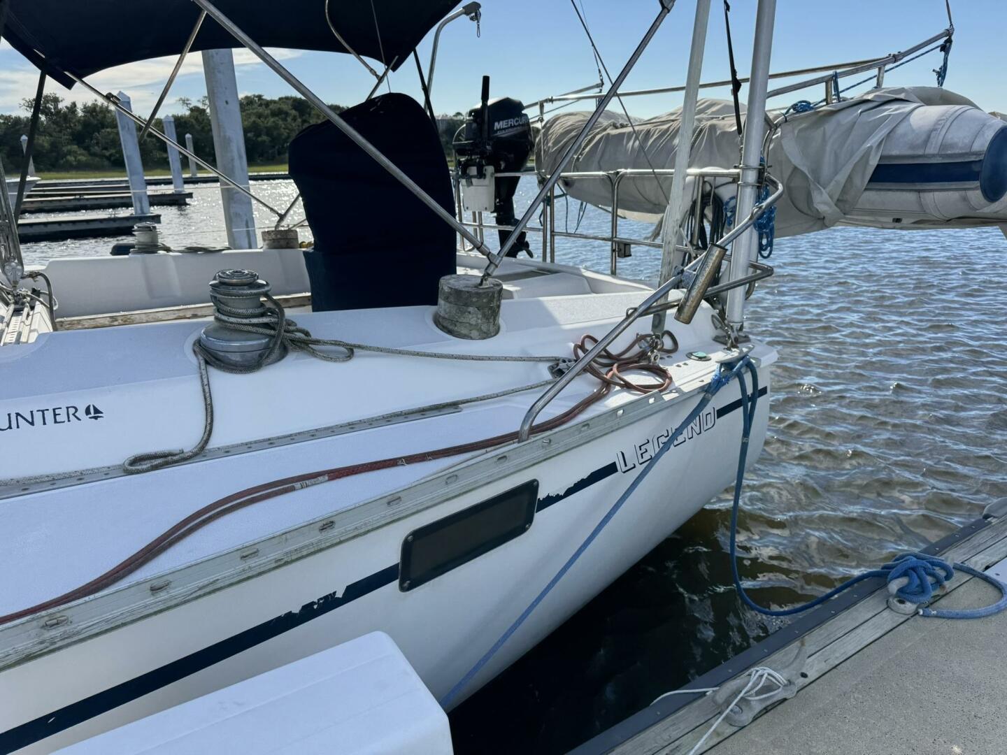 Repowered 1989 Hunter 40 Legend “Nepenthean”: Yanmar 54‑hp (2015, ~602 hrs), two cabins/two heads, Garmin chartplotter with radar, autopilot, Bimini, cockpit cushions, rail‑mounted grill, 10' Mercury dinghy with 9.9‑hp outboard, dehumidifier, safety gear, spares—cruise‑ready.