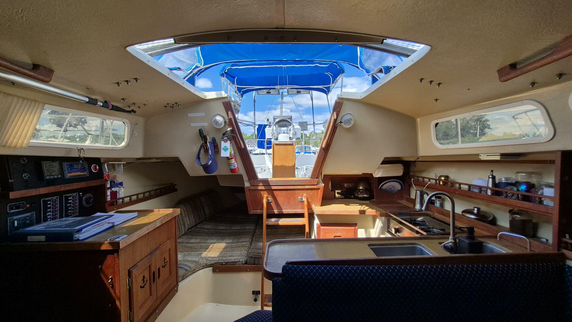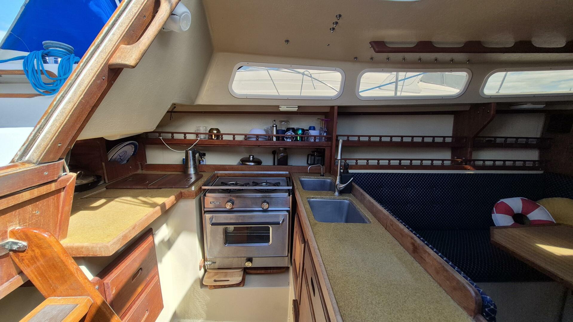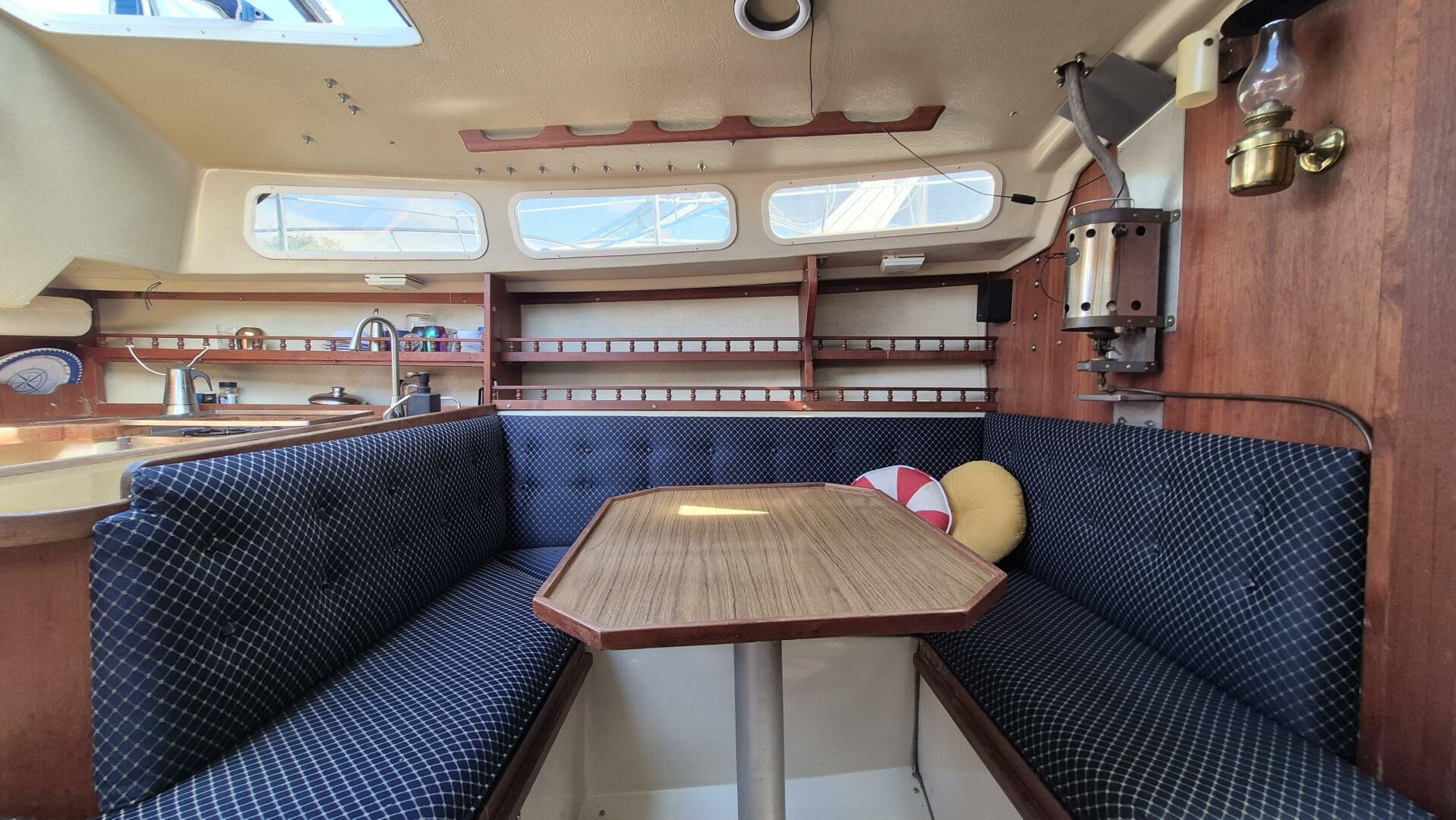 Step below and you'll find a bright, comfortable interior that sleeps five, with a forward V-berth, private head, roomy salon, and quarter berth. The galley features a pressurized alcohol stove and oven in excellent condition, twin sinks, and an electric freshwater pump for added convenience. All cushions were replaced in 2022 and LED lighting brightens the entire cabin. A Force 10 heater keeps things cozy for early spring and late fall sailing. While the original bimini and dodger remain serviceable, a canvas refresh could easily elevate her look.
