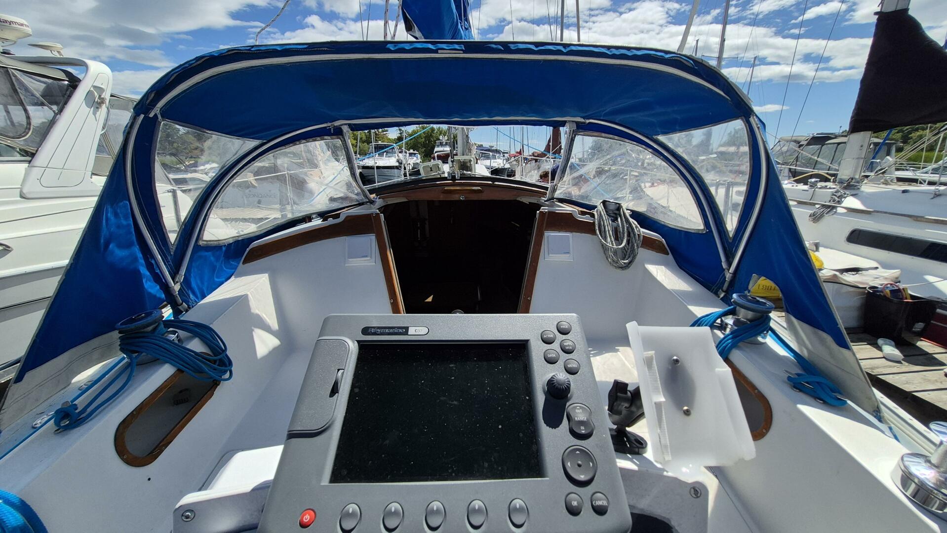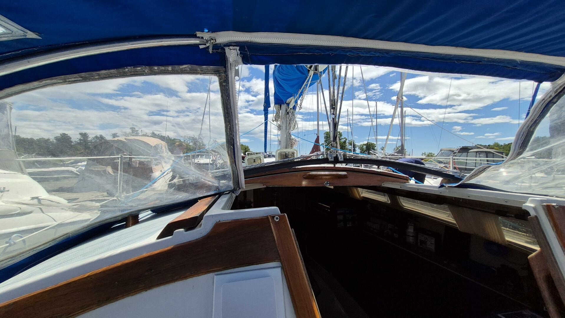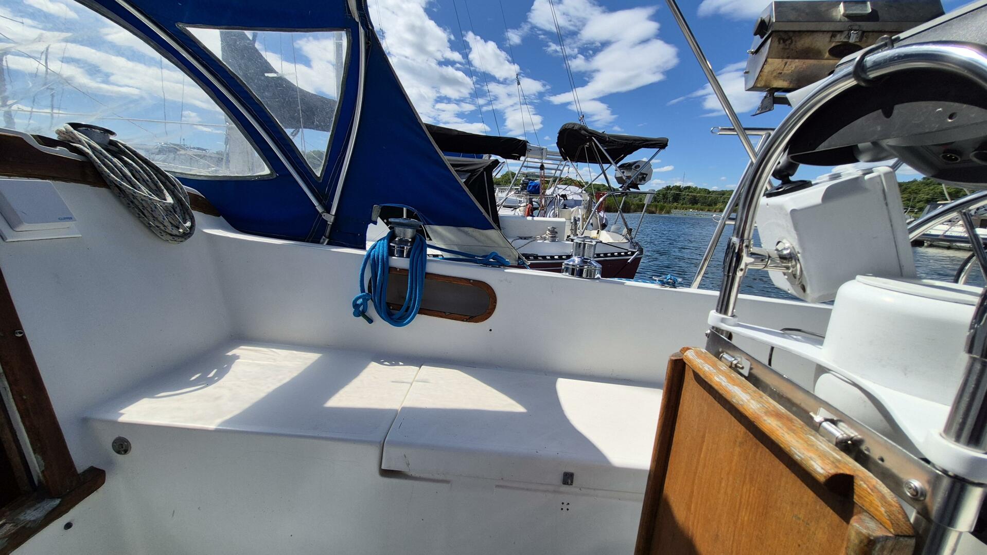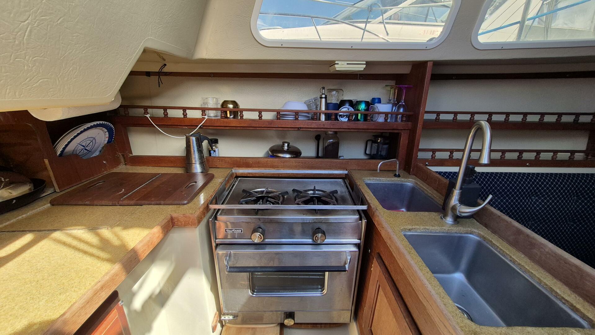 Step below and you'll find a bright, comfortable interior that sleeps five, with a forward V-berth, private head, roomy salon, and quarter berth. The galley features a pressurized alcohol stove and oven in excellent condition, twin sinks, and an electric freshwater pump for added convenience. All cushions were replaced in 2022 and LED lighting brightens the entire cabin. A Force 10 heater keeps things cozy for early spring and late fall sailing. While the original bimini and dodger remain serviceable, a canvas refresh could easily elevate her look.
