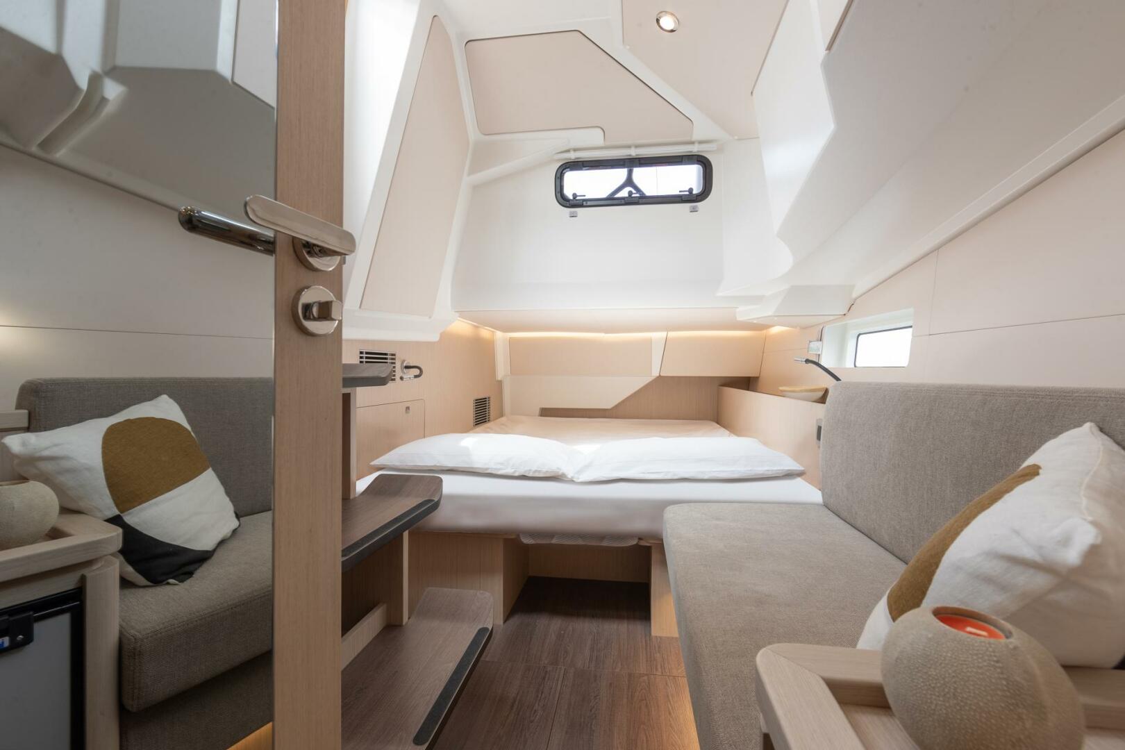 Inside, the yacht combines contemporary luxury with practical cruising features. The spacious salon is bathed in natural light, while the owner’s suite and private guest cabins ensure every journey is made in comfort. Clever design details throughout maximize storage, privacy, and liveability for extended time aboard.