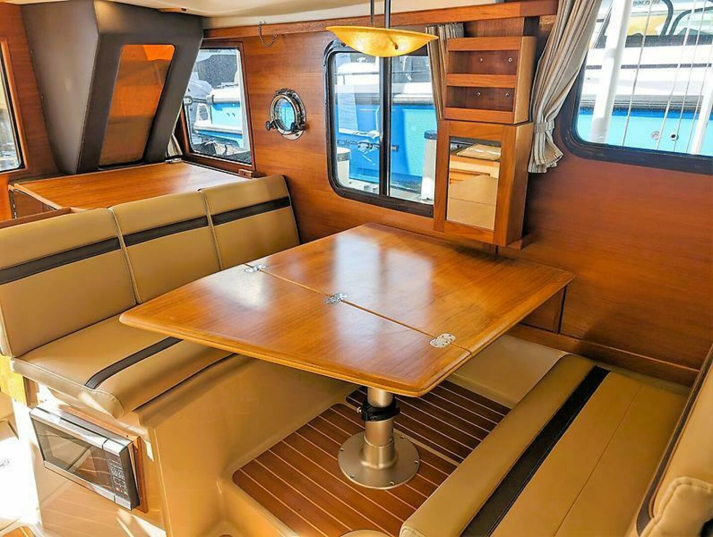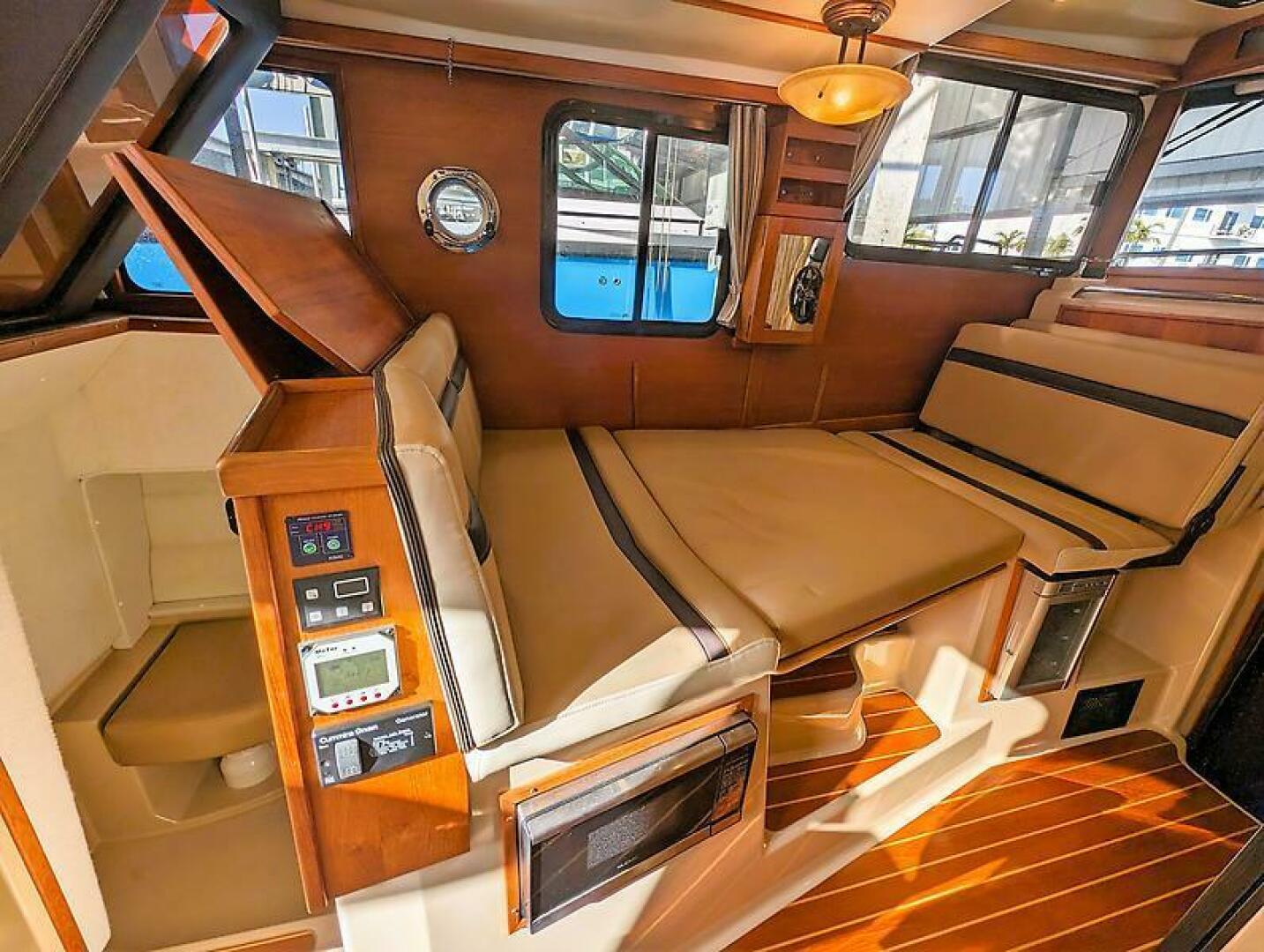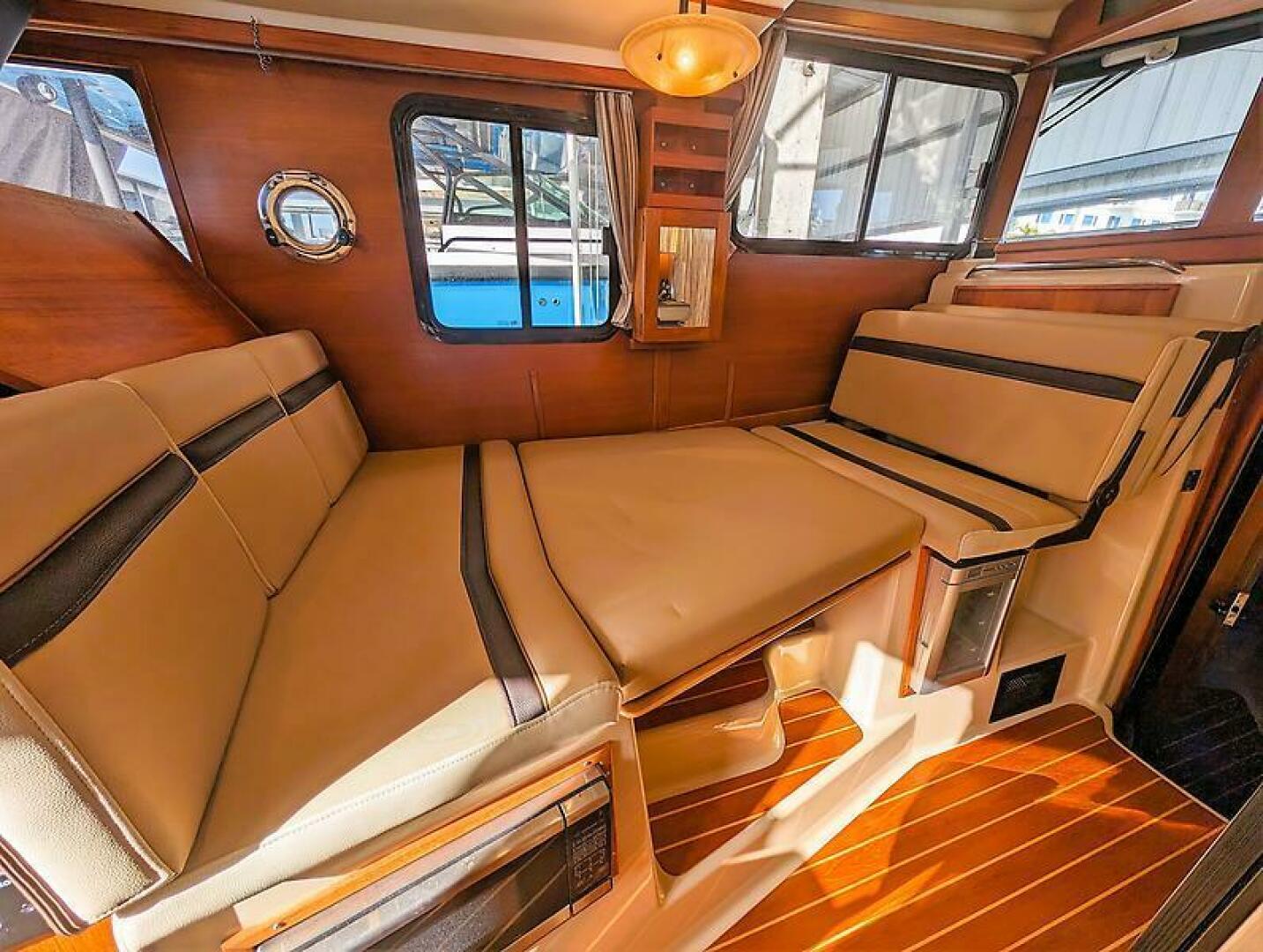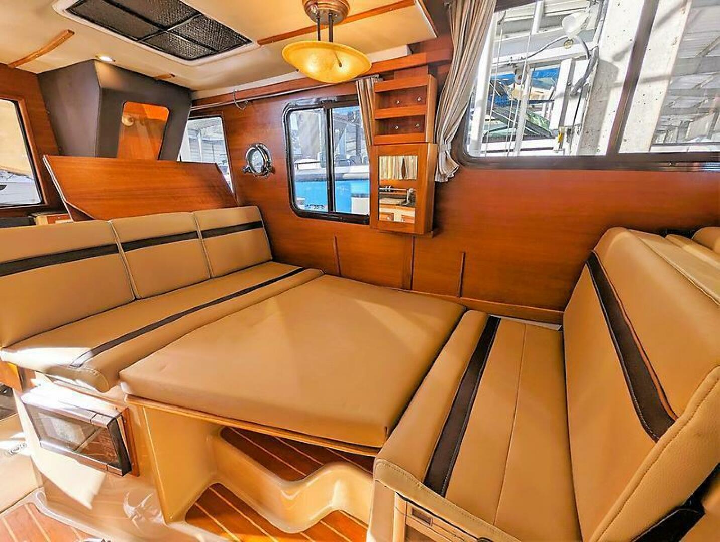 The R-31 CB (Command Bridge) offers many notable features to make her ideal for extended cruising while still being a trailerable trawler. The R-31 was the first Ranger Tug to feature a flybridge equipped with electronic controls at both the upper and lower helm. The flybridge also retracts to allow for trailering the 31'. The builders at Ranger Tugs also equipped the foredeck with seating and a table that can be raised or lowered depending on whether the boat is under way or at anchor or dock for entertaining. In addition to the extra seating now available on the flybridge and foredeck the R-31 allows for a larger cockpit area with wraparound seating and extra seating that folds out of the gunwale. When not entertaining, seats are folded leaving the cockpit unencumbered.