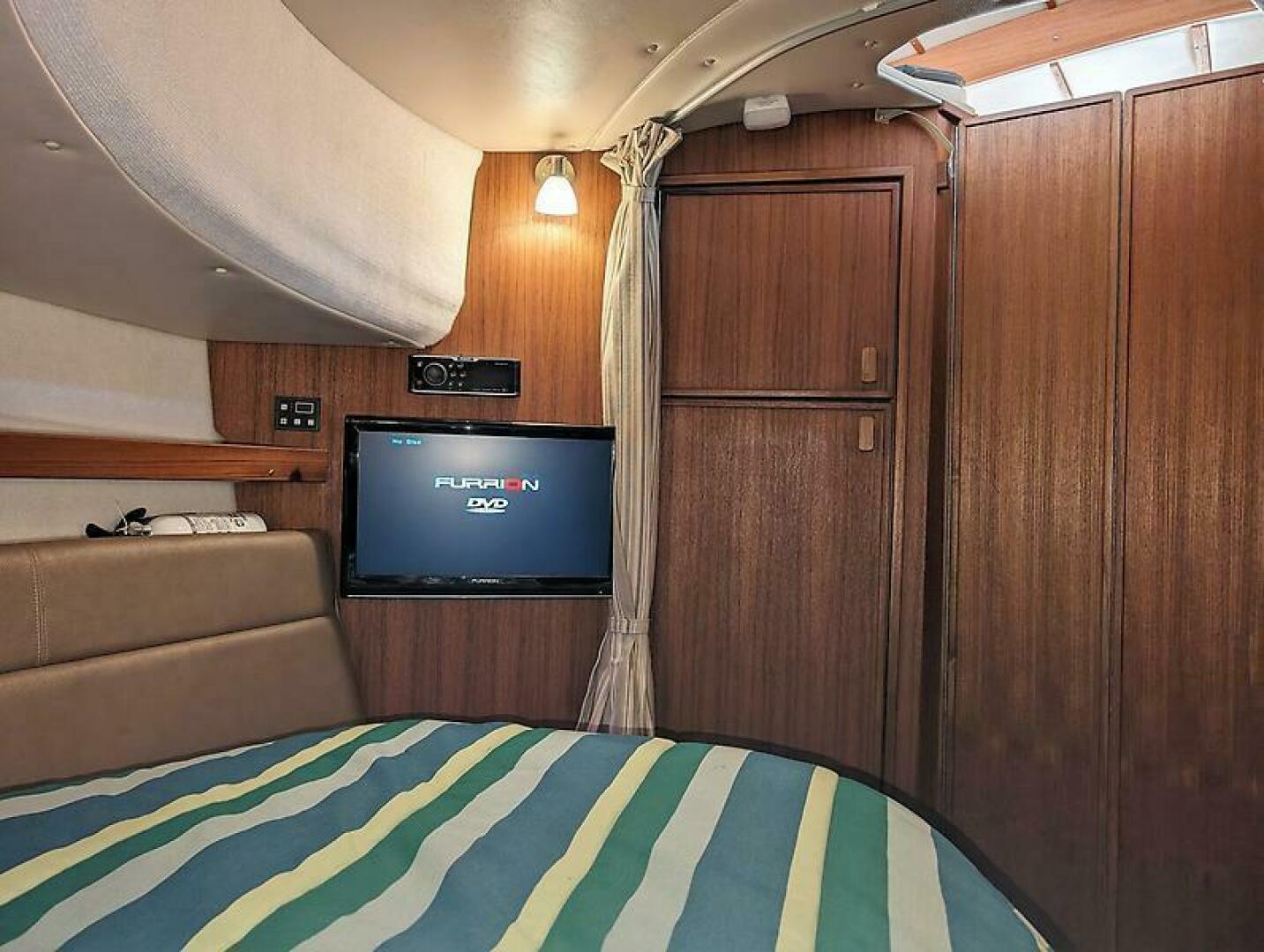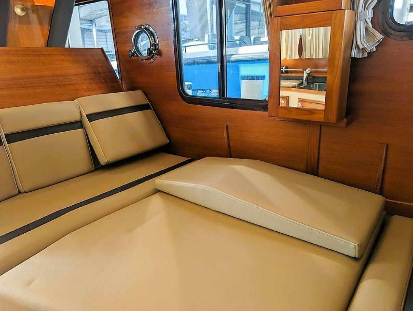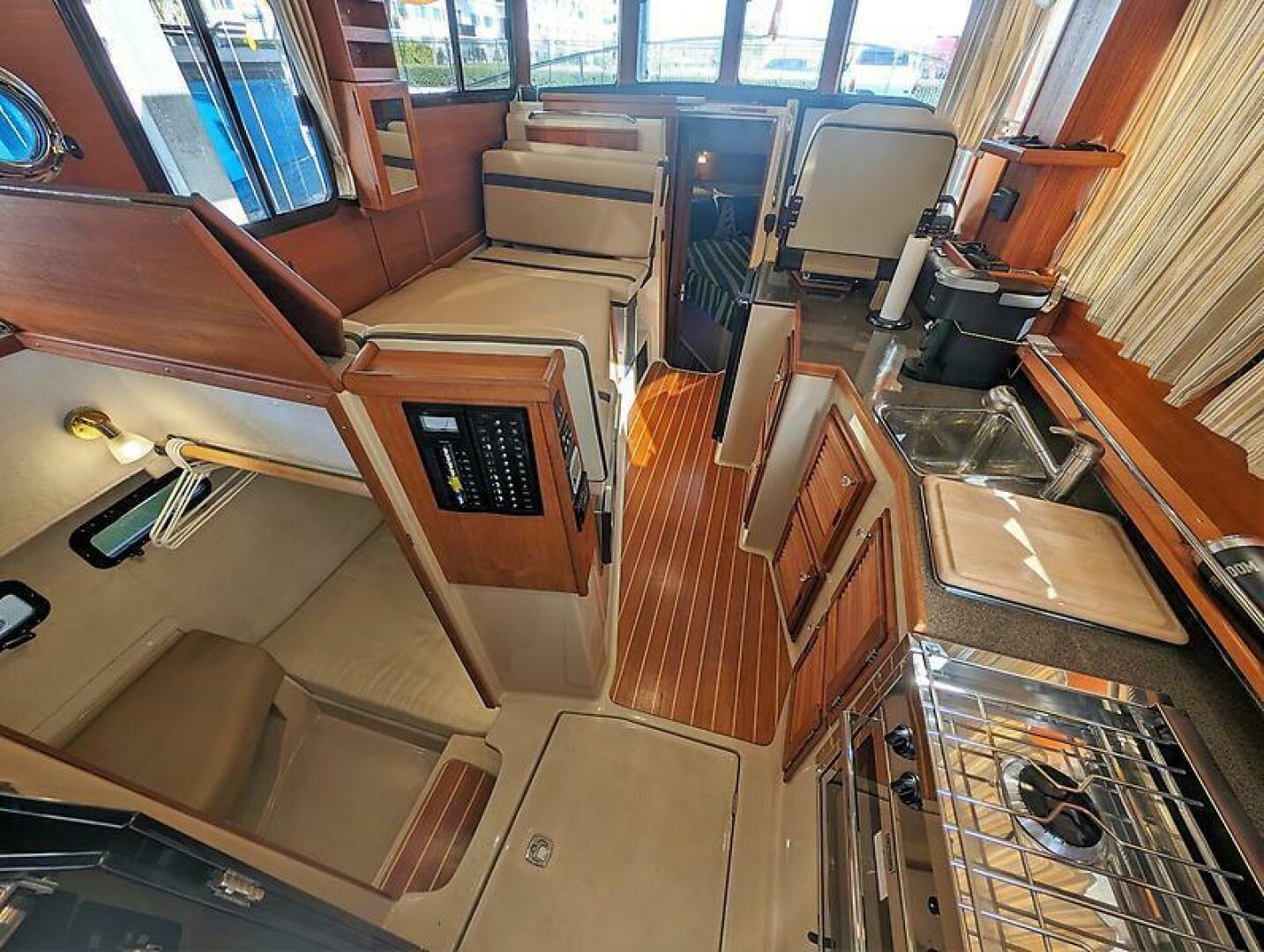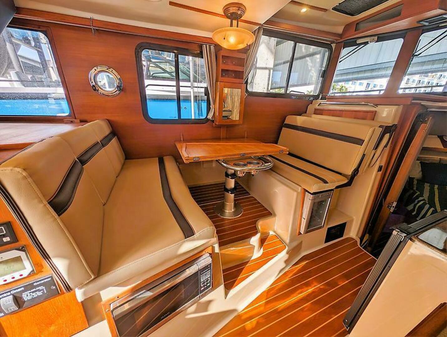 The R-31 CB (Command Bridge) offers many notable features to make her ideal for extended cruising while still being a trailerable trawler. The R-31 was the first Ranger Tug to feature a flybridge equipped with electronic controls at both the upper and lower helm. The flybridge also retracts to allow for trailering the 31'. The builders at Ranger Tugs also equipped the foredeck with seating and a table that can be raised or lowered depending on whether the boat is under way or at anchor or dock for entertaining. In addition to the extra seating now available on the flybridge and foredeck the R-31 allows for a larger cockpit area with wraparound seating and extra seating that folds out of the gunwale. When not entertaining, seats are folded leaving the cockpit unencumbered.