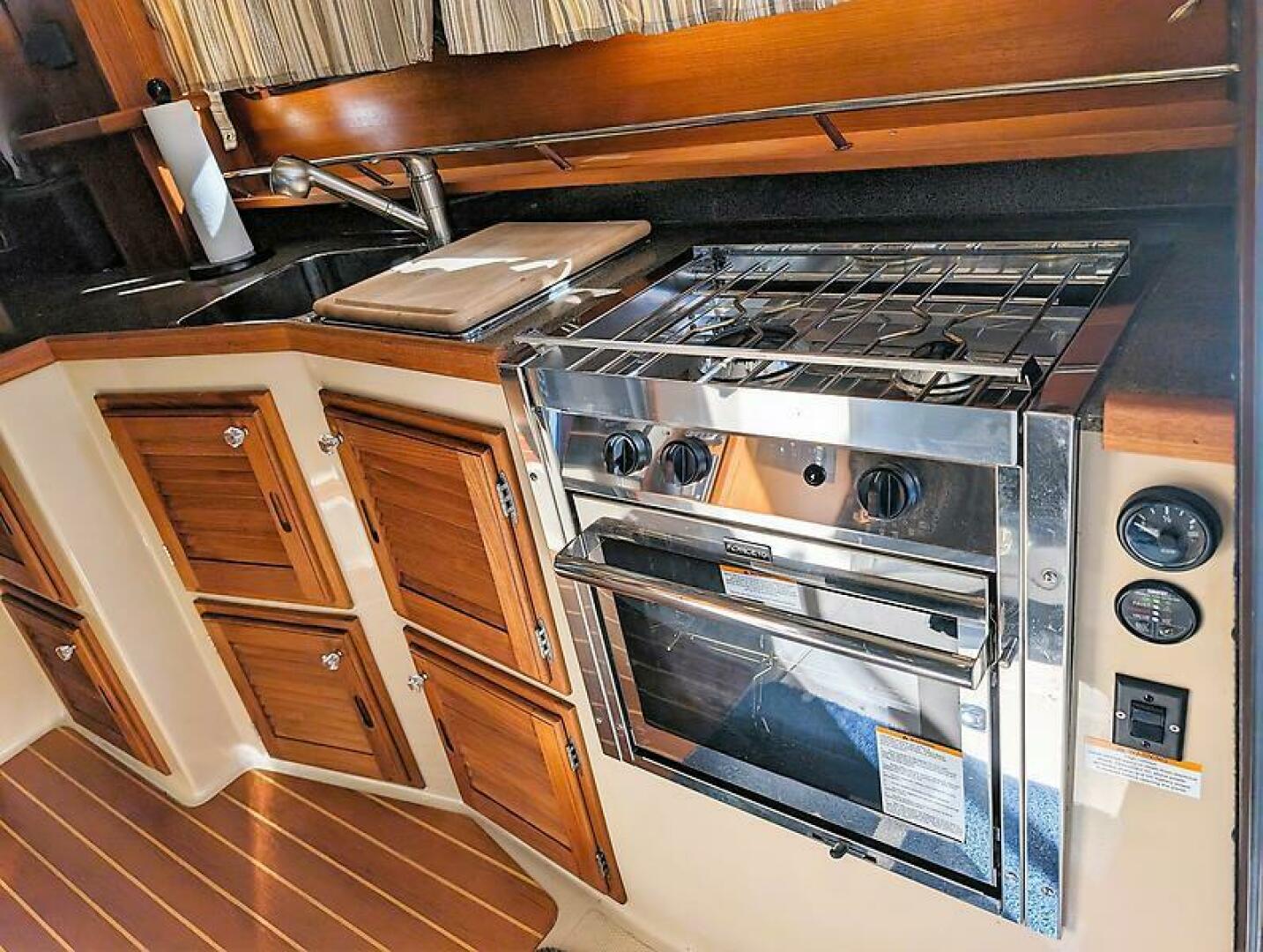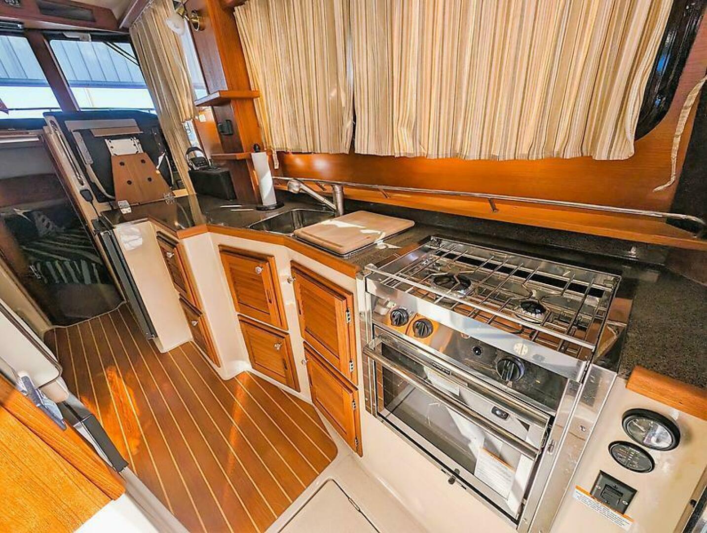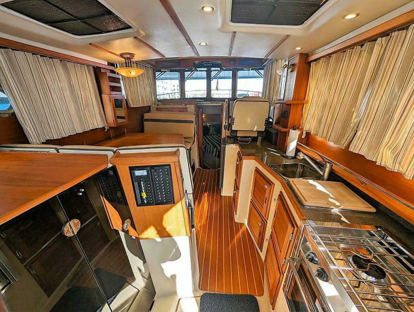 The interior layout of the R-31 features two staterooms-one large island berth forward with en suite head and a midship berth and day head. Those who are familiar with Ranger Tugs models will recognize the galley layout and lower helm station that maximize interior space. A starboard side door provides easy access from the lower helm to the side decks so crew can get to the bow for line handling.