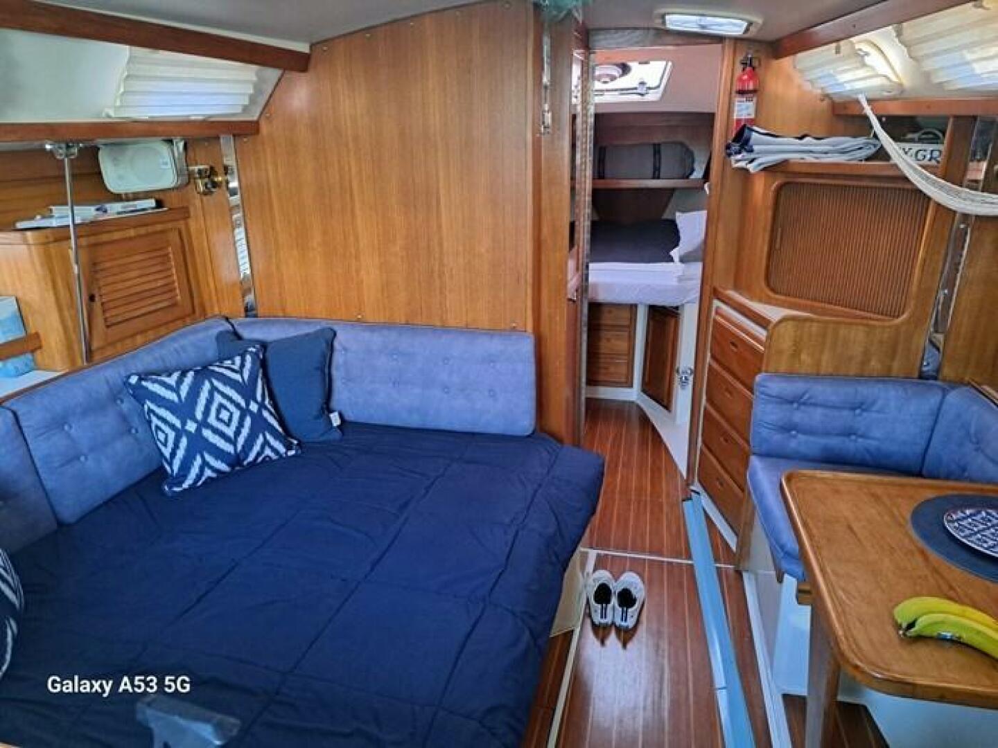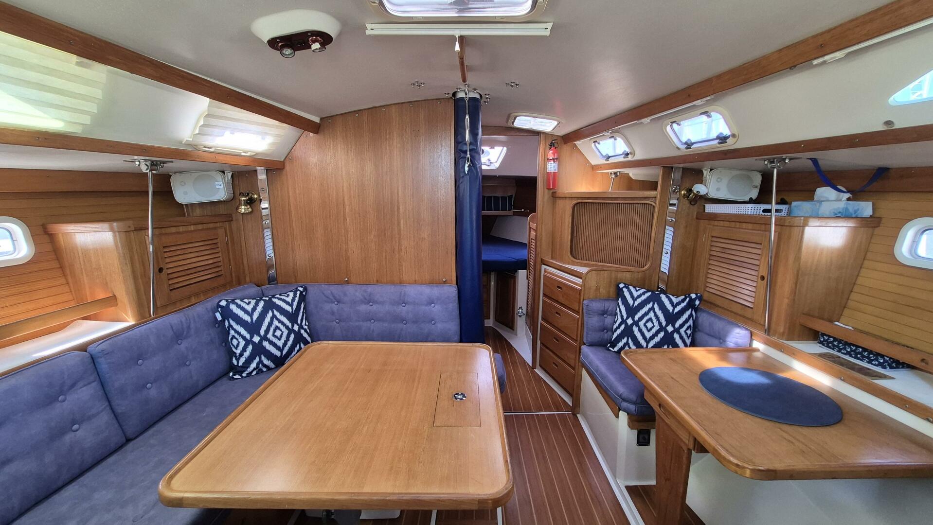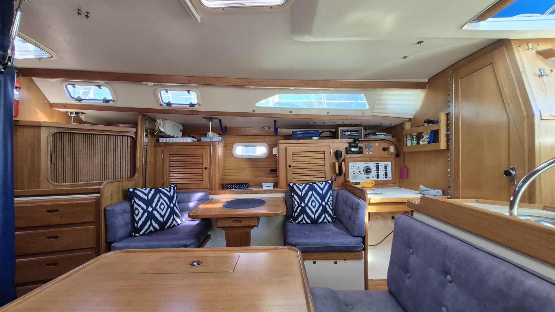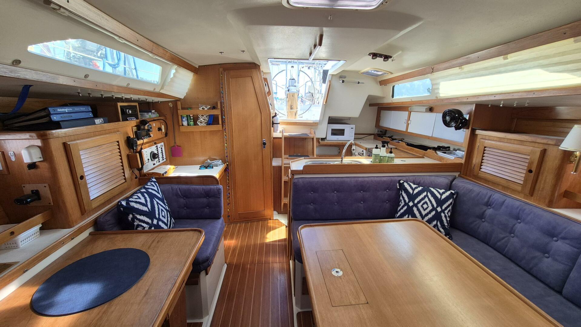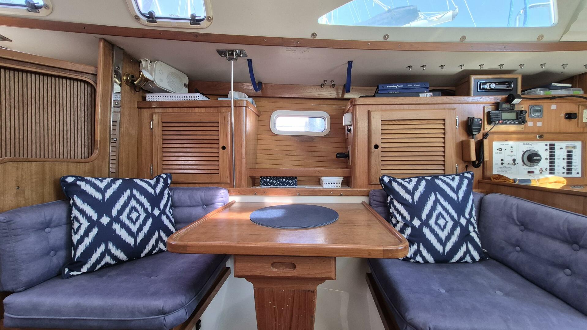 This is a perfect example of Catalina's legendary interiors; spacious, bright, smartly laid out, with a timeless modern feel. The U-shaped main salon seats six comfortably which doubles as a convertible double bed. The smart opposing armchairs increases entertaining possibilities which also that converts to a single berth. The galley features a gimballed propane stove/oven, deep dry locker, and ample storage with double stainless sinks. The forward stateroom includes a private entrance to the large head with an upgraded composting toilet, teak grid shower floor, and dual-entry design. The large aft berth offers excellent ventilation, natural light, and modular cushions for berth or garage use. A custom nav station with chart table and full drawer set adds utility and charm.