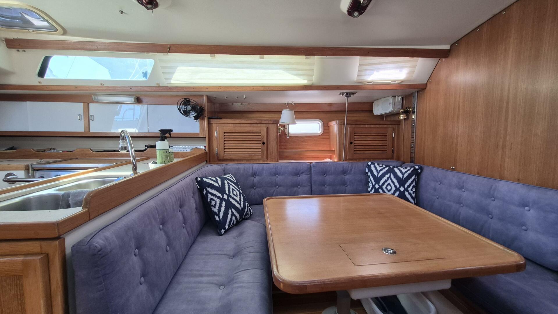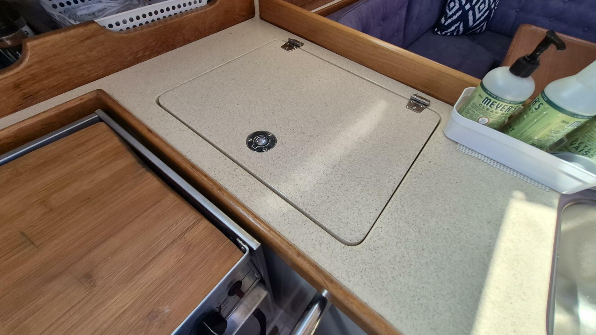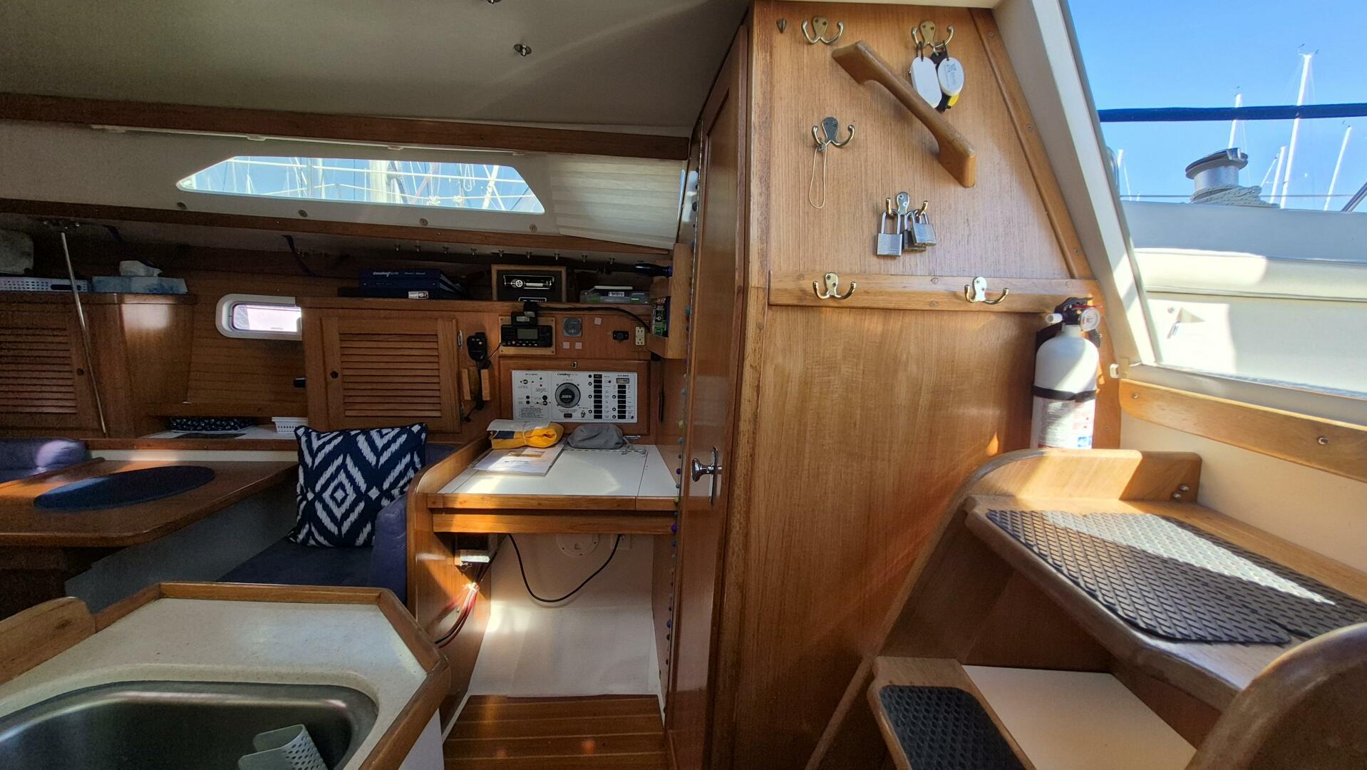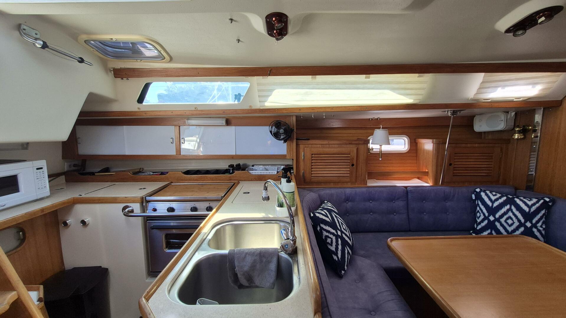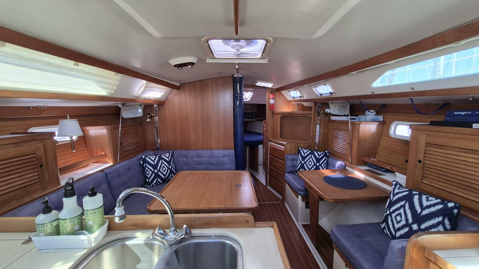 This is a perfect example of Catalina's legendary interiors; spacious, bright, smartly laid out, with a timeless modern feel. The U-shaped main salon seats six comfortably which doubles as a convertible double bed. The smart opposing armchairs increases entertaining possibilities which also that converts to a single berth. The galley features a gimballed propane stove/oven, deep dry locker, and ample storage with double stainless sinks. The forward stateroom includes a private entrance to the large head with an upgraded composting toilet, teak grid shower floor, and dual-entry design. The large aft berth offers excellent ventilation, natural light, and modular cushions for berth or garage use. A custom nav station with chart table and full drawer set adds utility and charm.