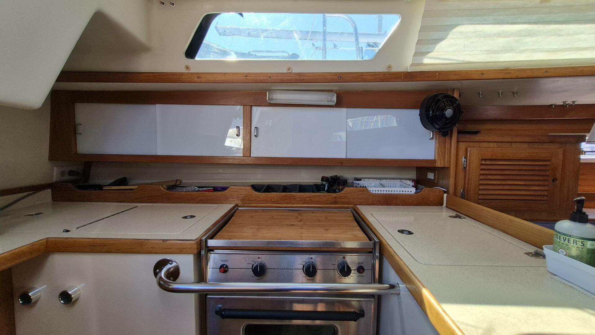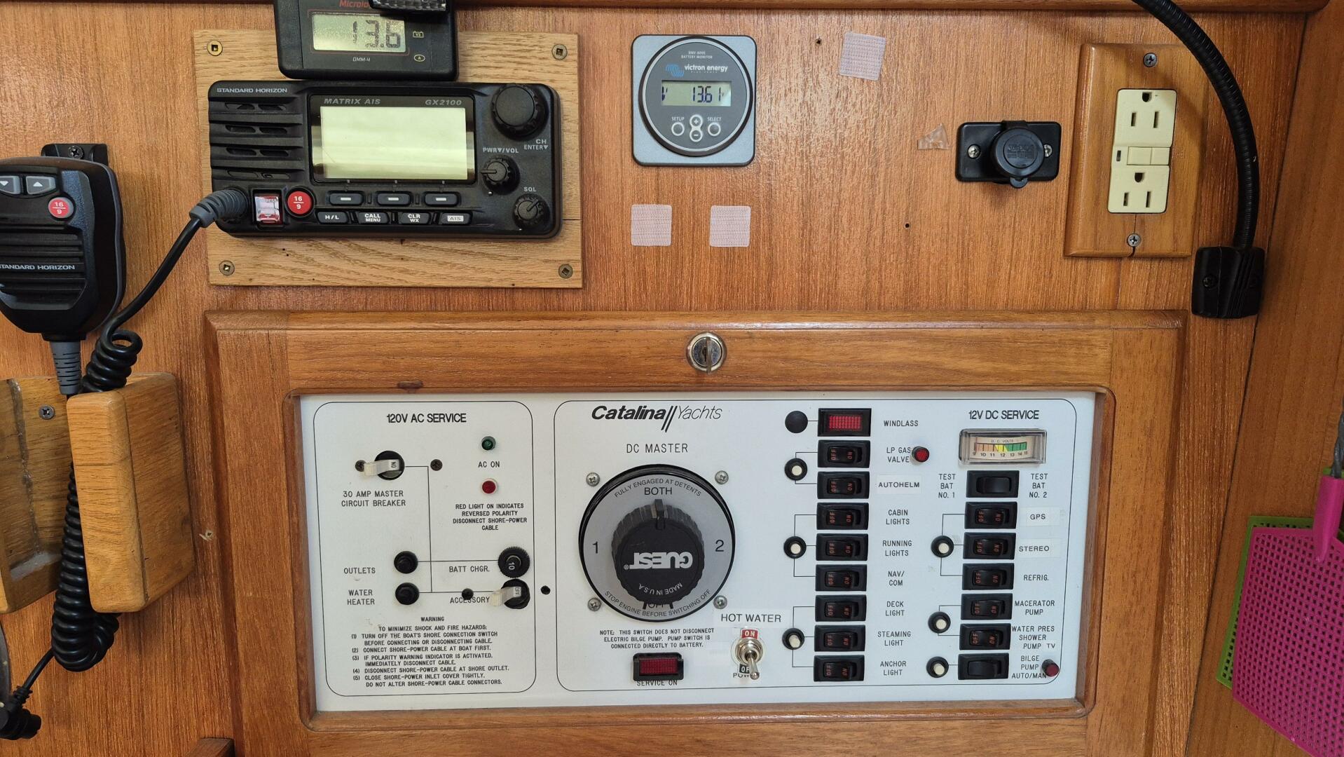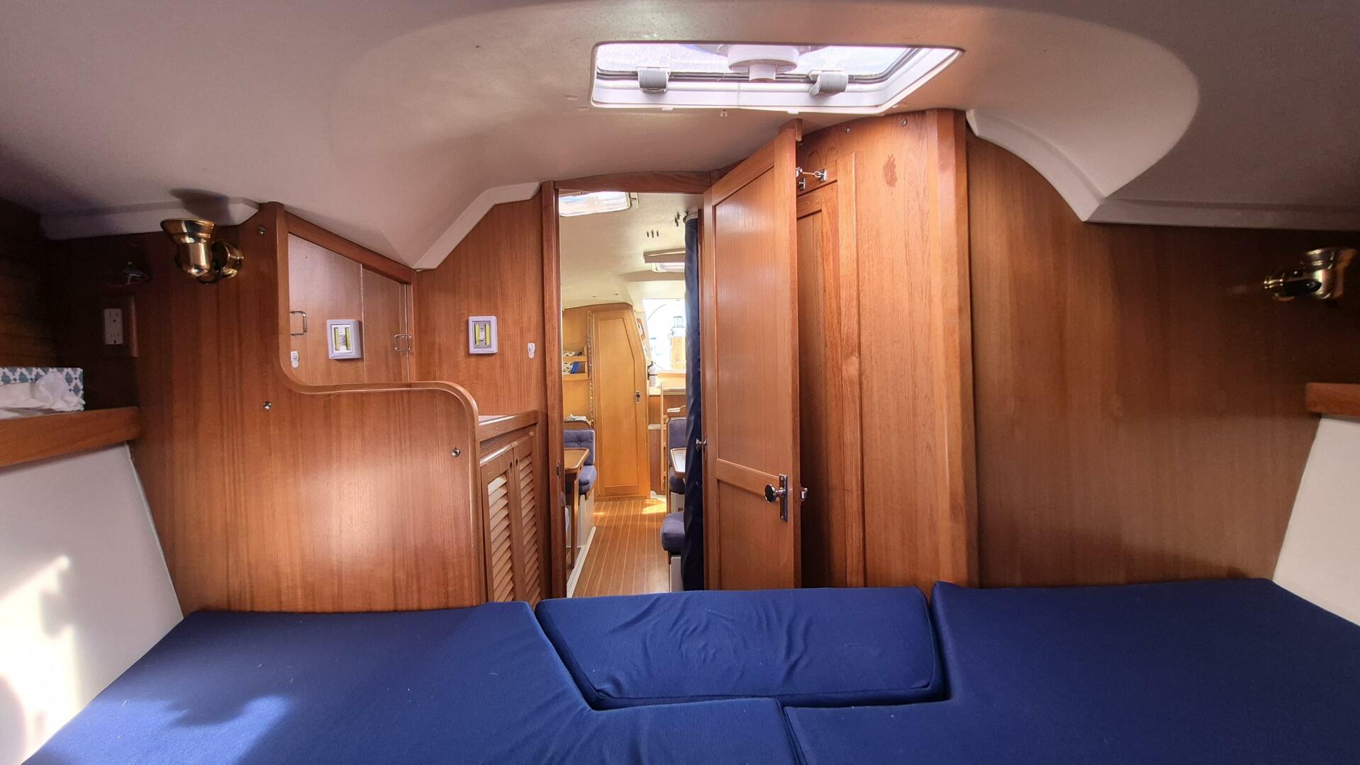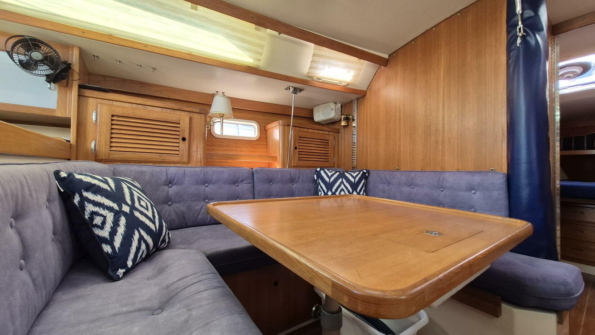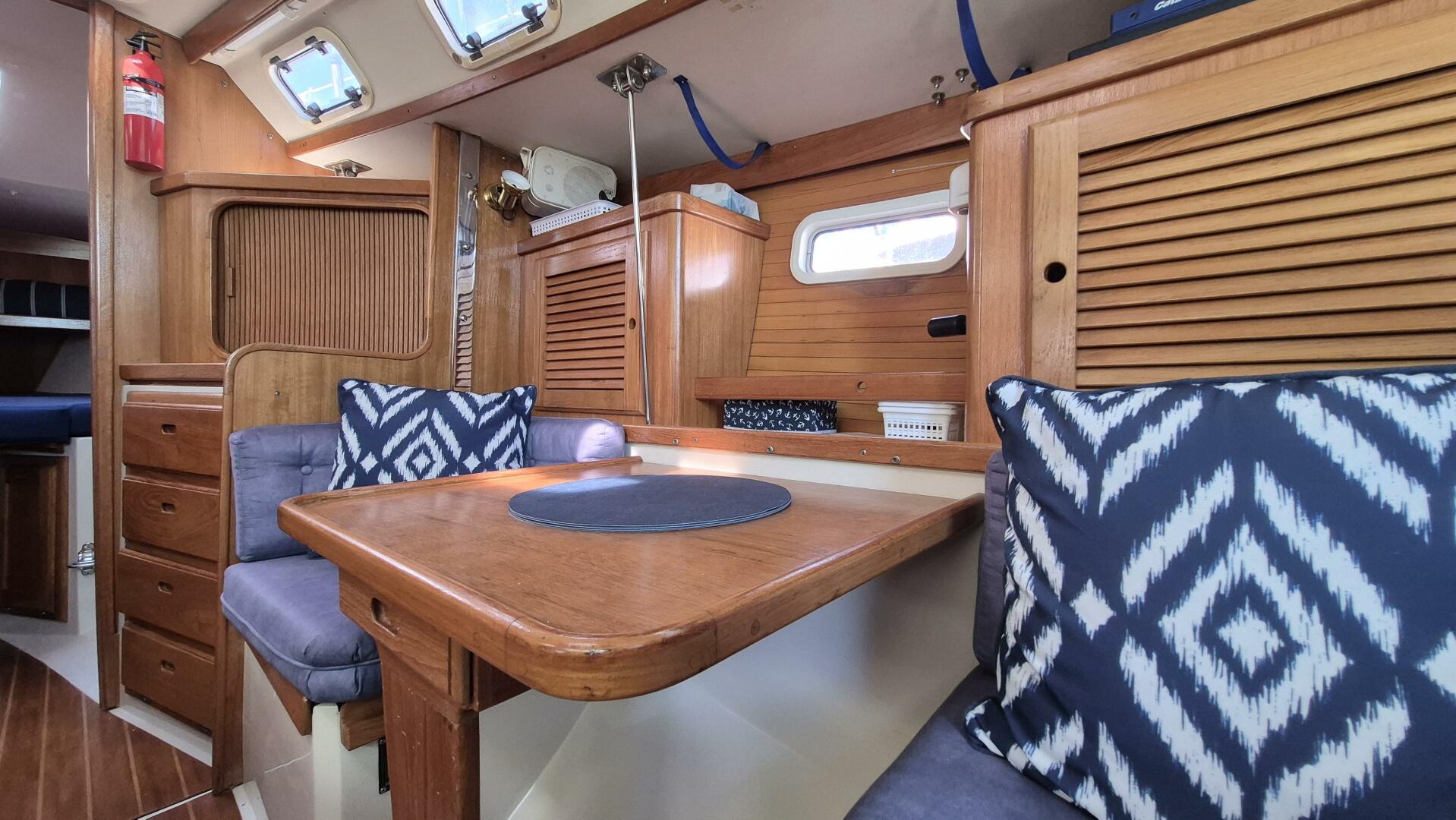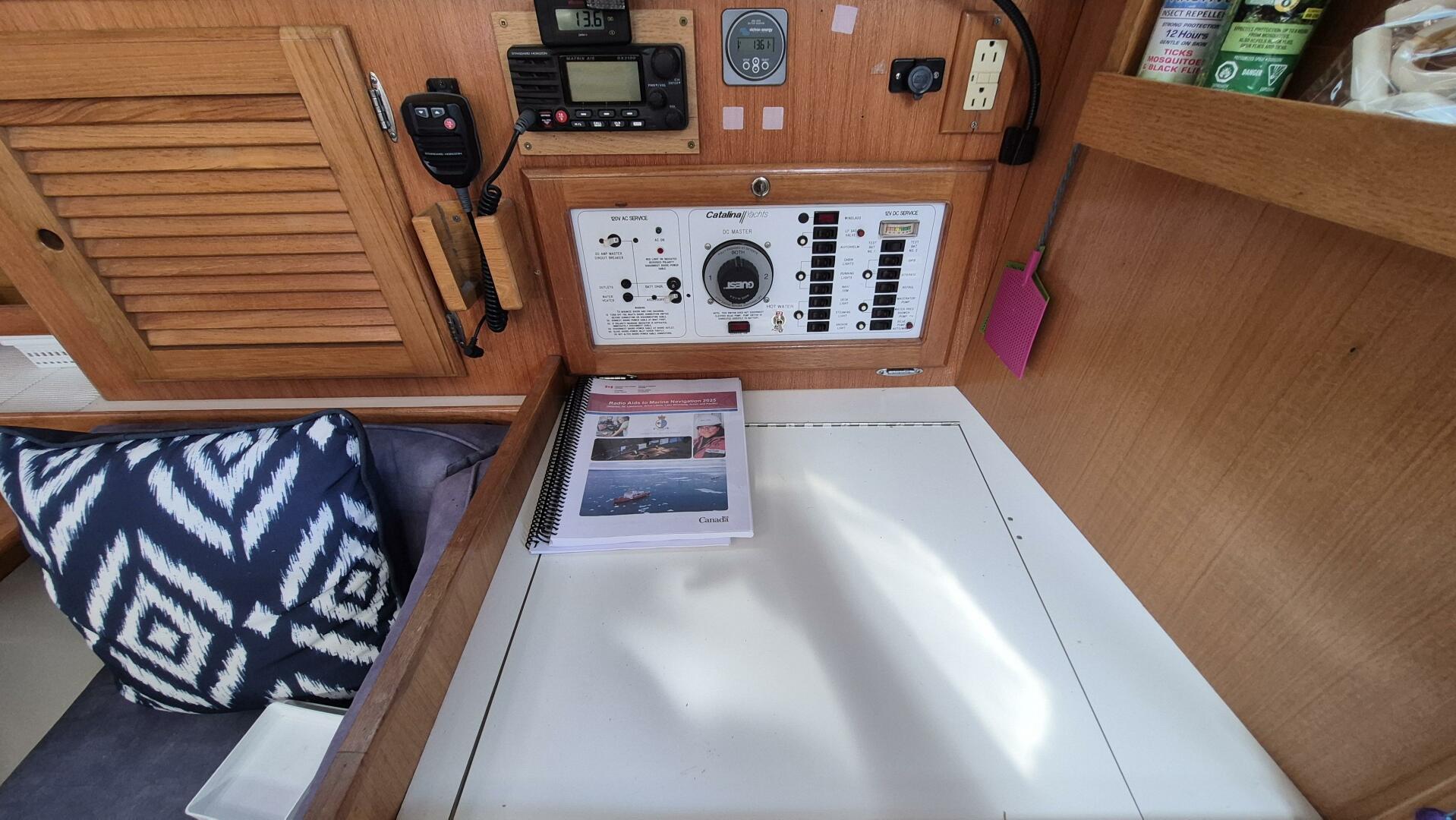 This is a perfect example of Catalina's legendary interiors; spacious, bright, smartly laid out, with a timeless modern feel. The U-shaped main salon seats six comfortably which doubles as a convertible double bed. The smart opposing armchairs increases entertaining possibilities which also that converts to a single berth. The galley features a gimballed propane stove/oven, deep dry locker, and ample storage with double stainless sinks. The forward stateroom includes a private entrance to the large head with an upgraded composting toilet, teak grid shower floor, and dual-entry design. The large aft berth offers excellent ventilation, natural light, and modular cushions for berth or garage use. A custom nav station with chart table and full drawer set adds utility and charm.