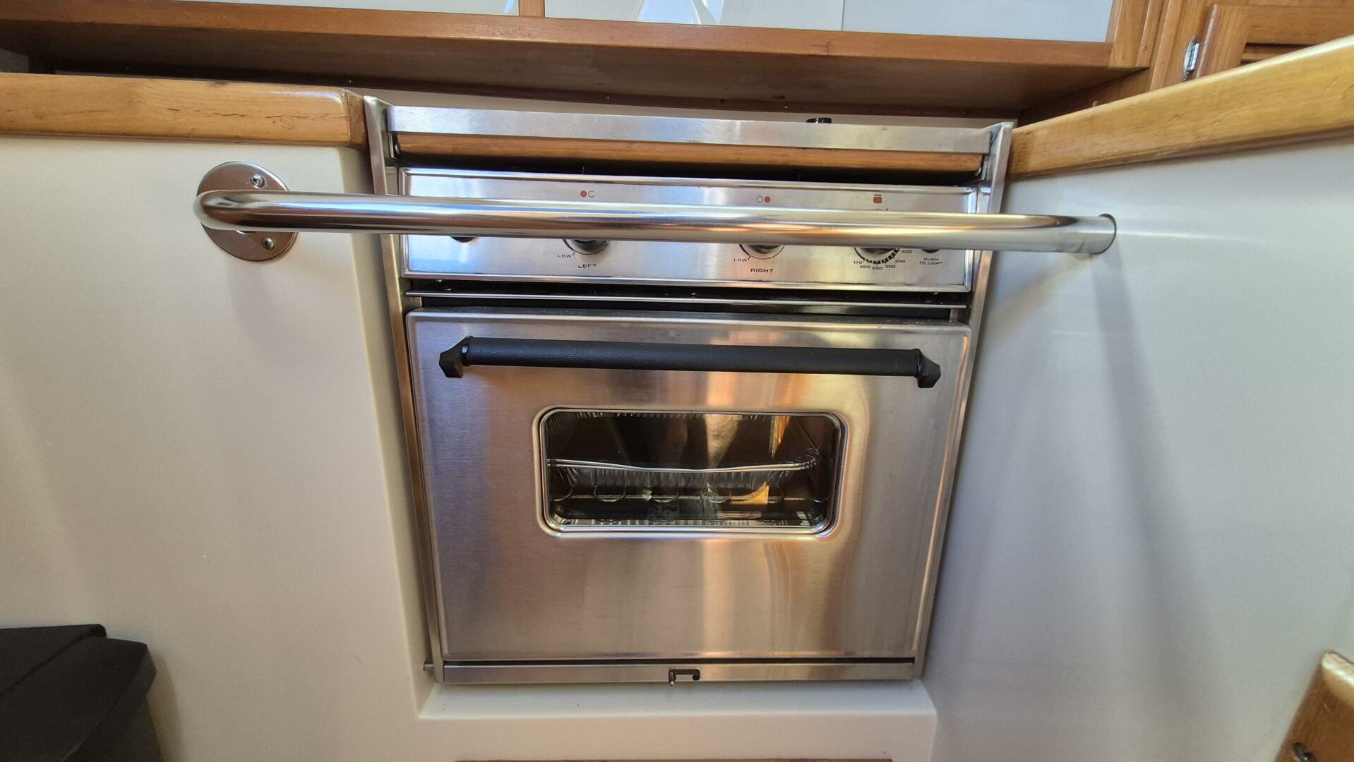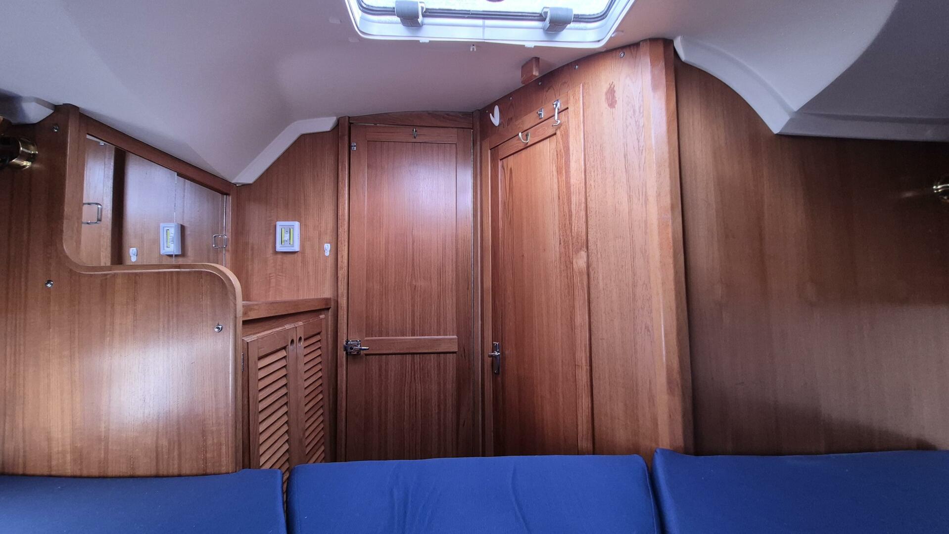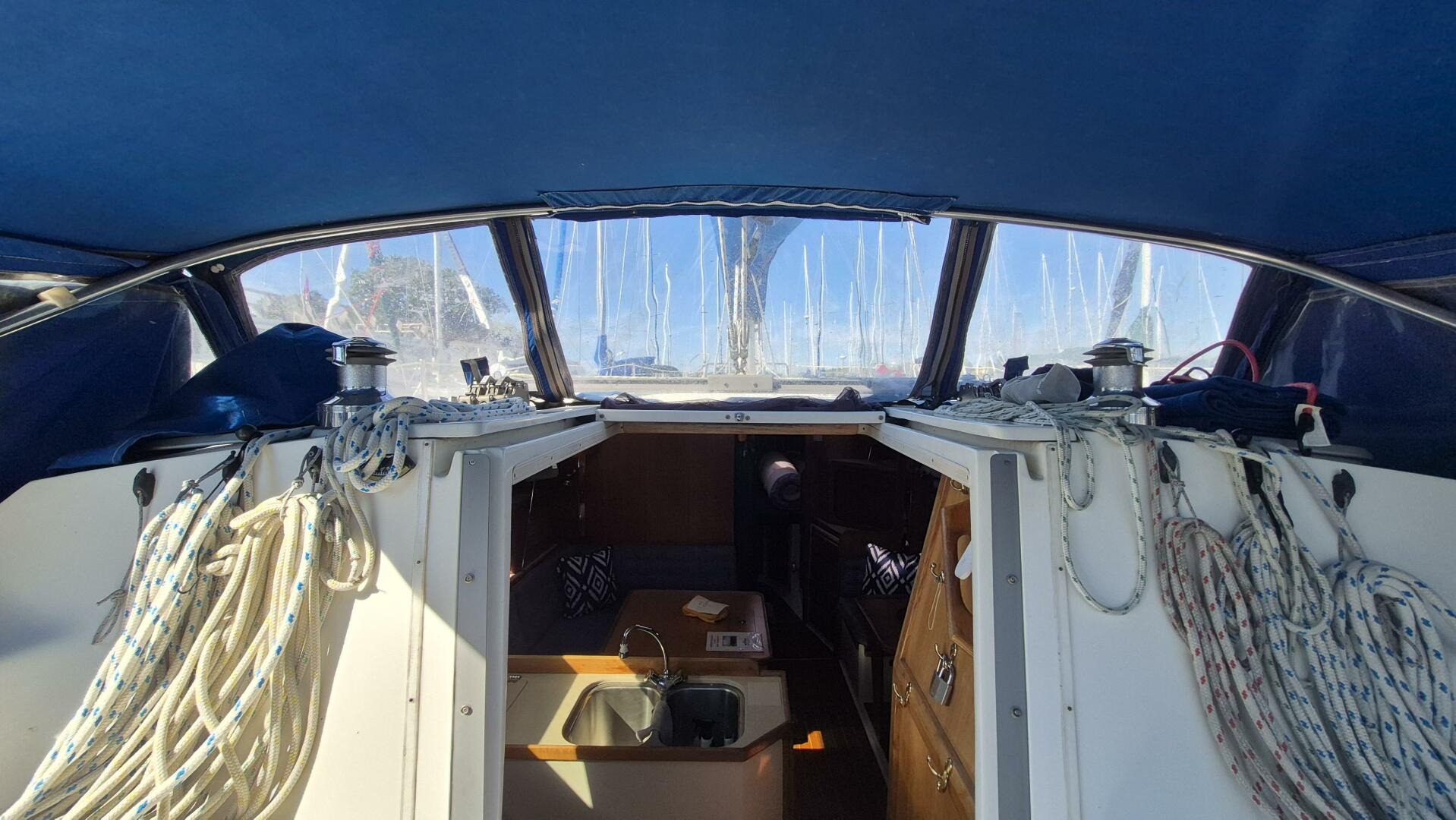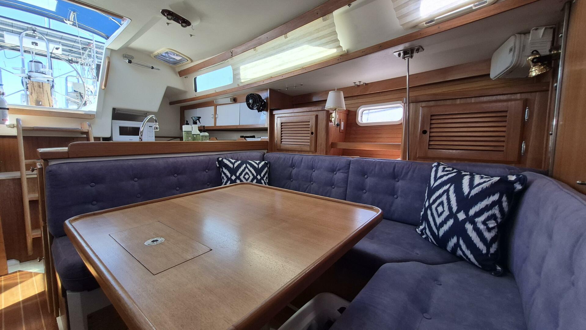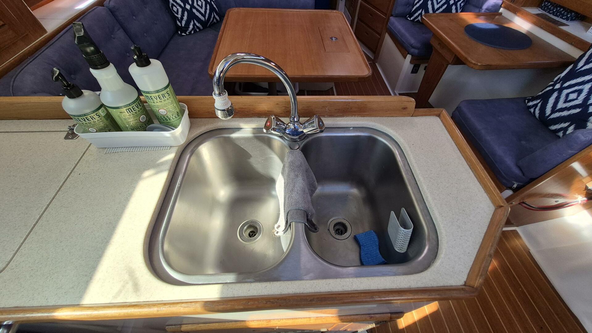 This is a perfect example of Catalina's legendary interiors; spacious, bright, smartly laid out, with a timeless modern feel. The U-shaped main salon seats six comfortably which doubles as a convertible double bed. The smart opposing armchairs increases entertaining possibilities which also that converts to a single berth. The galley features a gimballed propane stove/oven, deep dry locker, and ample storage with double stainless sinks. The forward stateroom includes a private entrance to the large head with an upgraded composting toilet, teak grid shower floor, and dual-entry design. The large aft berth offers excellent ventilation, natural light, and modular cushions for berth or garage use. A custom nav station with chart table and full drawer set adds utility and charm.