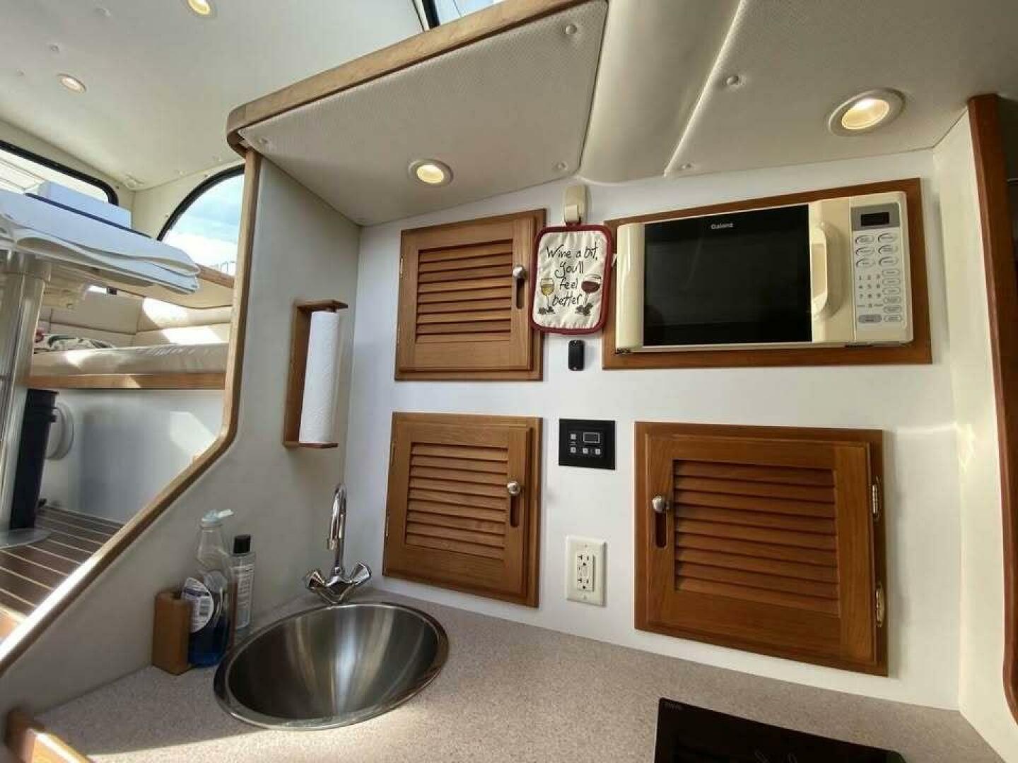 Comfortable Cabin with upscale finishes like her teak and holly sole, full galley, electric head, custom mattress for overnight adventures