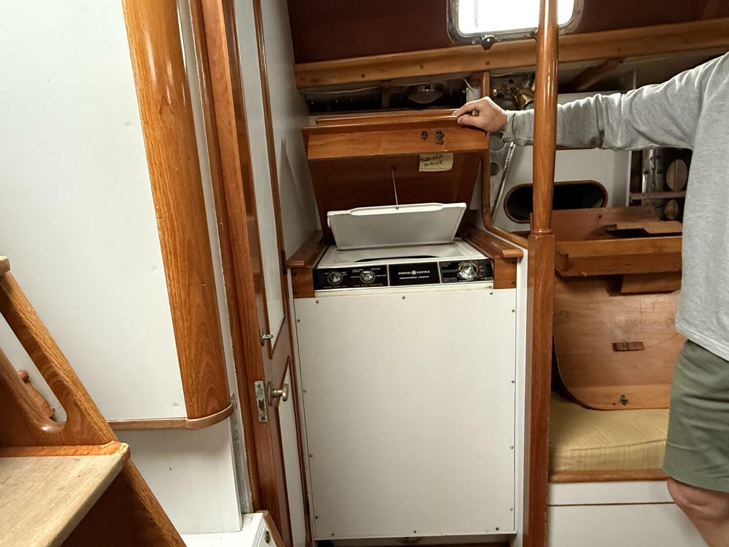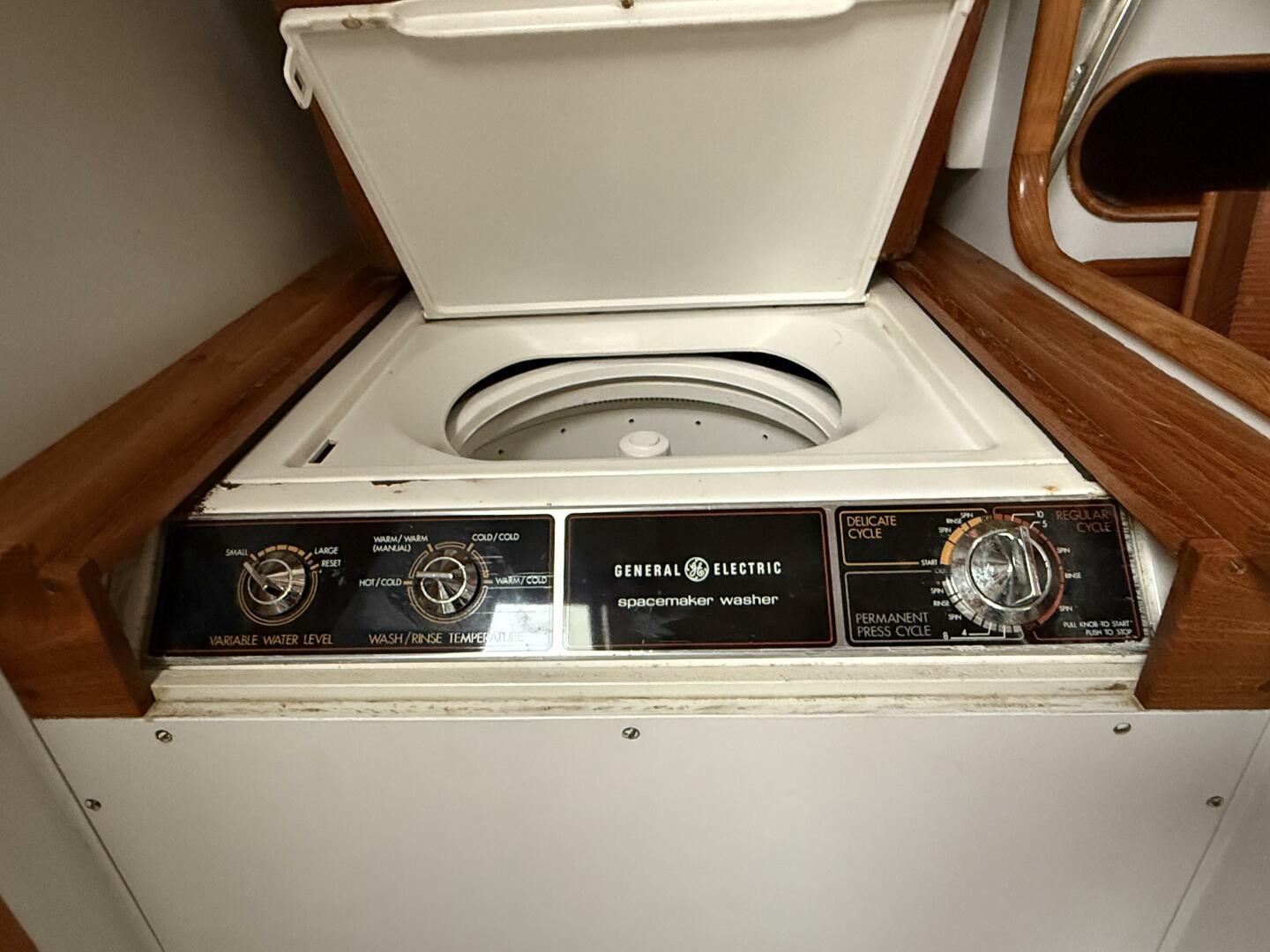 Main Salon: Port & Starboard settees with flip-up backrests to form larger berths. Centerline drop-leaf dining table, ample storage outboard. Hidden in a locker to port is a full-size washer/dryer.