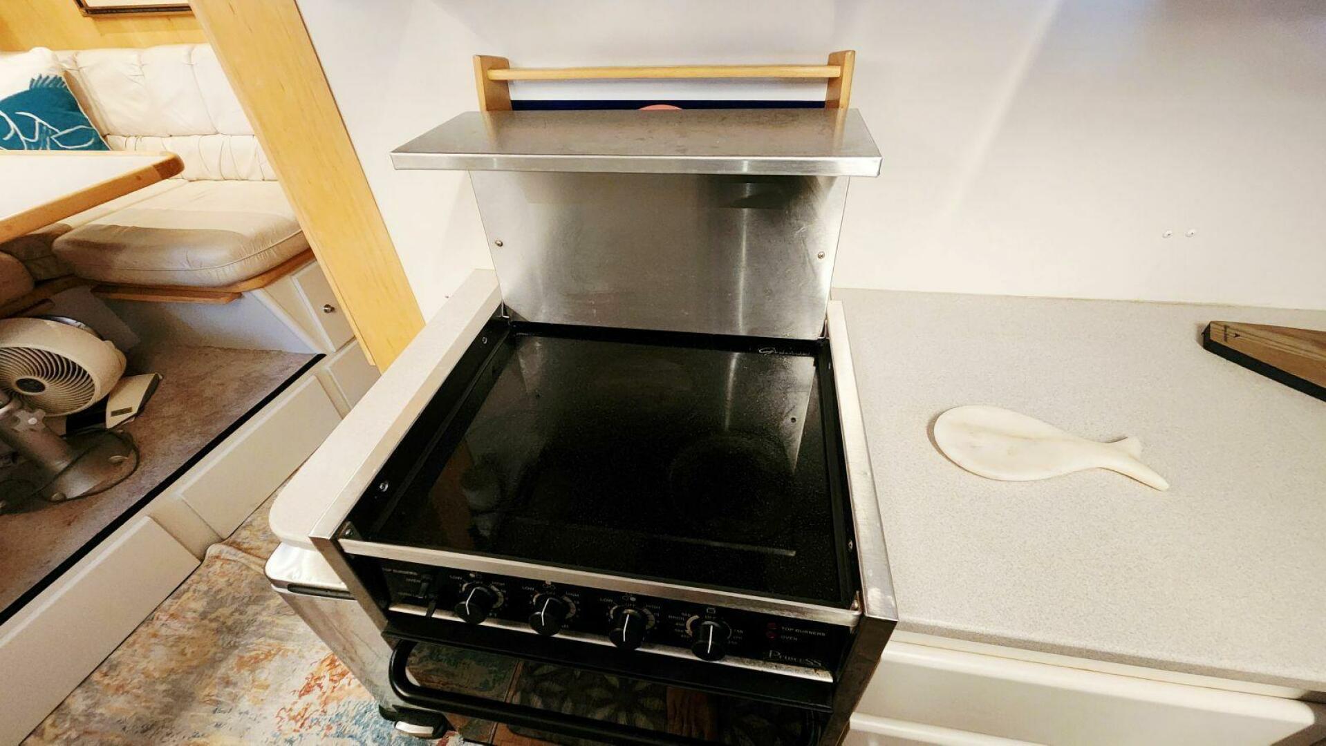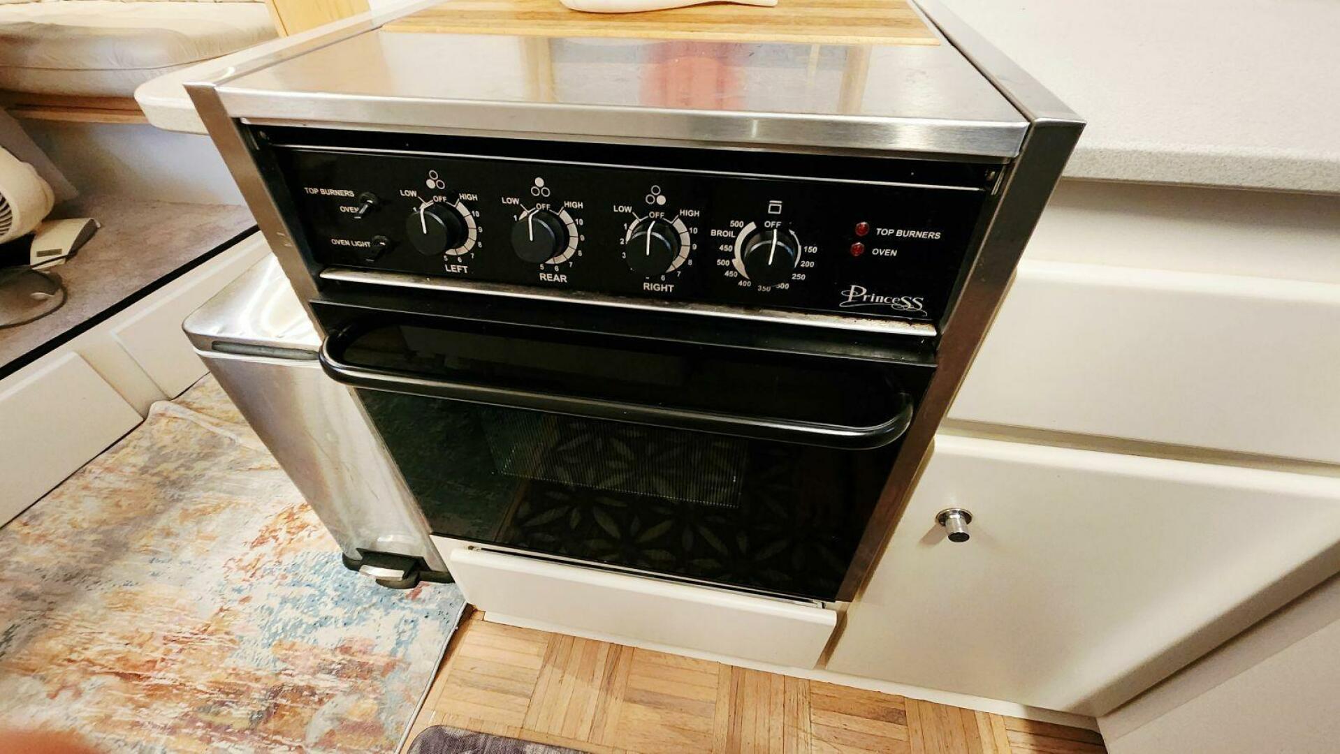 At the heart of it all is a full-sized residential refrigerator — no half-size compromises here. You can provision for weeks of cruising without juggling groceries or running out of space. Just beside it, a Princess oven with a three-burner ceramic cooktop gives you the tools to cook real meals aboard, from a quick breakfast to a full dinner spread.