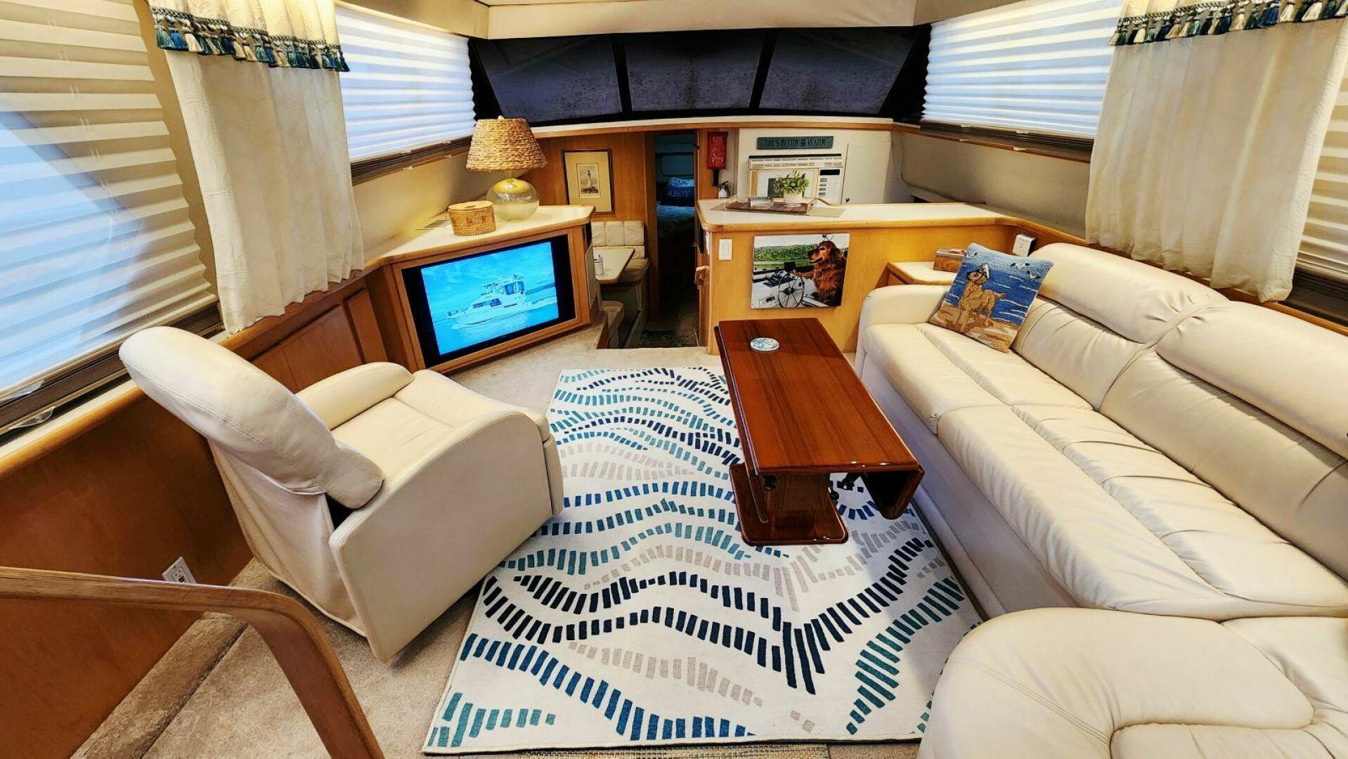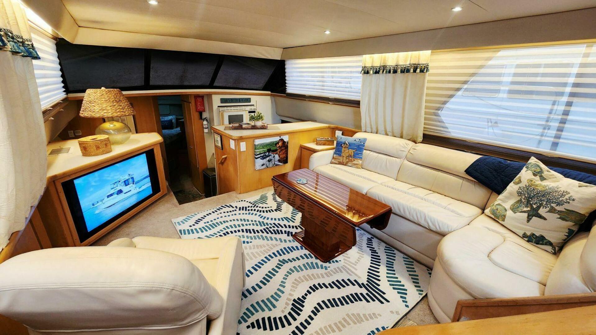 Step inside the salon of Now or Never and you’ll forget you’re on a 1995 Carver — it feels more like a waterfront condo than a classic aft cabin. Large windows flood the space with natural light when you want it, and room-darkening shades let you dim things down for movie night or a lazy morning sleep-in.