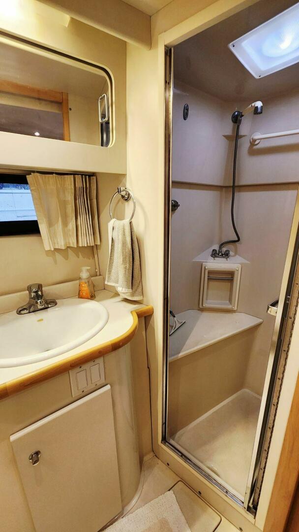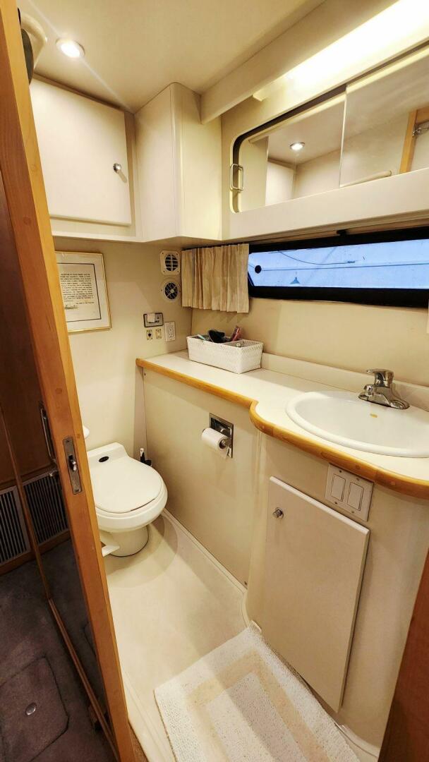 The master head aboard Now or Never is designed to feel more like home than a typical boat head. Just steps from the aft stateroom, this private ensuite includes a vanity with storage, bright lighting, and excellent ventilation.