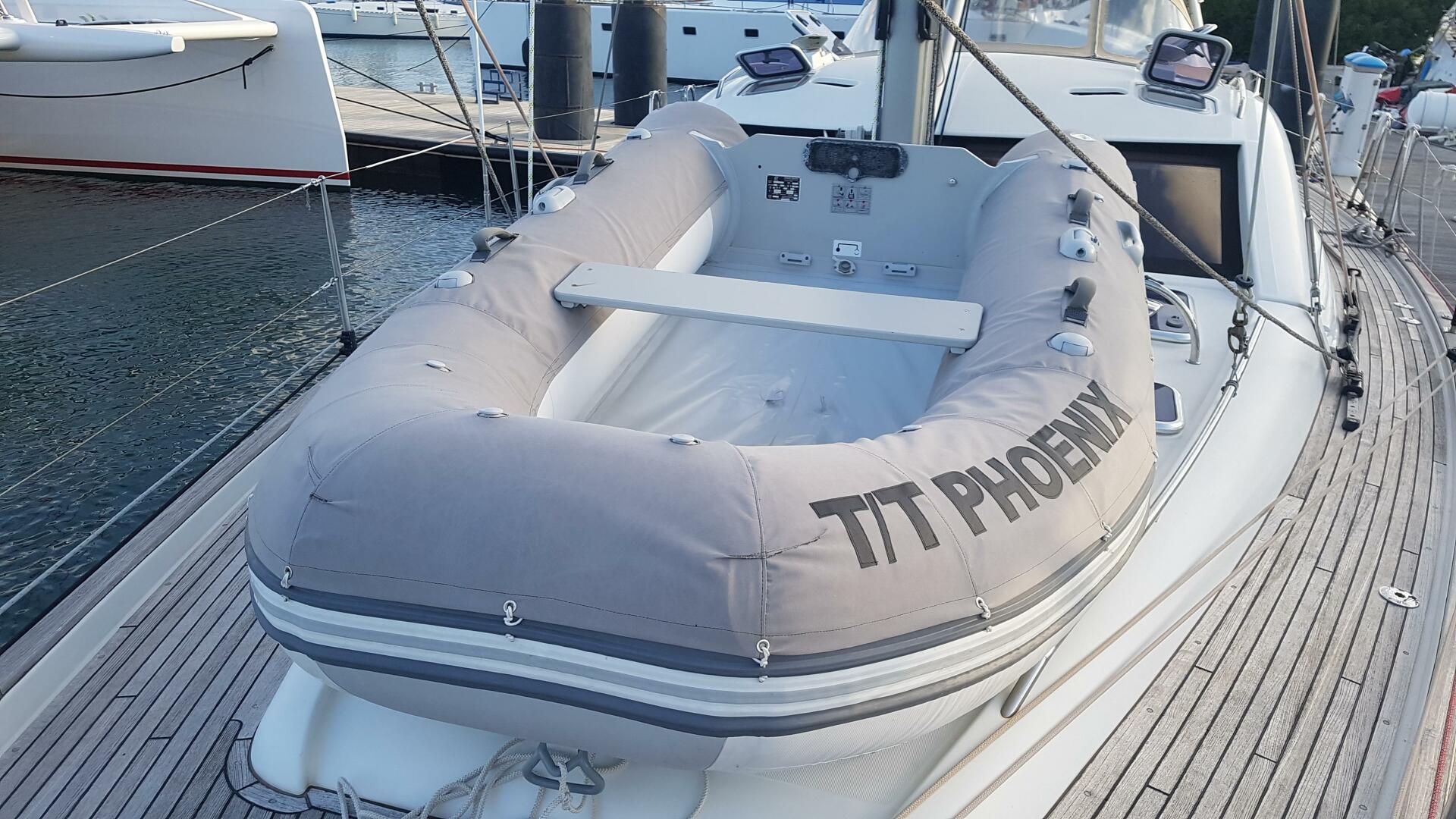 | Tenders: Dinghy Info: 2.85m Zodiac Cadet Aero with sunbrella chaps 2.85 ZODIAC Cadet Aero + 9.9 TOHATSU 2 stroke total of 45 l. gasoline tankage |