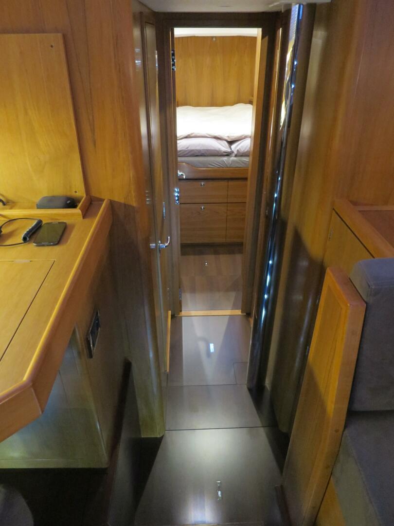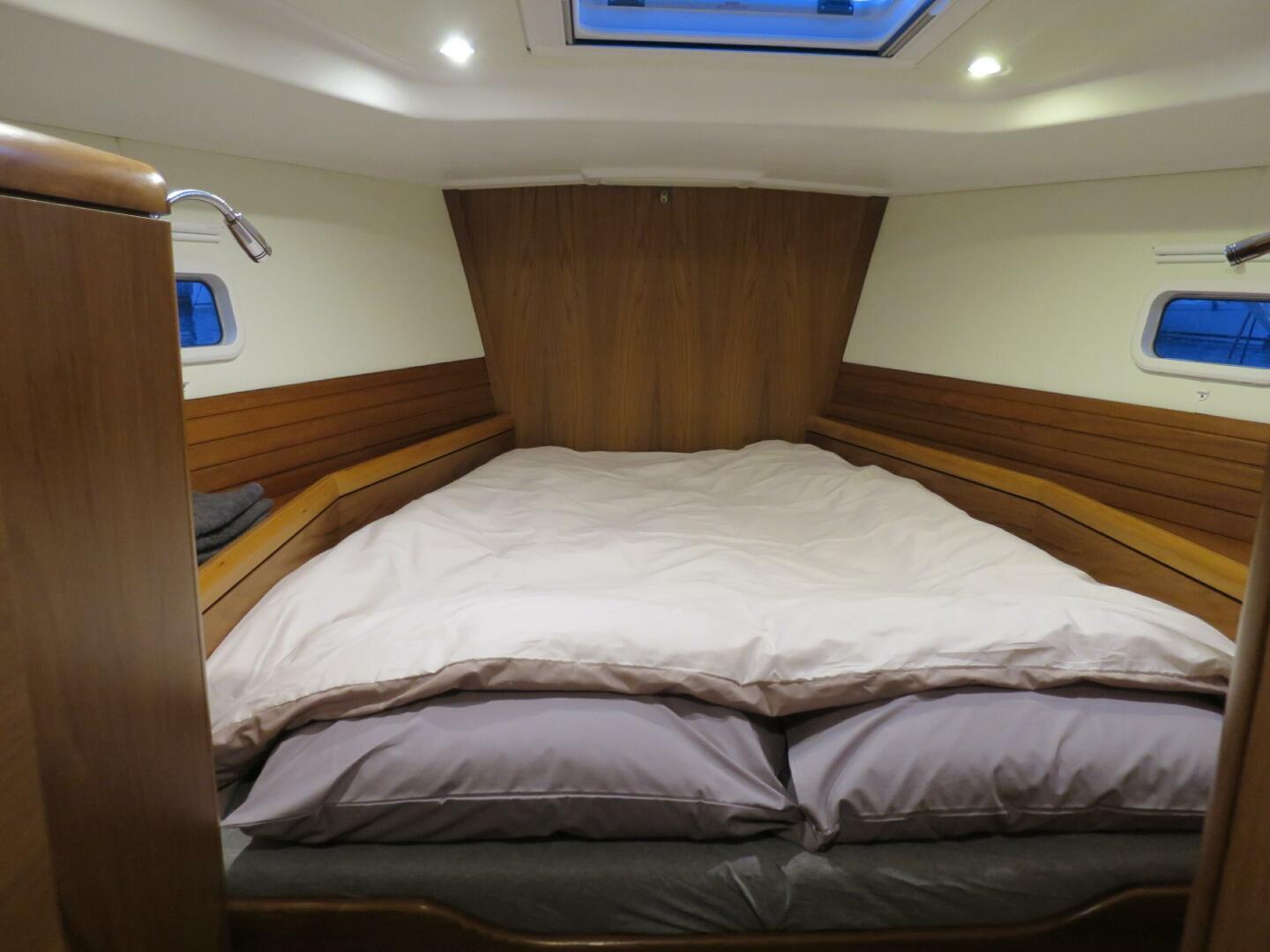 - Forward cabin with double centre bed (slatted base), drawers under, hanging locker, lockers, large hatch, 2 fixed hull portholes, lee cloths