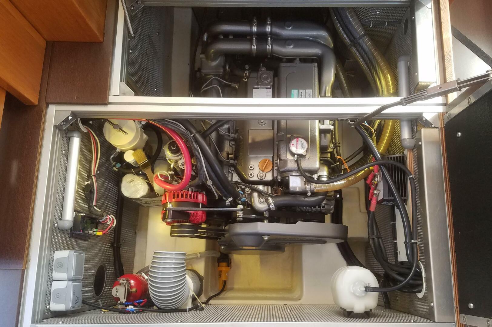 - Large engine room/technical compartment below saloon with hinged floorboards