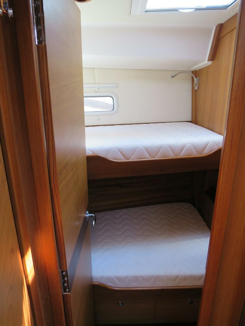 - Starboard double cabin with 2 superimposed berths (slatted base), hanging locker, shelves, hatch, 1 fixed hull porthole, lee cloths