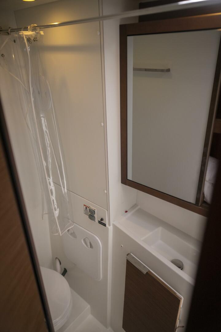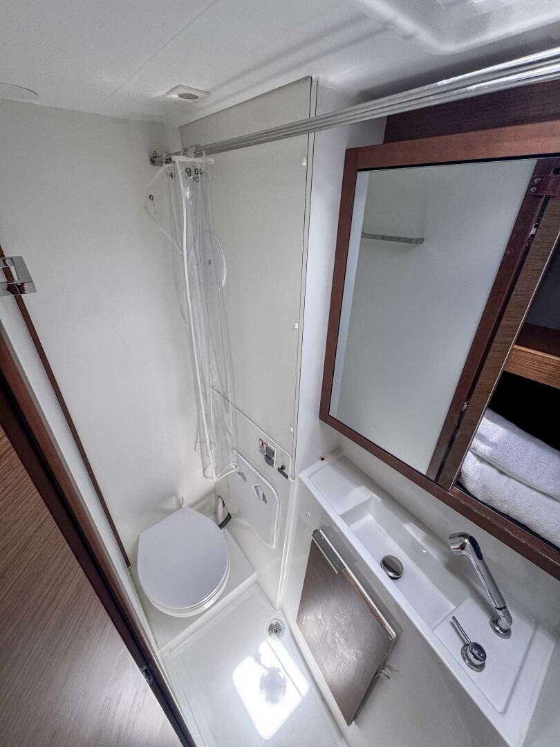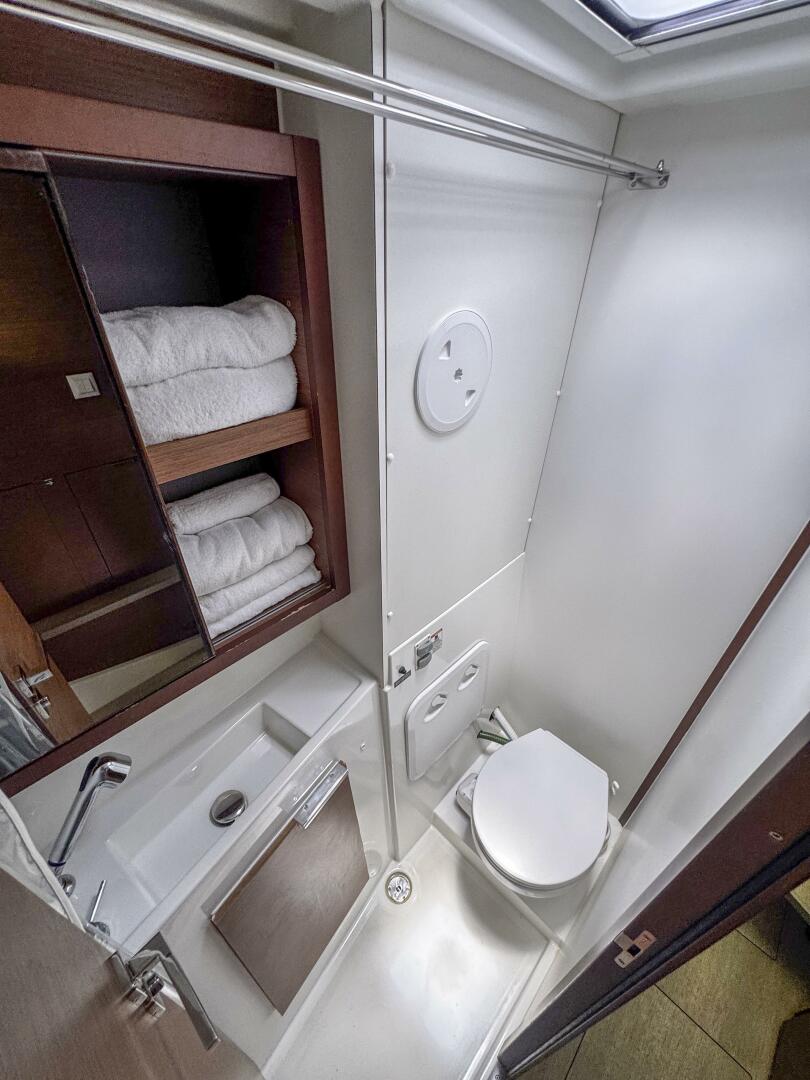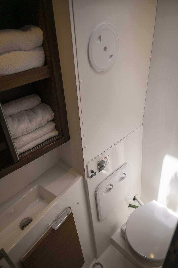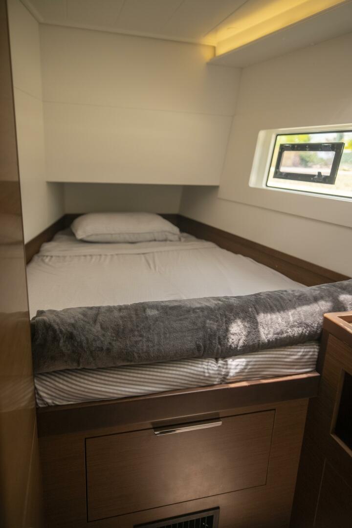These guest accommodations are impressively roomy for a catamaran of this size, offering privacy, generous natural light, good ventilation, and ample storage. Every berth features upgraded under-bed slats for extra comfort, and the cabins also feature opening portholes, full size mirrors on the cabin doors, 12V fans, and USB charging.