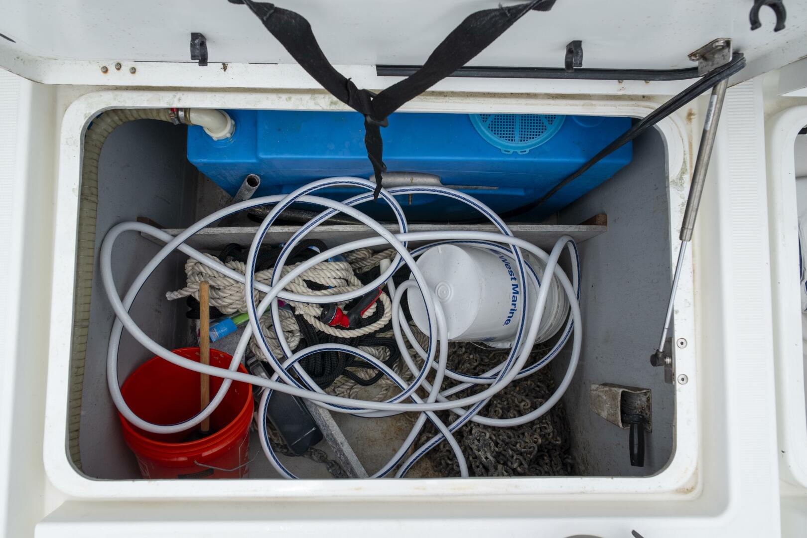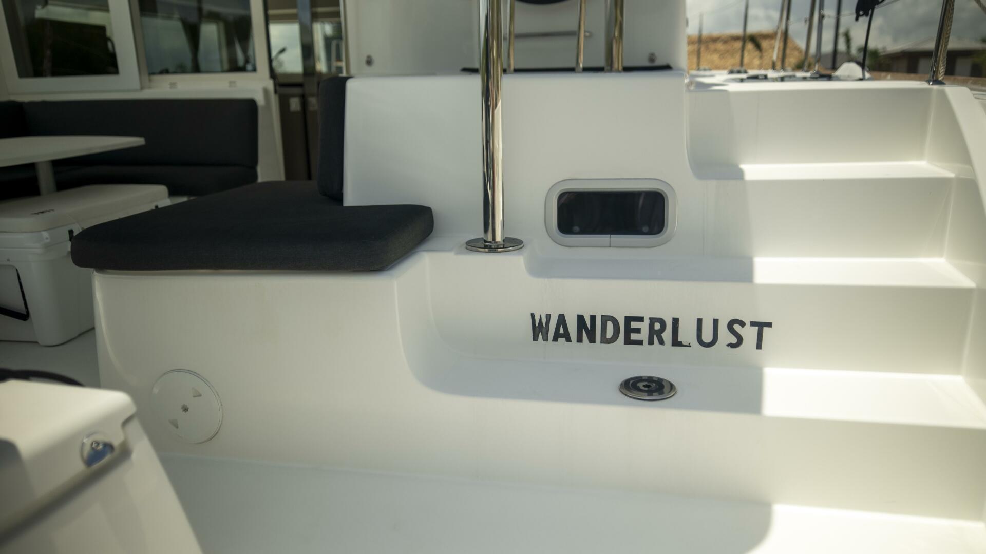 Exterior features: Wanderlust is fitted with durable exterior PVC cushions, stainless steel davits with manual winch, boarding ladder, outboard engine bracket, twin wooden pulpit seats, a remote for the electric windlass at the bow (with secondary controls at the helm), and a deckwash pump for either fresh or saltwater.