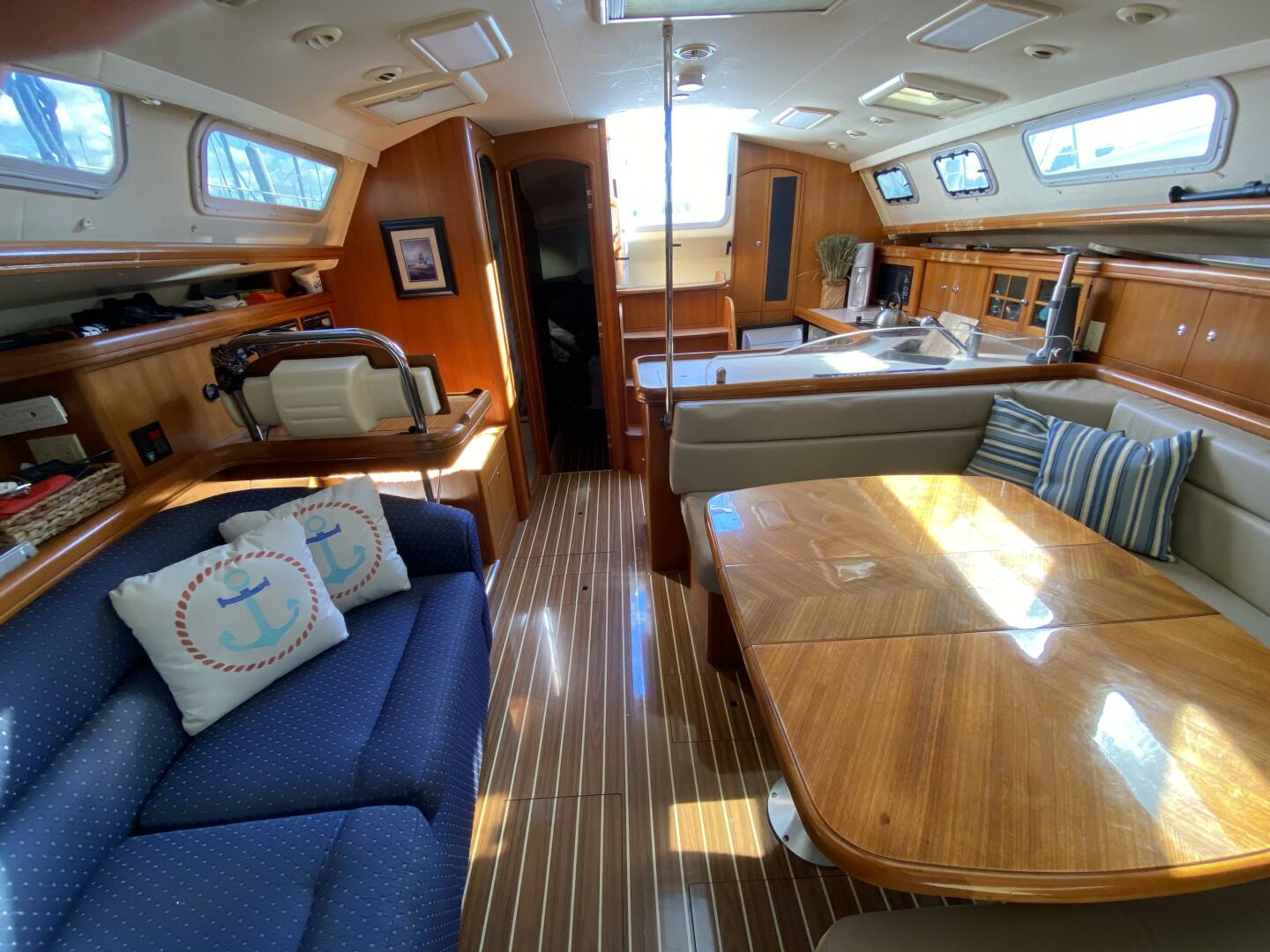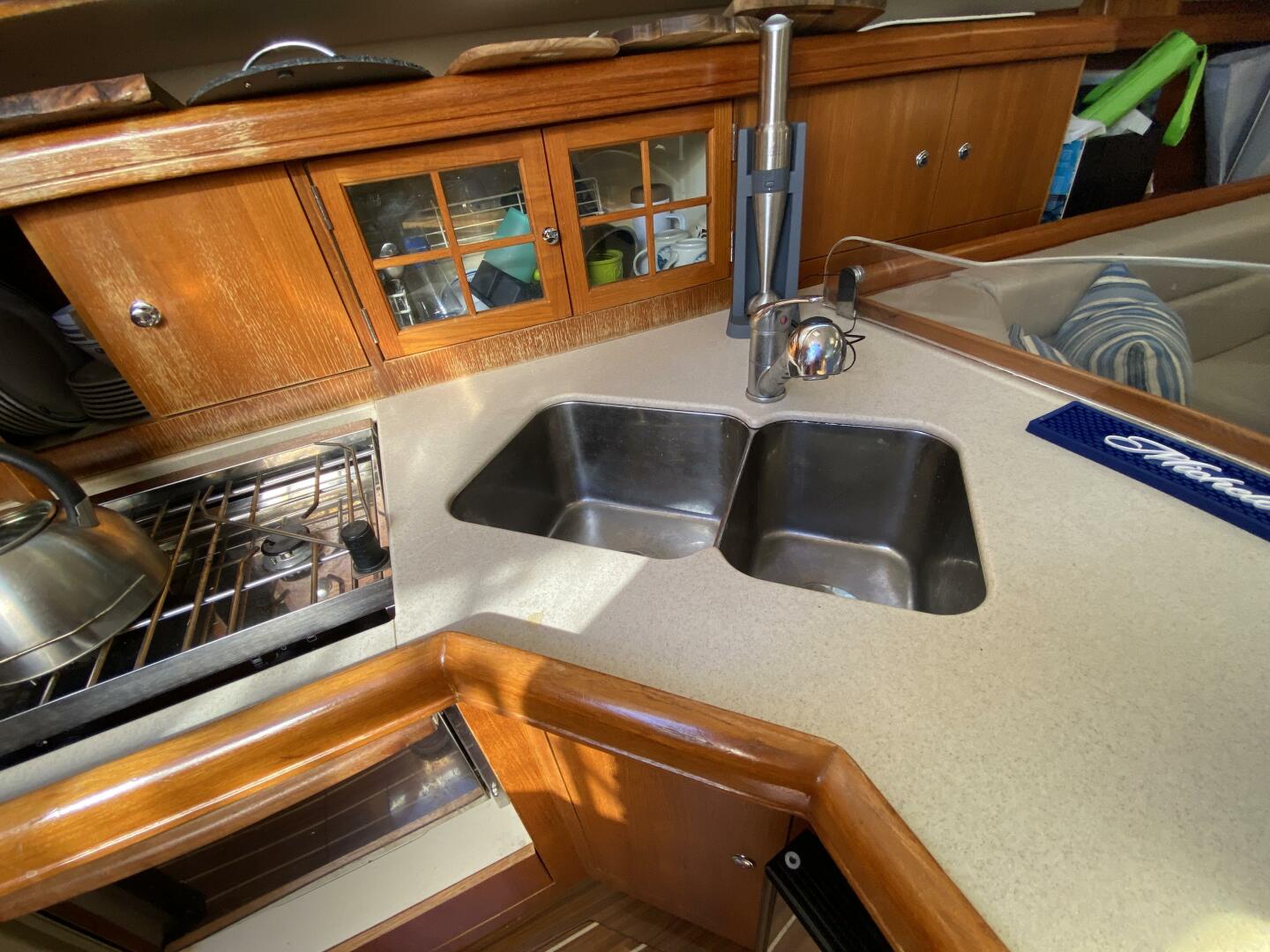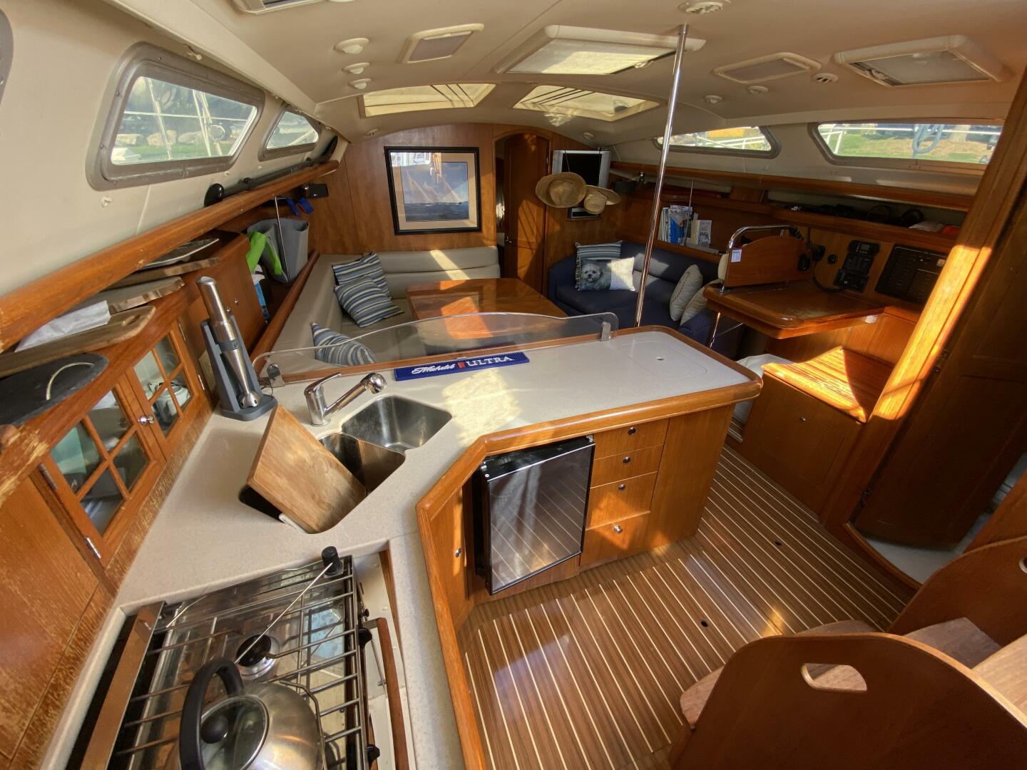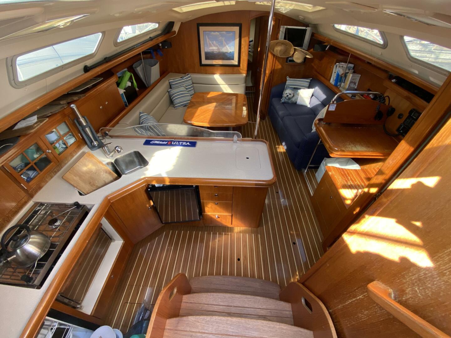 The moment you enter the bright, open salon, you're greeted by warm wood finishes, luxurious upholstery, and a flood of natural light. The galley is built for real cooking – with Corian countertops, a generous fridge/freezer, and ample storage – perfect for nights at anchor and meals that taste like home. Two private cabins (each with its own head and shower) offer true privacy and comfort for you and your guests.