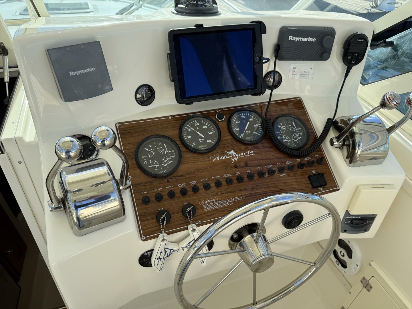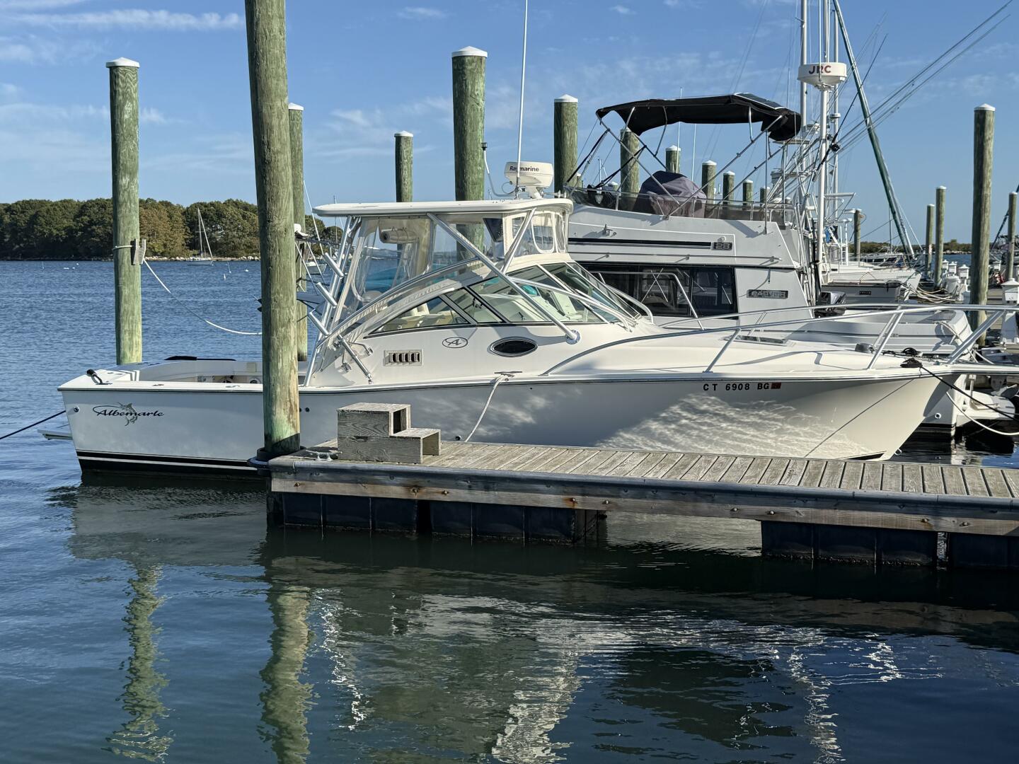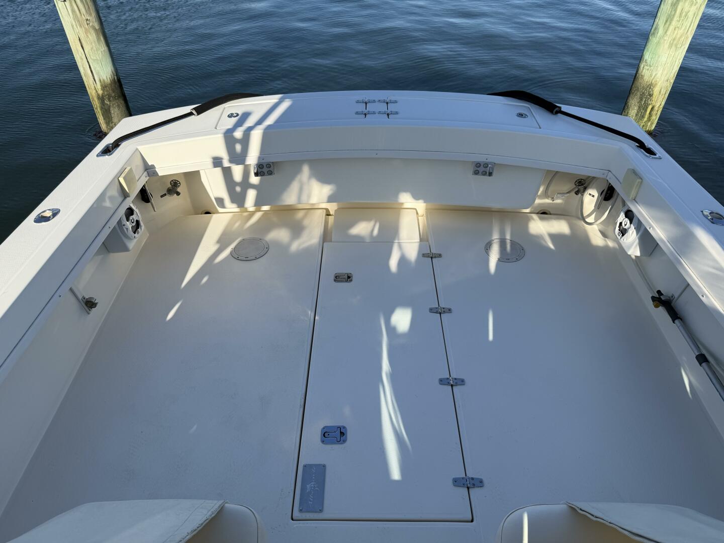 This is an exceptional example of one of the best looking express fishing boats ever built. The owner made some excellent custom upgrades that look like they were installed by the factory, and are probably the way Albemarle should have designed the boat. The most significant are the custom fiberglass captain and mate helm seat consoles with matching aft-facing seats for guests. These consoles are easily removed so the owner can store them at home during winters, and to increase engine hatch opening. The same is true for the custom transom seat with added backrest all with matching upholstery.