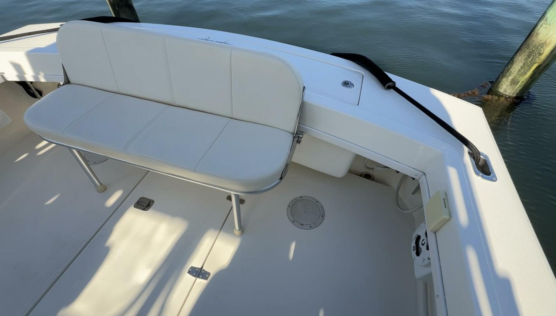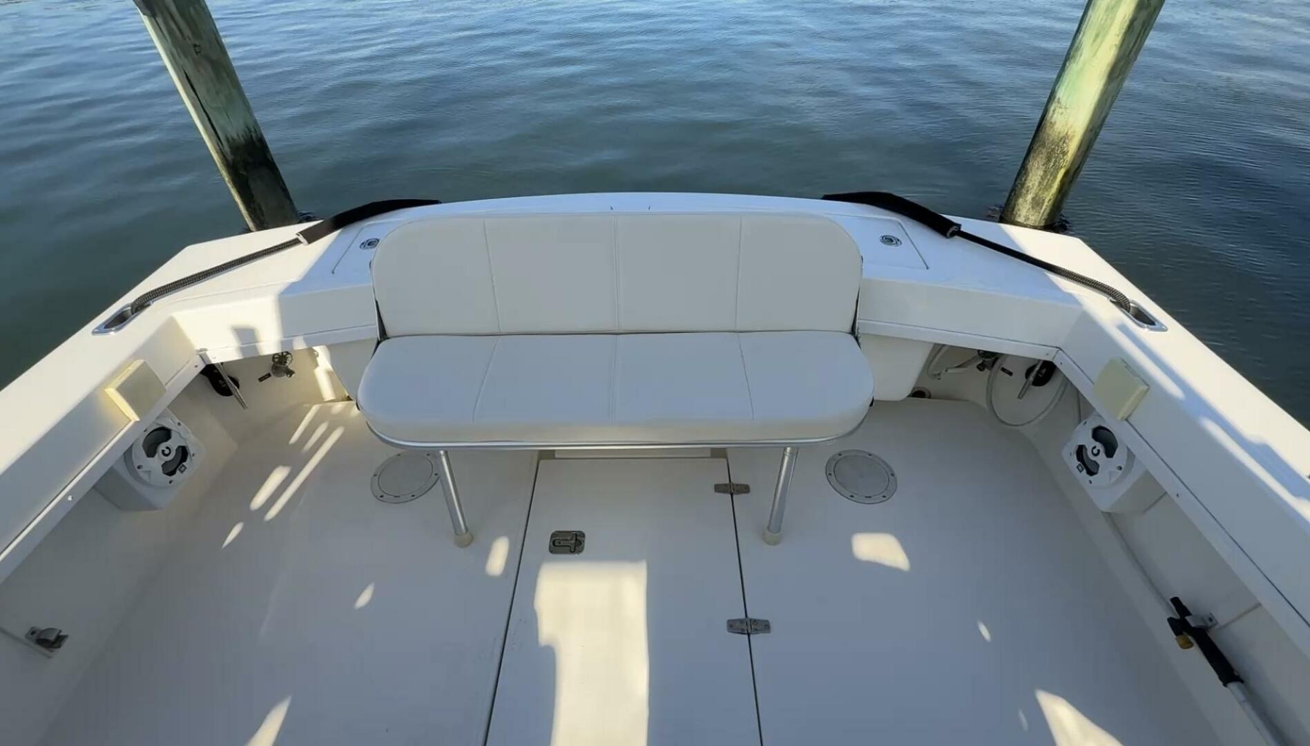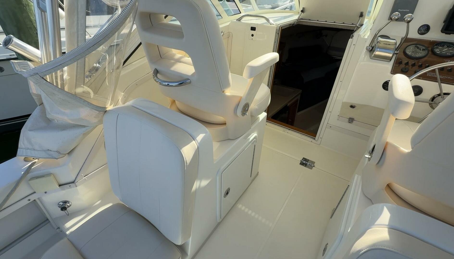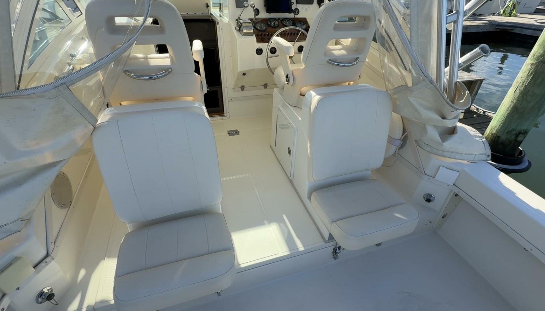 Exceptionally well maintained with some very smart custom upgrades, including custom captain & mate seat consoles with aft facing seats, and custom sternrail seat with backrest in matching upholstery.