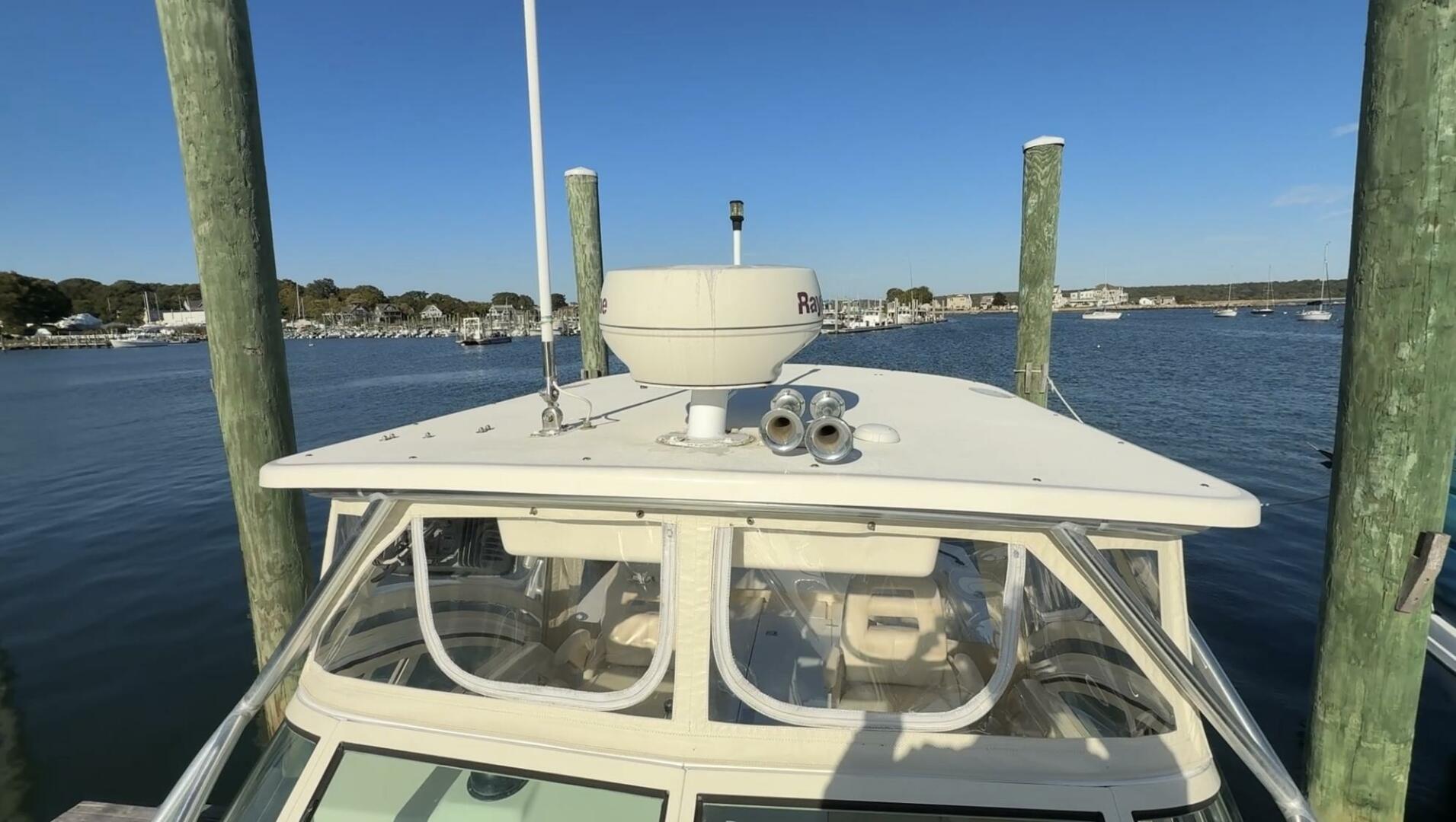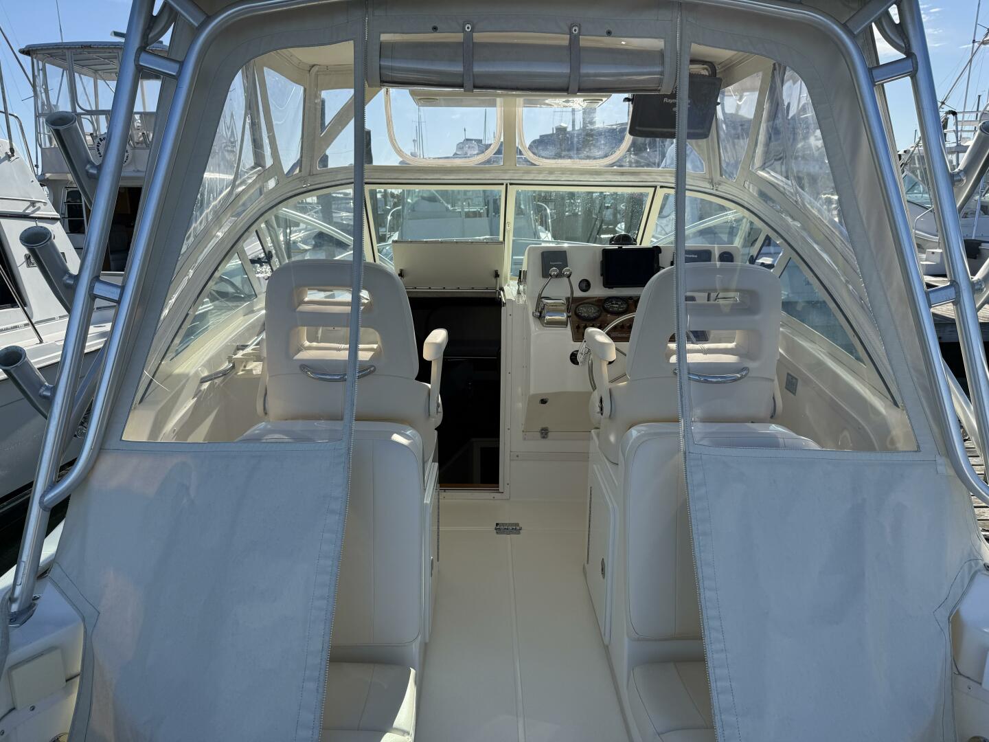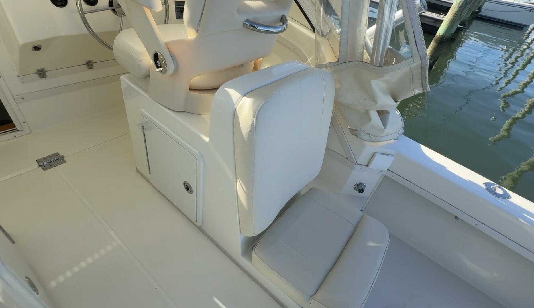 Exceptionally well maintained with some very smart custom upgrades, including custom captain & mate seat consoles with aft facing seats, and custom sternrail seat with backrest in matching upholstery.