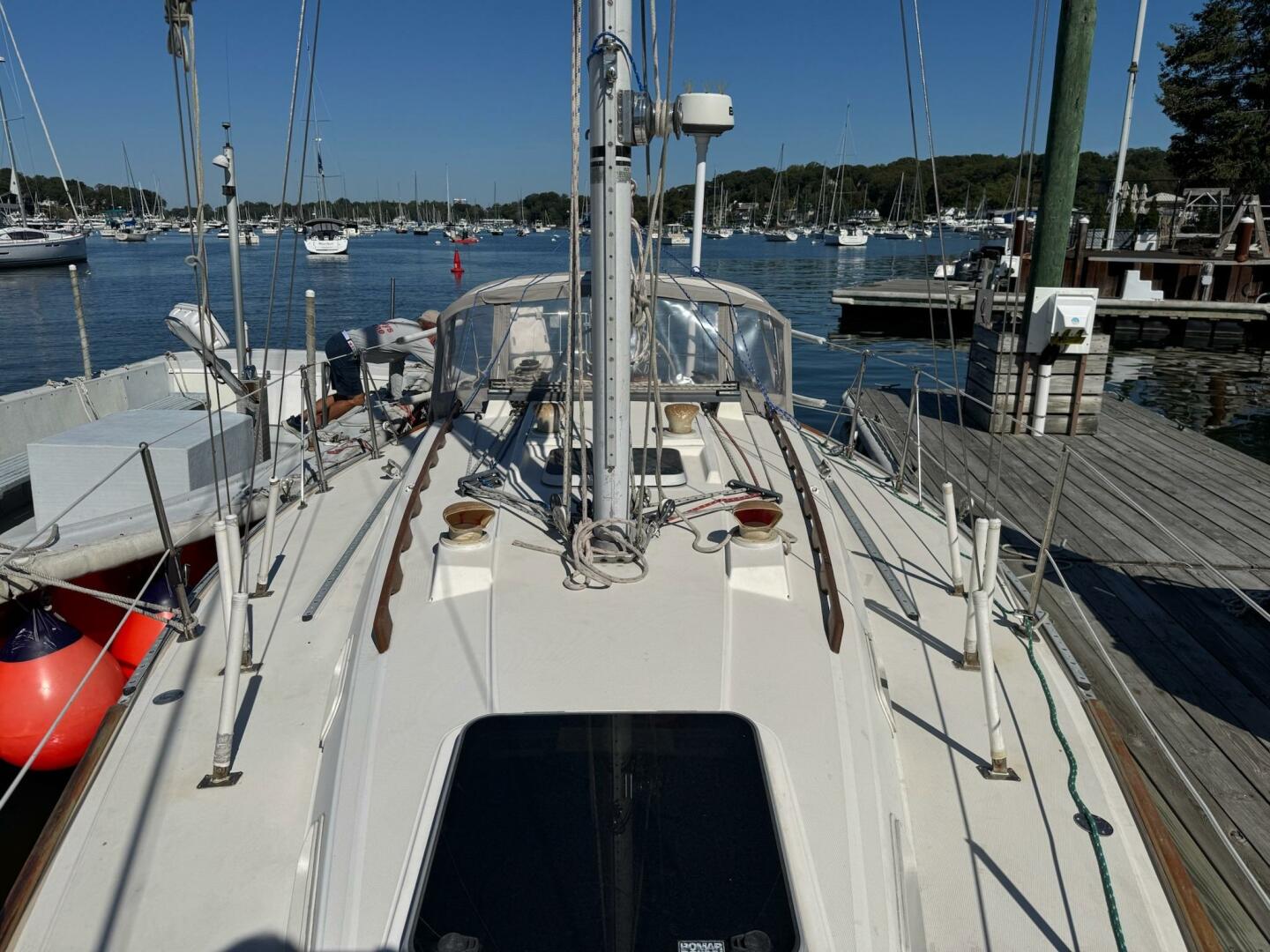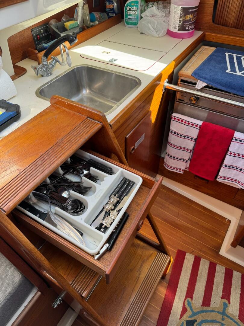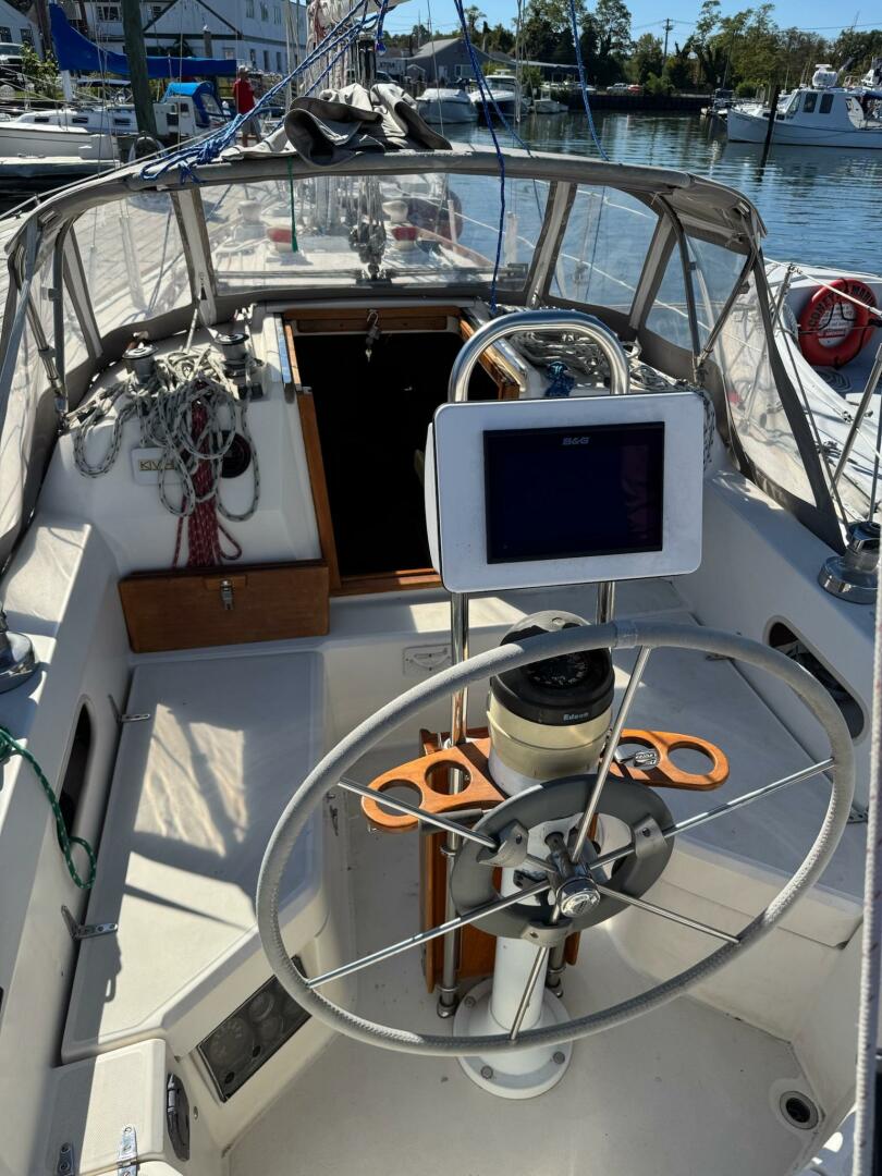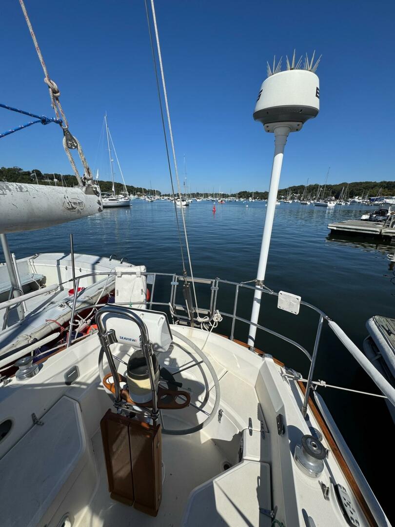 This classic Sabre features a Black Awlgrip hull and beautifully maintained interior with varnished teak and holly floors, teak cabinetry, and updated gray upholstery. A fine example of craftsmanship and care—ready to sail away.