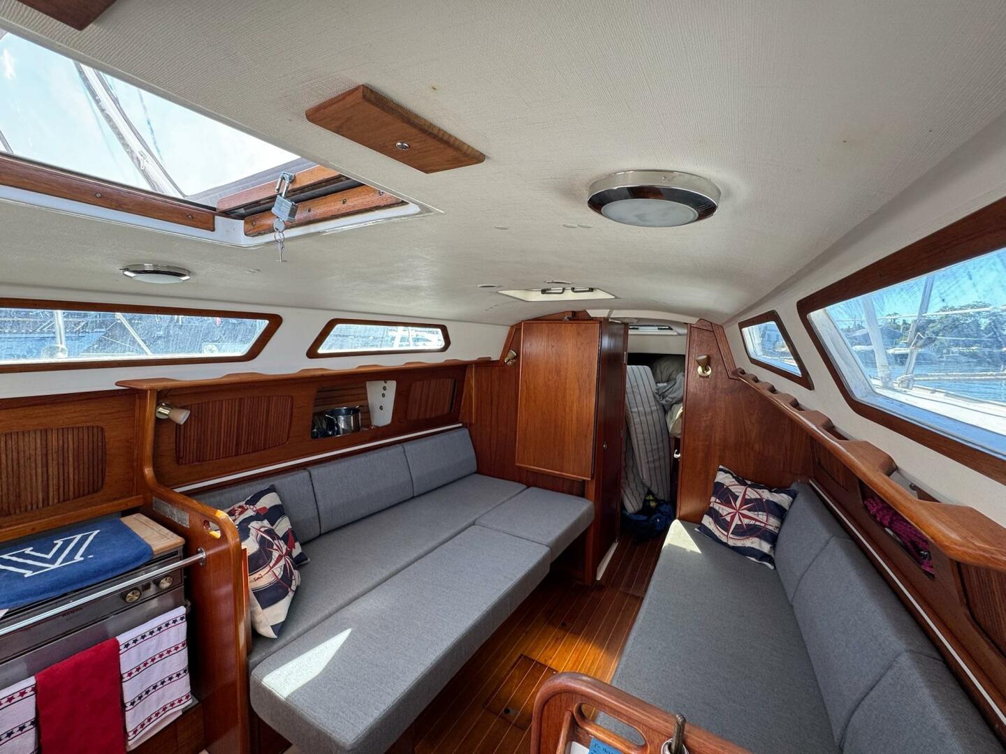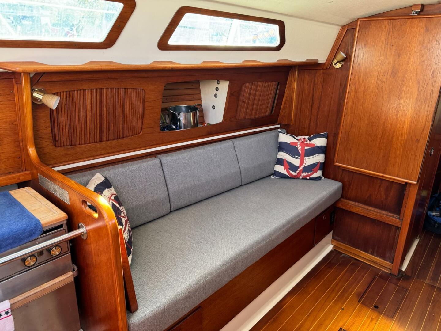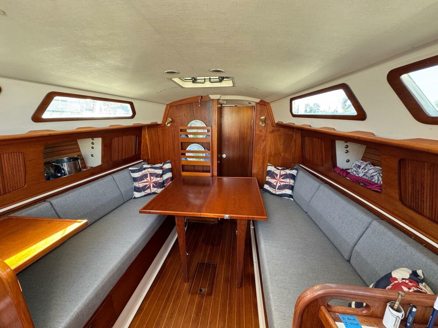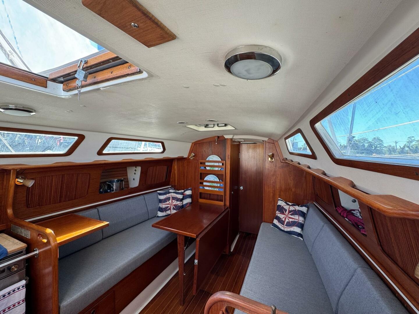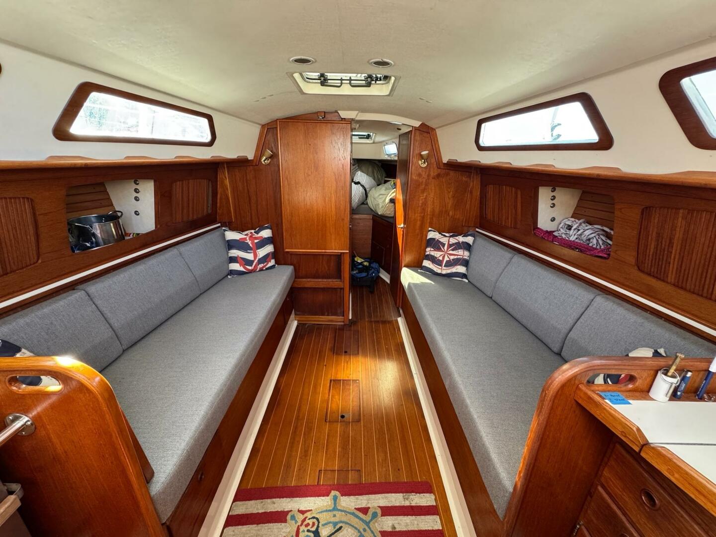 Classic Sabre interior featuring varnished teak and holly flooring, teak cabinetry, and bulkheads, with recently updated gray upholstery. The forward owner’s cabin includes a V-berth with filler cushion and an enclosed head with manual toilet, shower, holding tank, Y-valve, macerator, and hot/cold pressure water. The main salon offers port and starboard settees with a folding teak dining table; the port settee converts to a double berth. Starboard aft is the navigation station. Galley is port aft with two-burner stove and oven, icebox, and stainless-steel sink. Aft quarter berth for a total of 6 comfortable sleeping quarters.