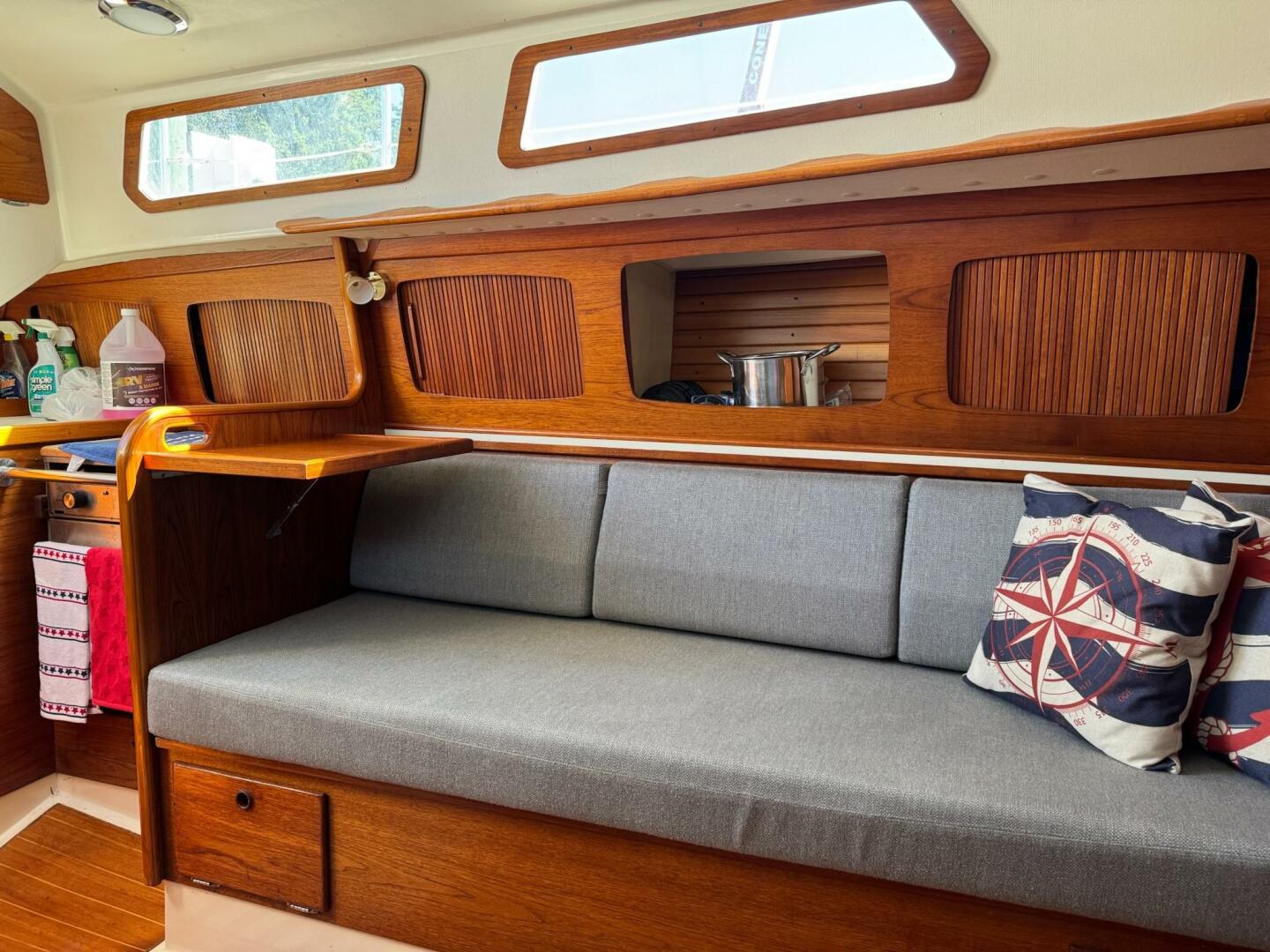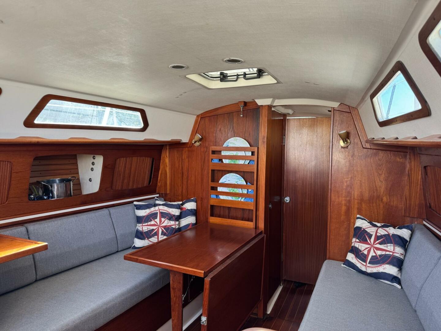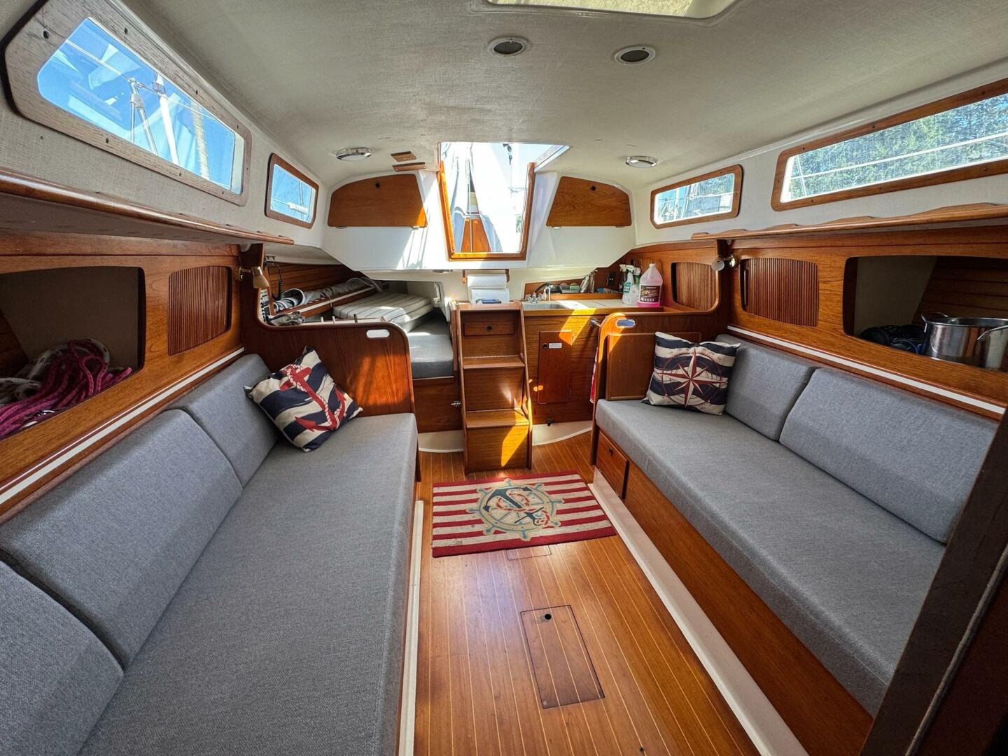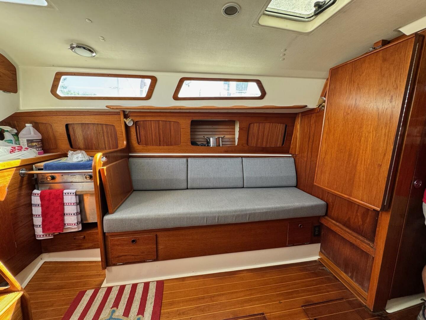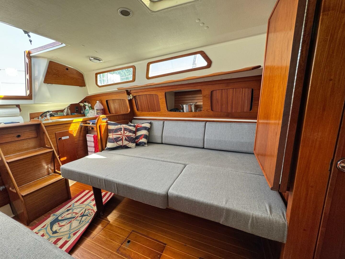 Classic Sabre interior featuring varnished teak and holly flooring, teak cabinetry, and bulkheads, with recently updated gray upholstery. The forward owner’s cabin includes a V-berth with filler cushion and an enclosed head with manual toilet, shower, holding tank, Y-valve, macerator, and hot/cold pressure water. The main salon offers port and starboard settees with a folding teak dining table; the port settee converts to a double berth. Starboard aft is the navigation station. Galley is port aft with two-burner stove and oven, icebox, and stainless-steel sink. Aft quarter berth for a total of 6 comfortable sleeping quarters.