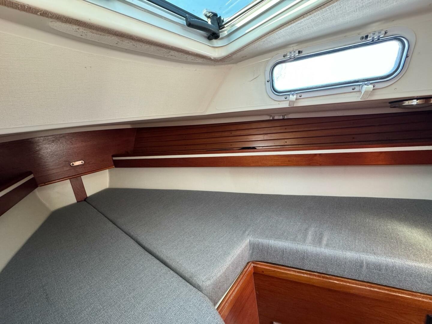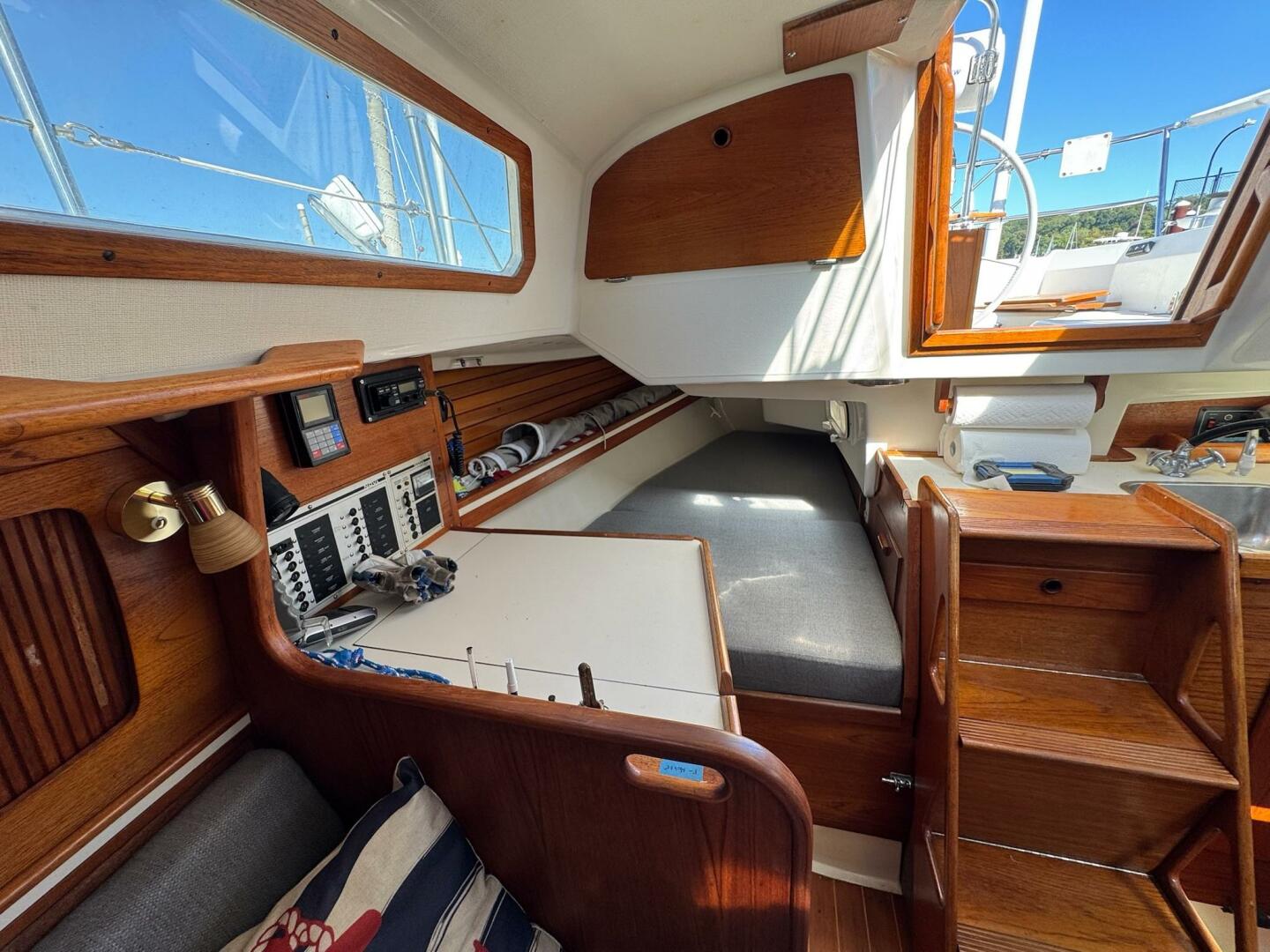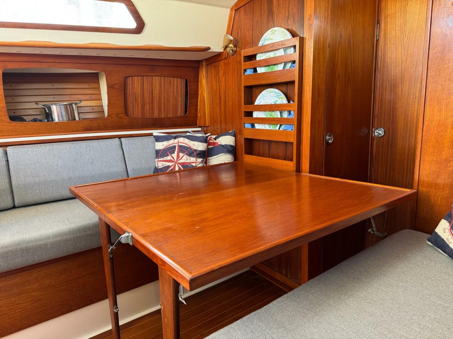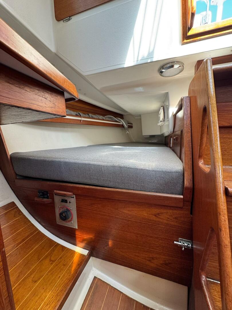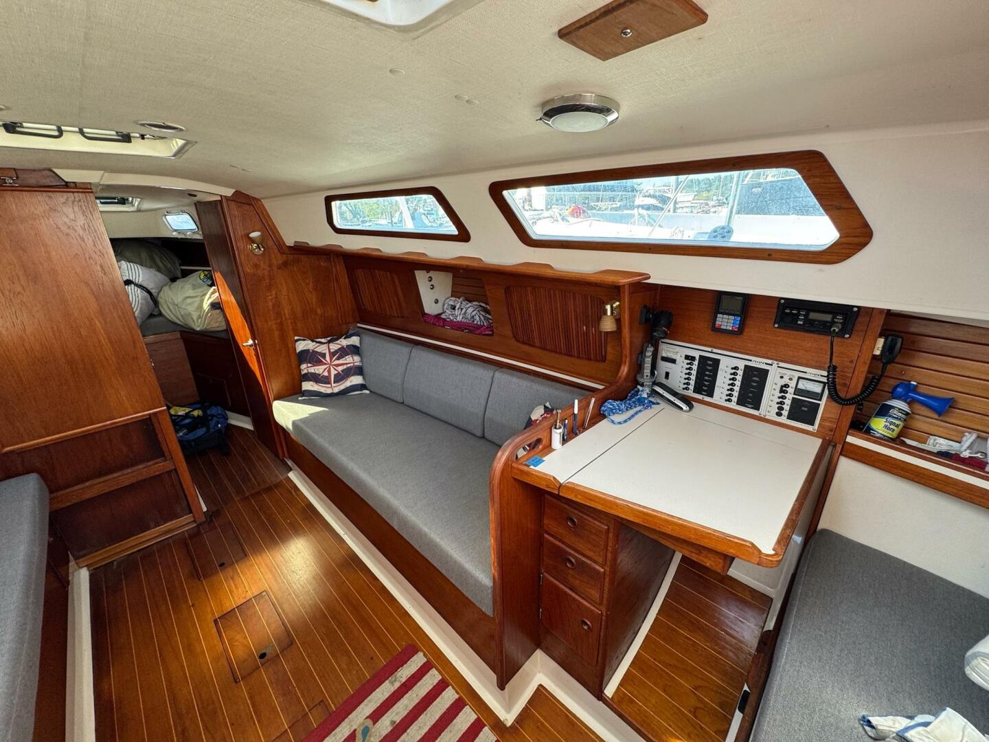 Classic Sabre interior featuring varnished teak and holly flooring, teak cabinetry, and bulkheads, with recently updated gray upholstery. The forward owner’s cabin includes a V-berth with filler cushion and an enclosed head with manual toilet, shower, holding tank, Y-valve, macerator, and hot/cold pressure water. The main salon offers port and starboard settees with a folding teak dining table; the port settee converts to a double berth. Starboard aft is the navigation station. Galley is port aft with two-burner stove and oven, icebox, and stainless-steel sink. Aft quarter berth for a total of 6 comfortable sleeping quarters.
