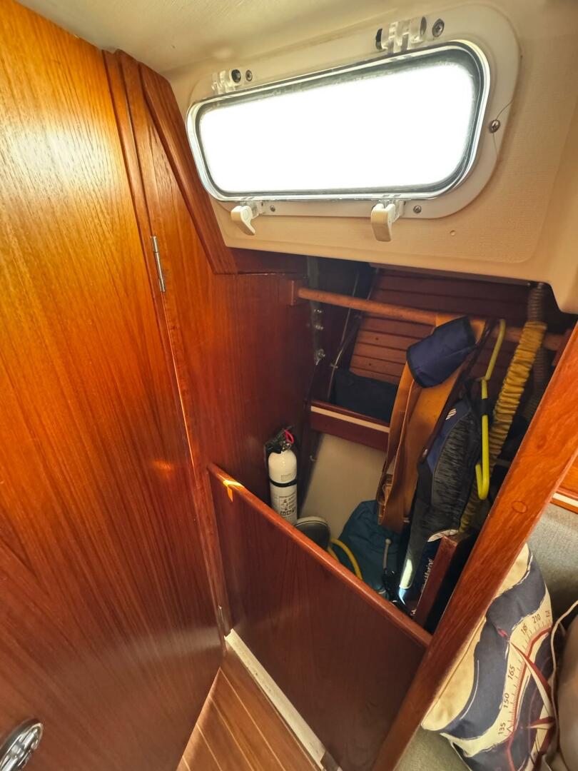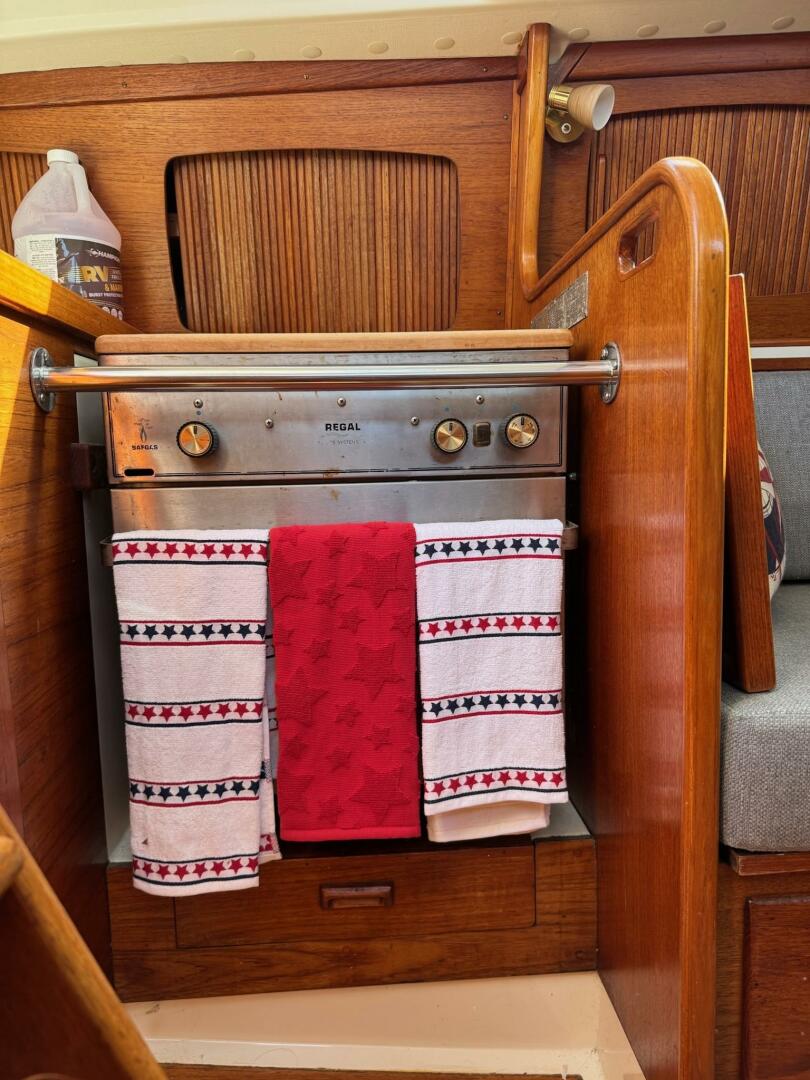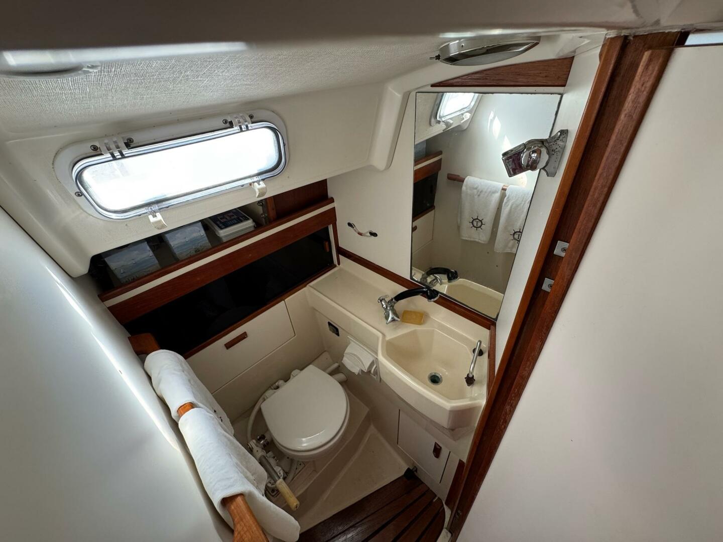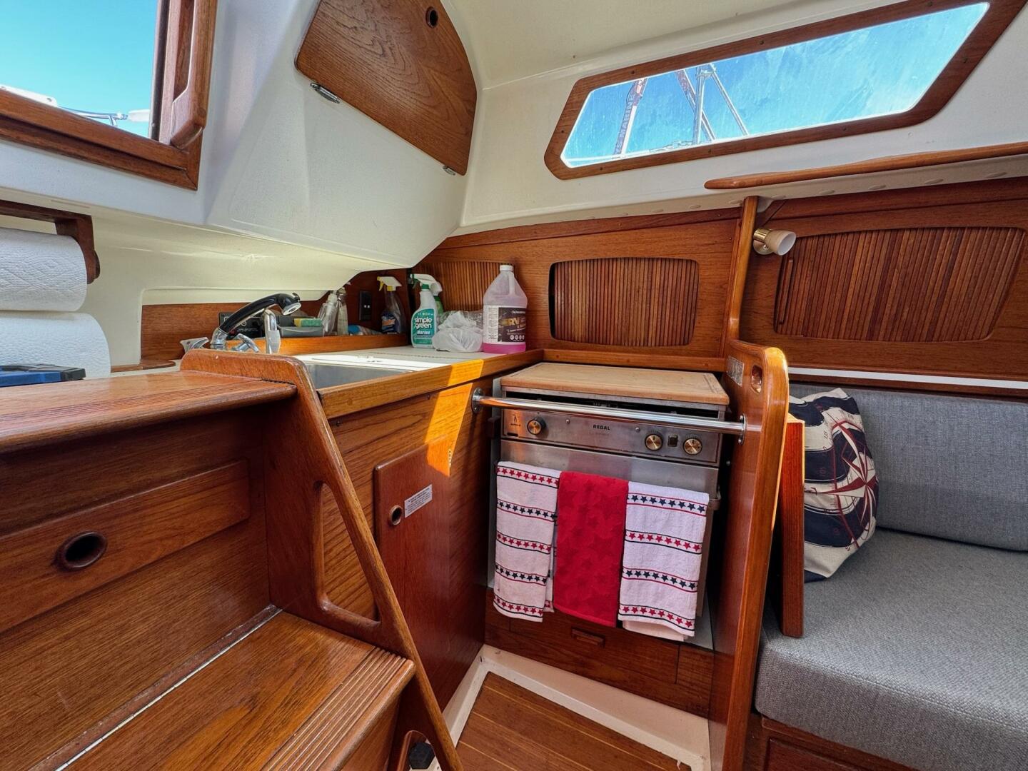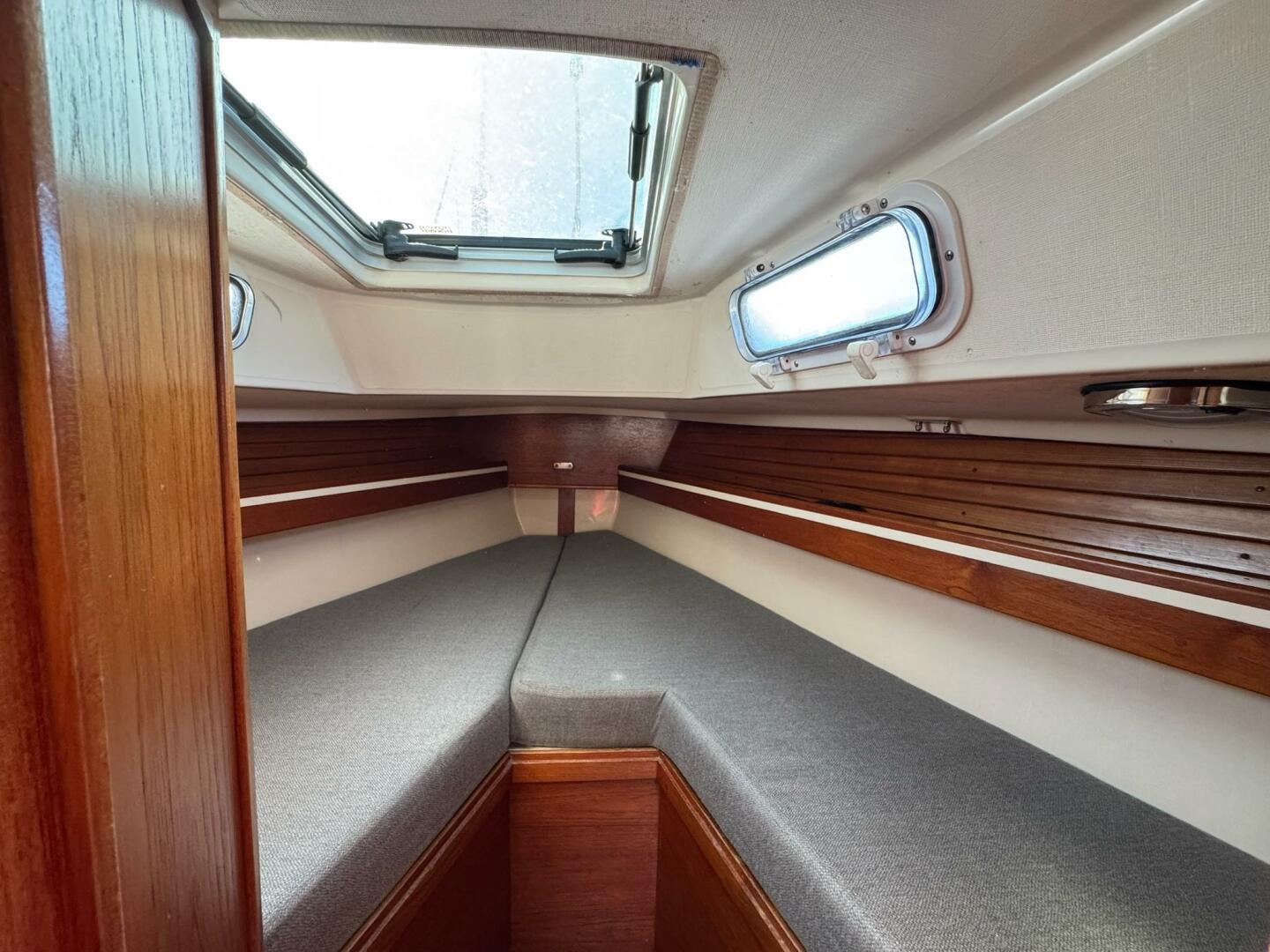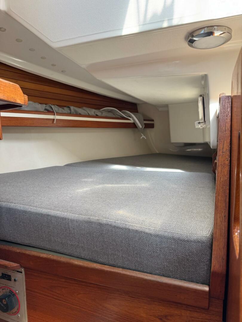 Classic Sabre interior featuring varnished teak and holly flooring, teak cabinetry, and bulkheads, with recently updated gray upholstery. The forward owner’s cabin includes a V-berth with filler cushion and an enclosed head with manual toilet, shower, holding tank, Y-valve, macerator, and hot/cold pressure water. The main salon offers port and starboard settees with a folding teak dining table; the port settee converts to a double berth. Starboard aft is the navigation station. Galley is port aft with two-burner stove and oven, icebox, and stainless-steel sink. Aft quarter berth for a total of 6 comfortable sleeping quarters.