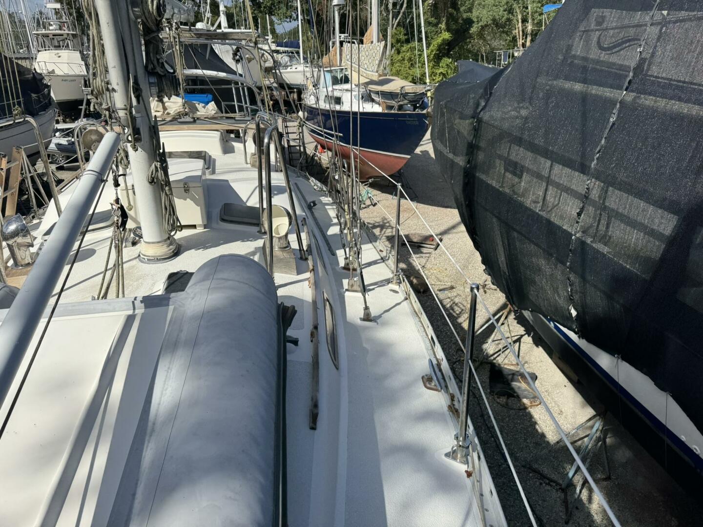 Refitted 1987 Tayana 42 “Passport” bluewater cutter—Vancouver 42 pedigree—with Yanmar diesel, rigging renewals, electrical/solar upgrades, and custom canvas. Offshore‑ready; shown in St. Marys, GA / Fernandina Beach, FL. Priced at $106,000.