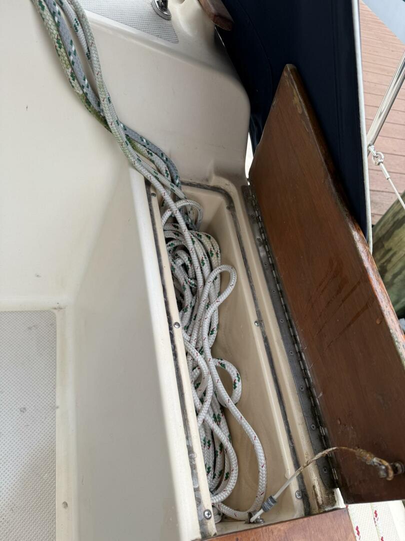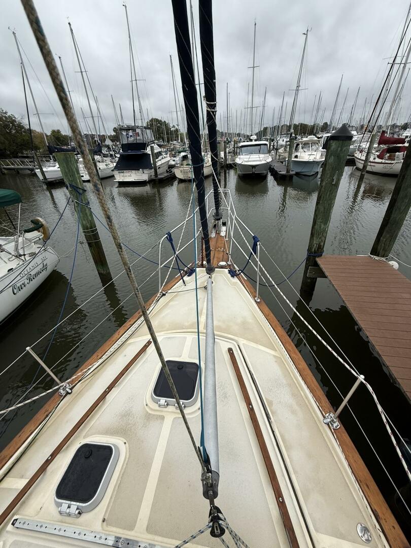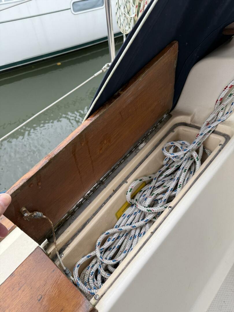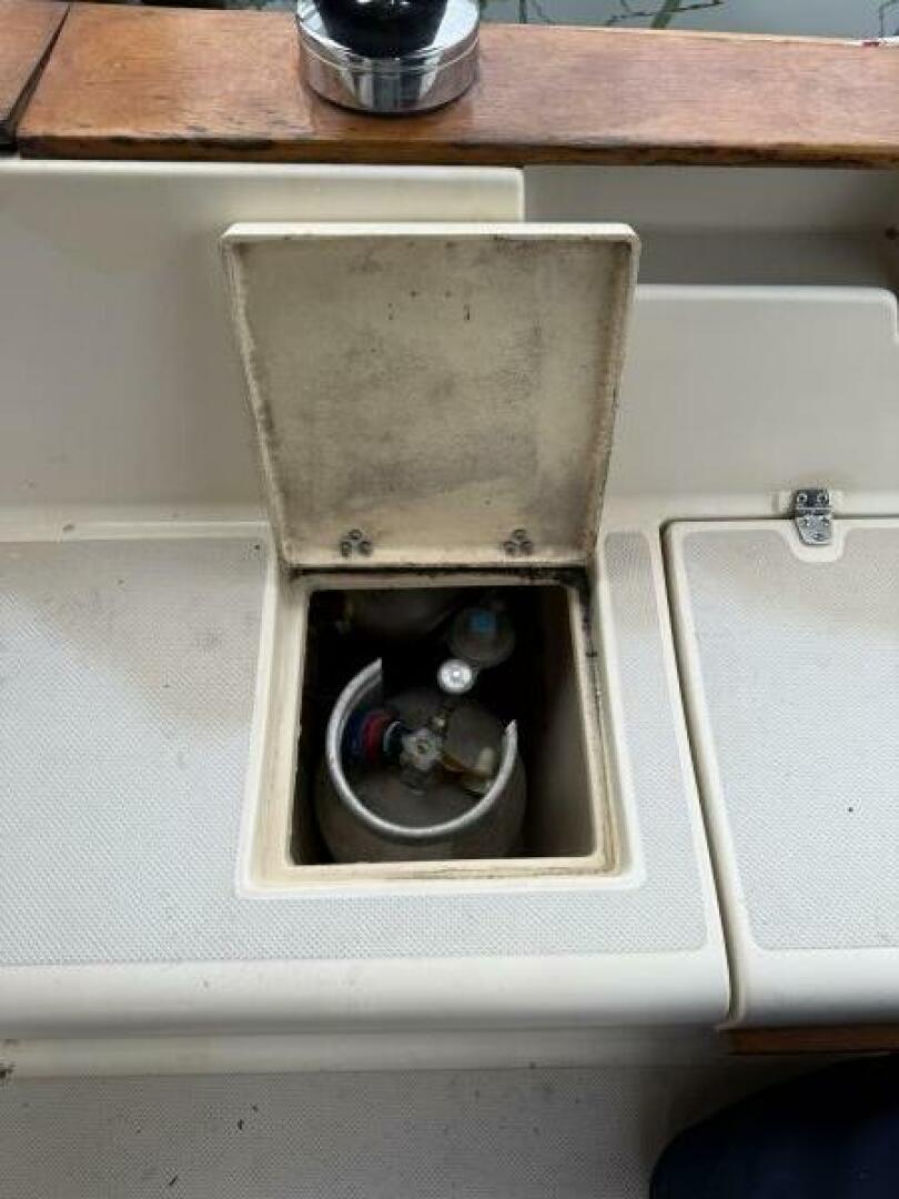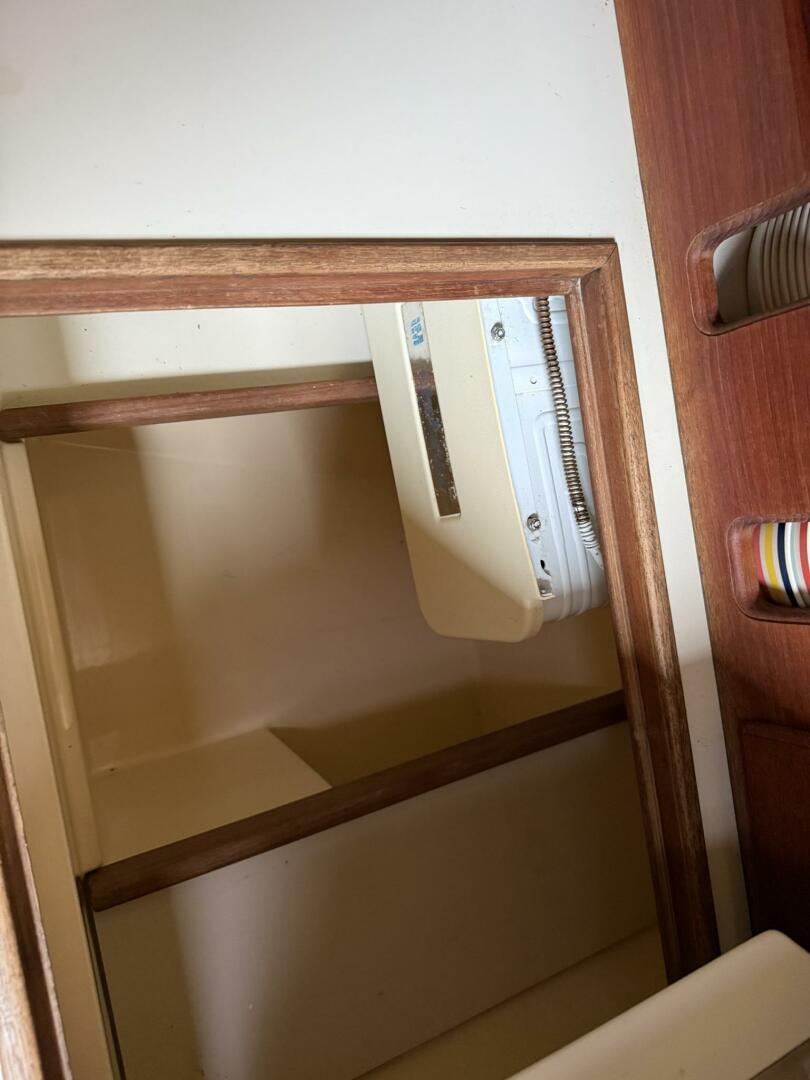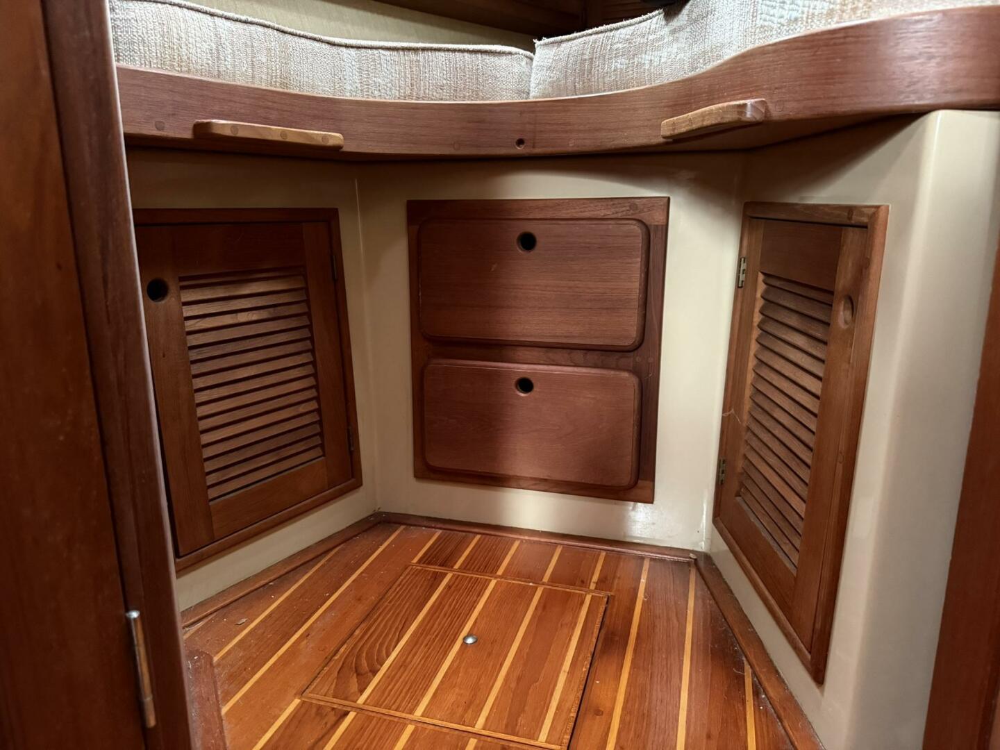 A very comfortable private v-berth is forward with an opening hatch and two opening ports. There is an area for dressing and a hanging locker. There is extra storage under the berth with 2 drawers and 2 cabinets. The head follows aft on port with an opening hatch and port. There is a commode, sink and roomy shower. Main saloon follows aft with a bulkhead mounted table on port side of salon. The settee under the table pulls out to form a double berth. The settee on starboard is long enough for an adult to comfortably nap. A "U"-shaped galley is aft on starboard with excellent storage and workspace, including a large, deep sink, two burner propane stove and ice box. Across on port is the entrance to the quarter-berth where a dropdown nav station desk is located with a hanging locker and a bank of cabinets.